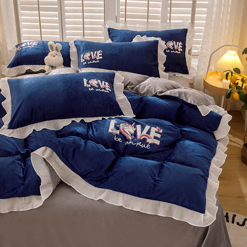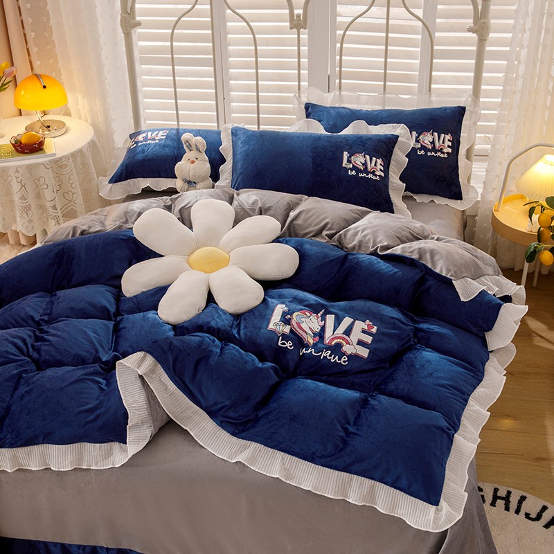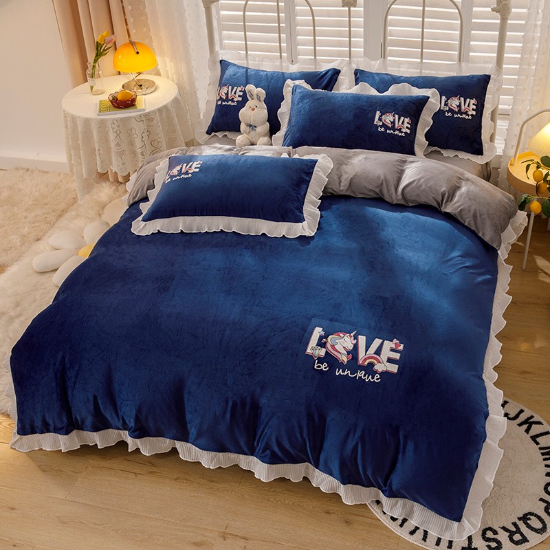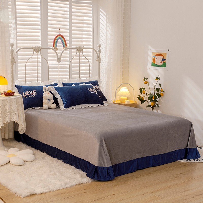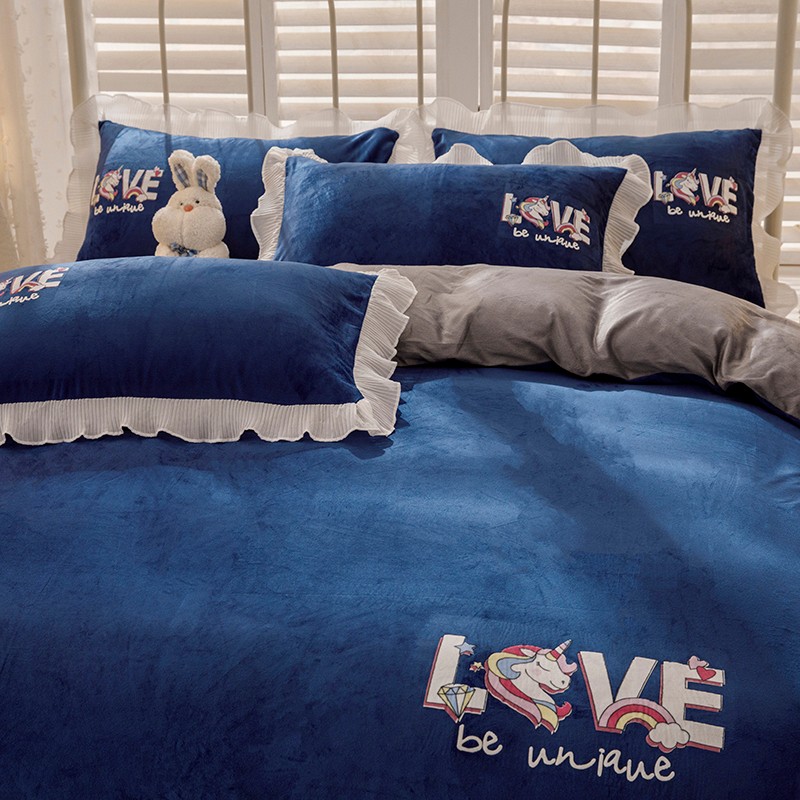 纽缦 新款韩版水晶绒床单四件套法莱水晶牛奶 独角兽宝蓝灰