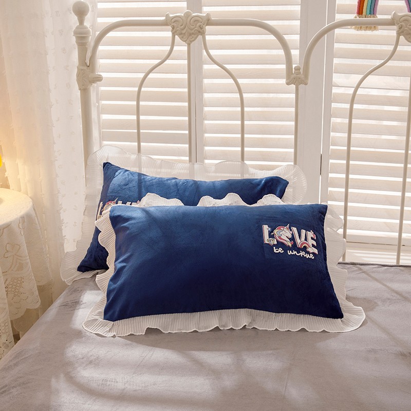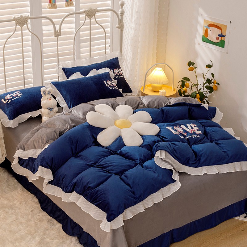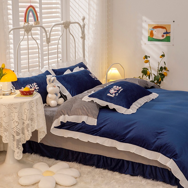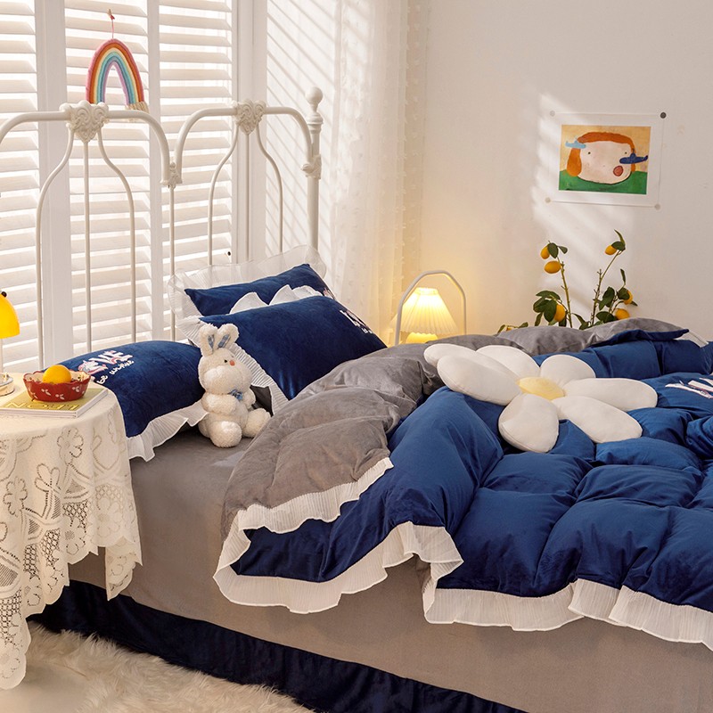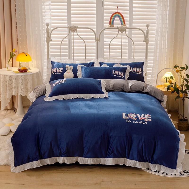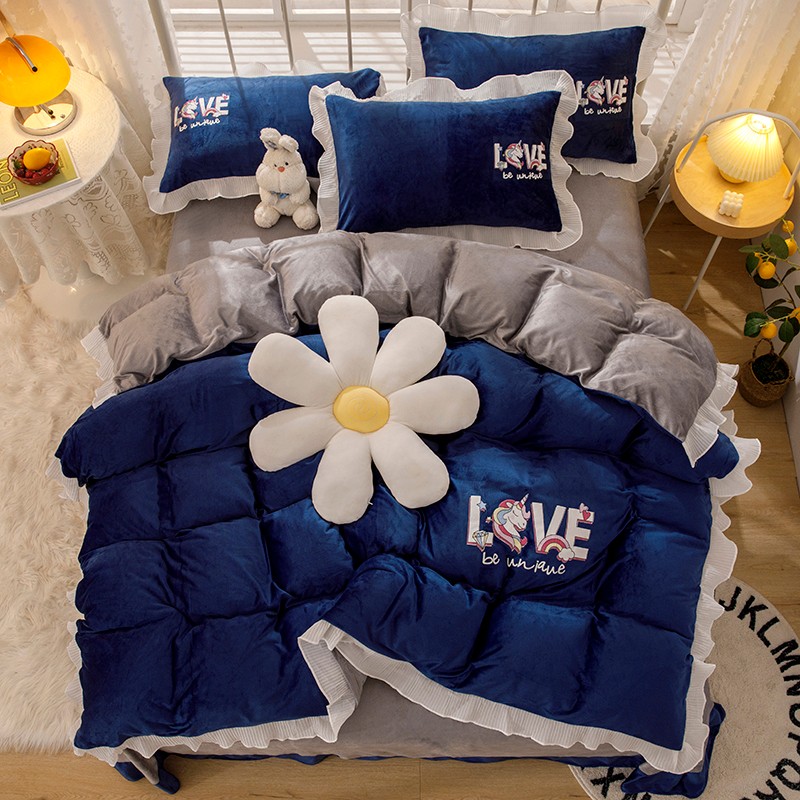 纽缦 新款韩版水晶绒床单四件套法莱水晶牛奶 独角兽宝蓝灰