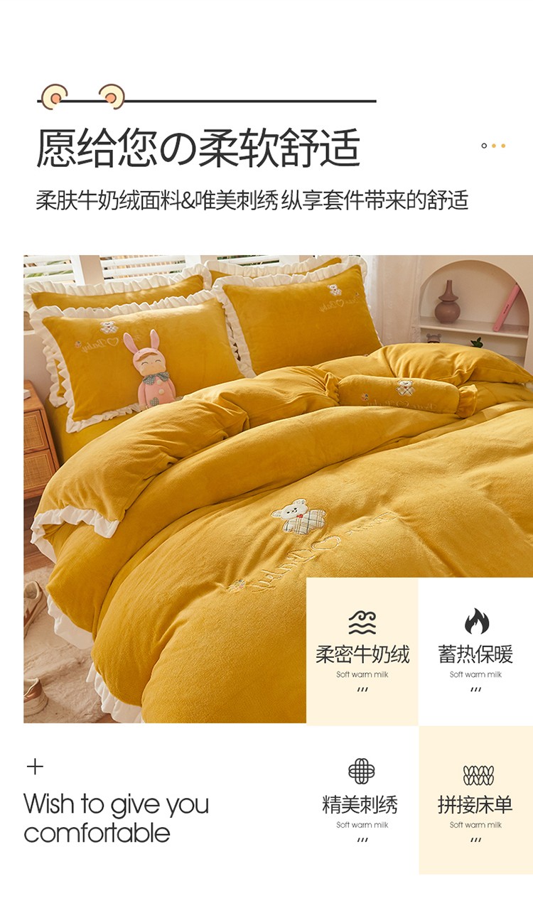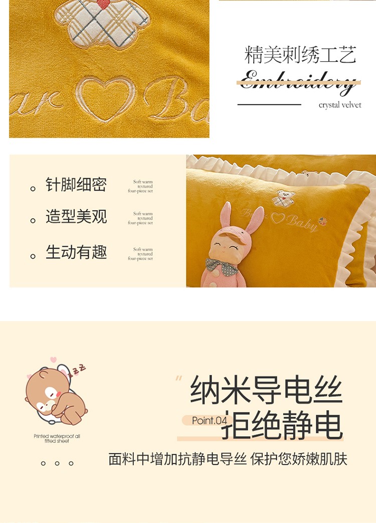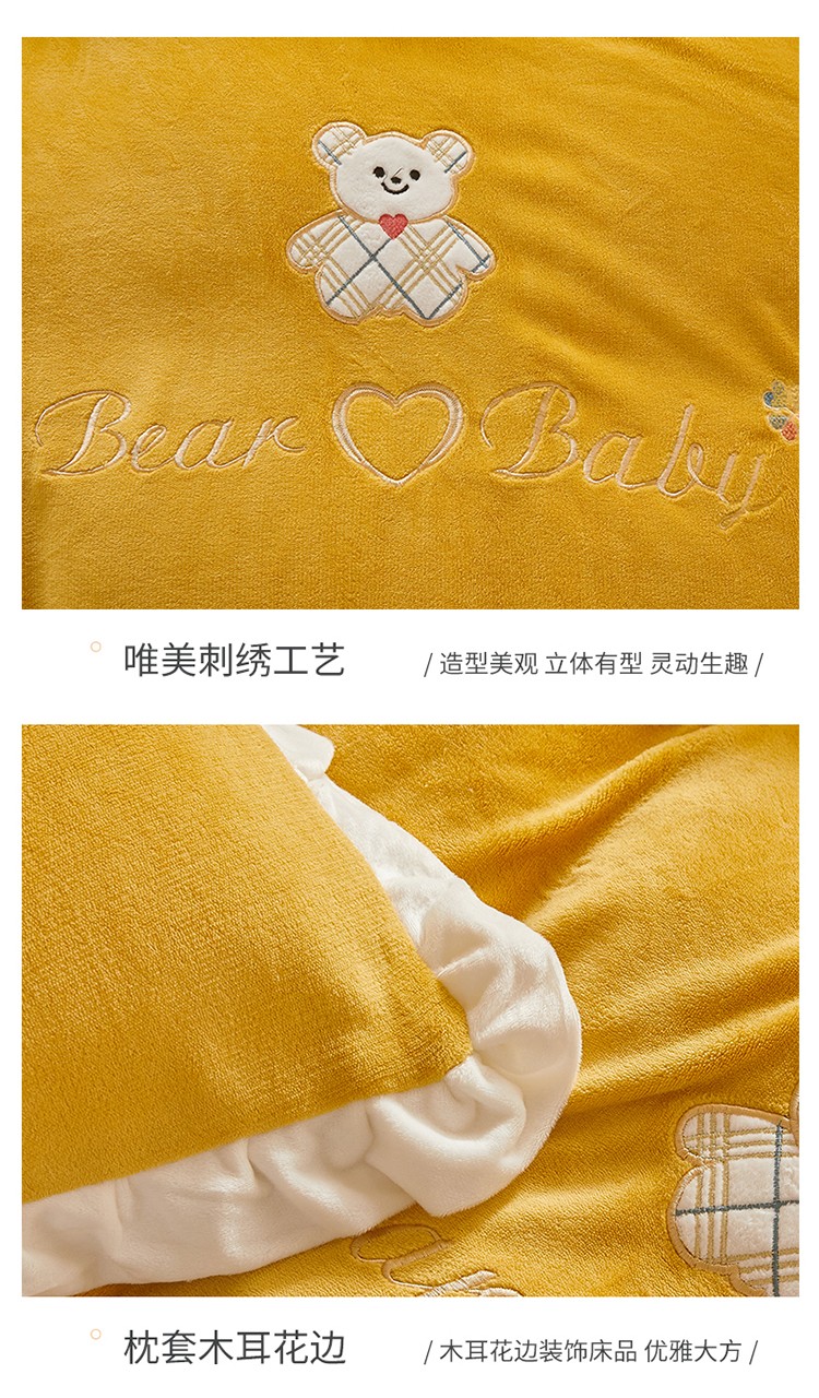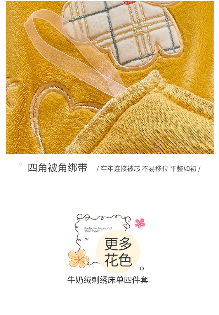 商品名称:宜凡家纺 2021新款牛奶绒绣花熊床单四件套 可爱熊-亮黄