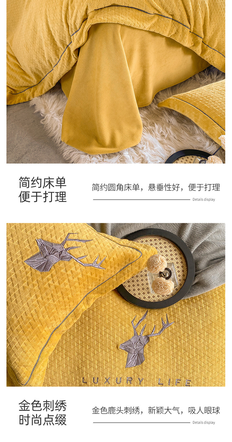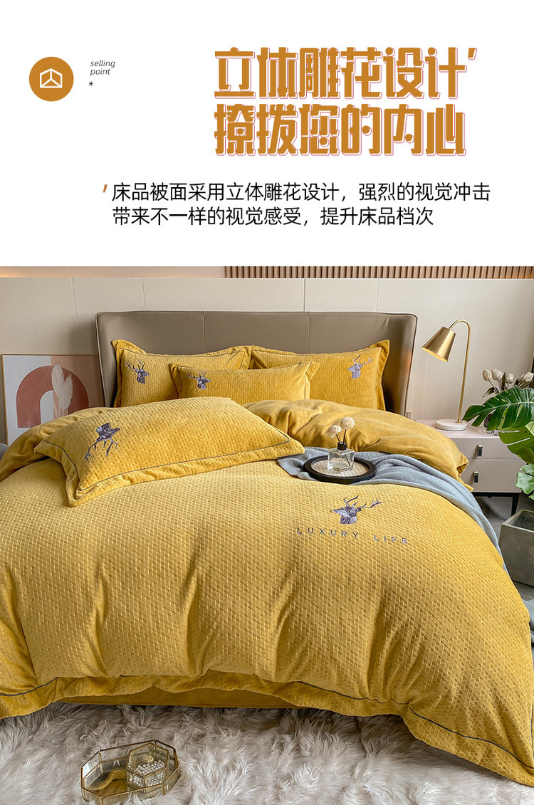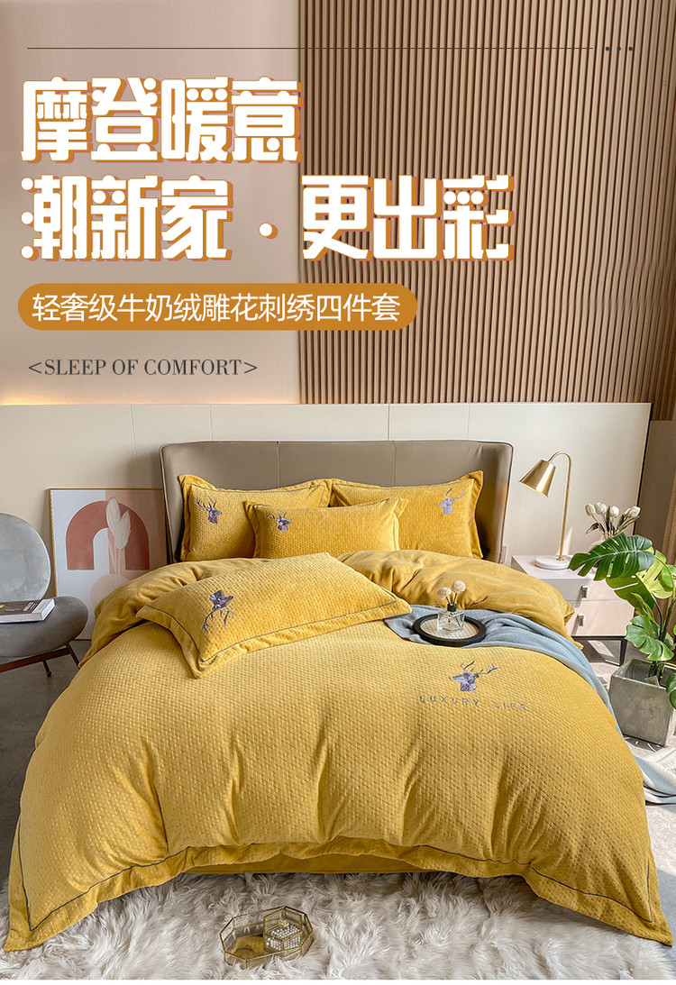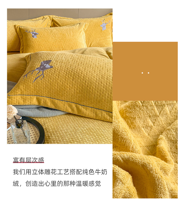 棉生活家纺 2021新款牛奶绒雕花刺绣四件套 野格-黄