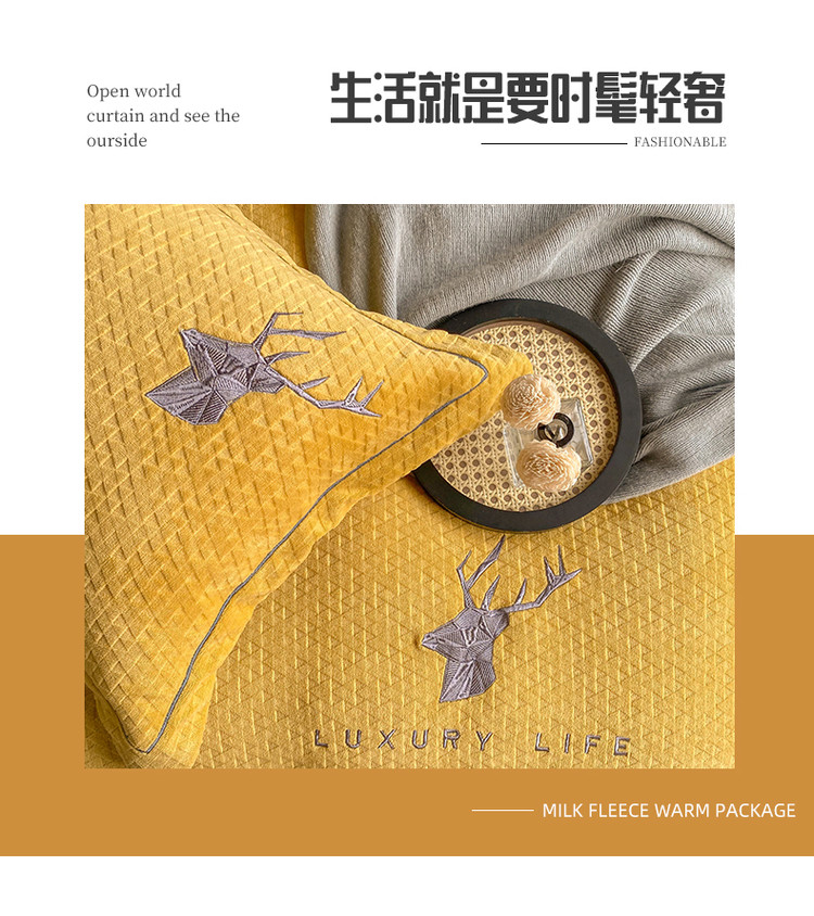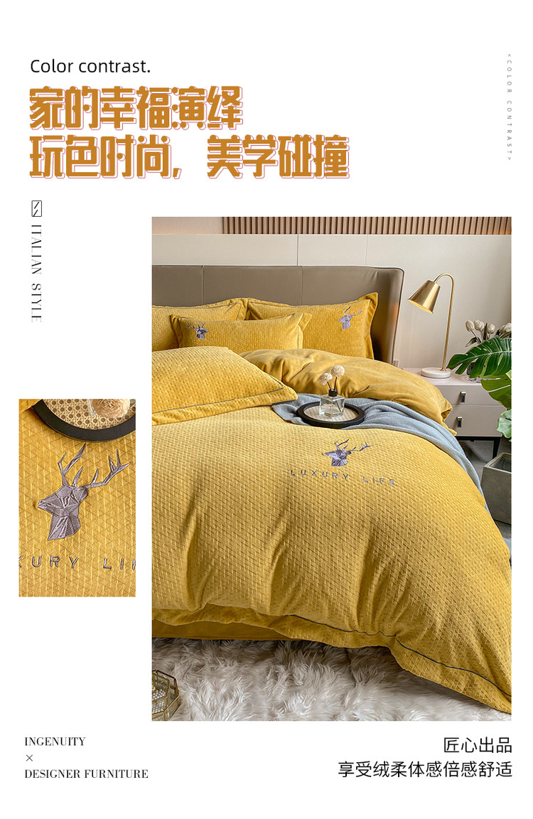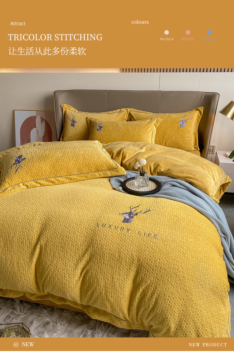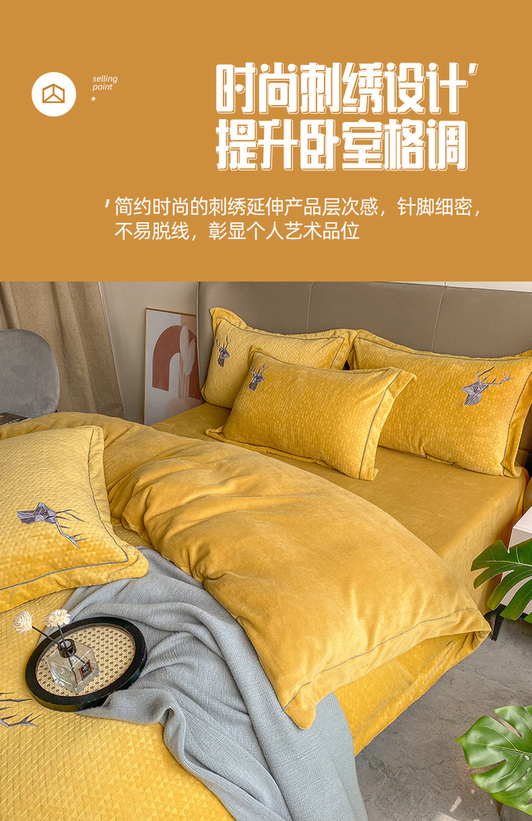 棉生活家纺 2021新款牛奶绒雕花刺绣四件套 野格-黄