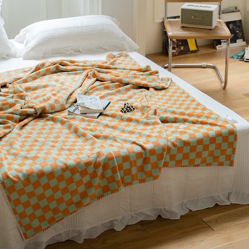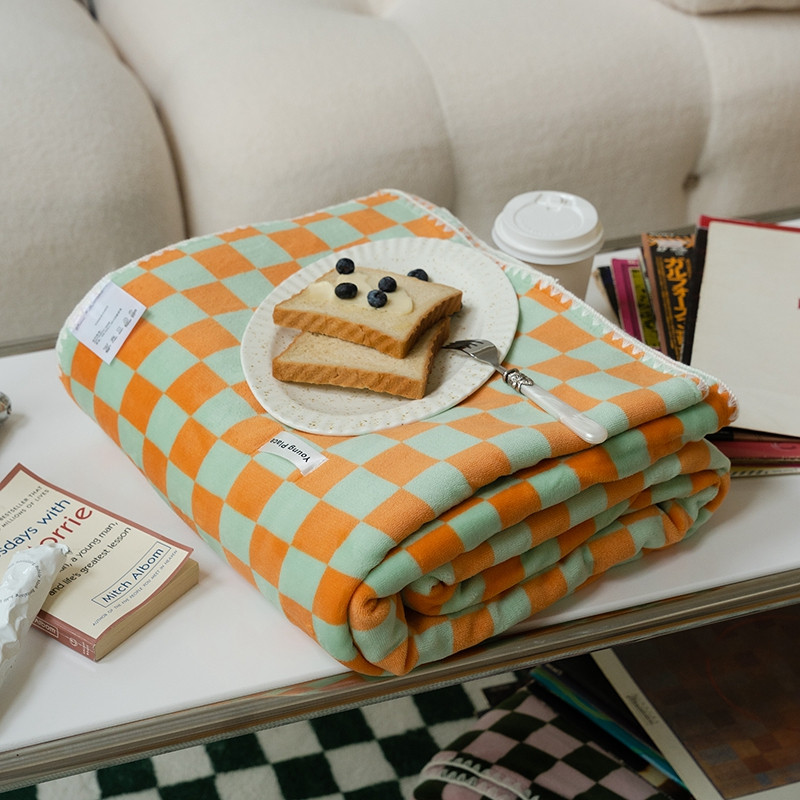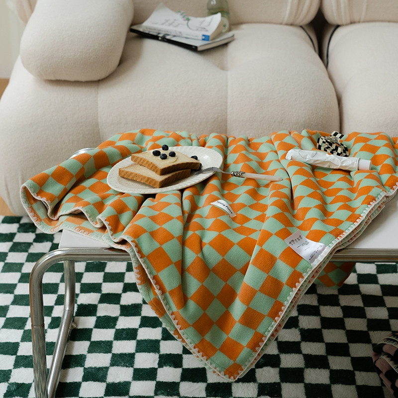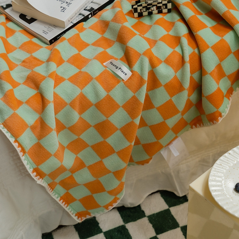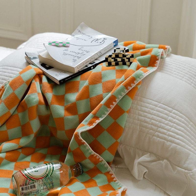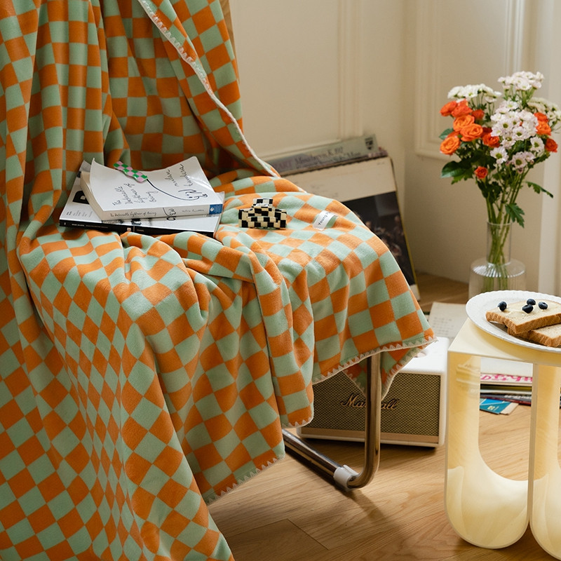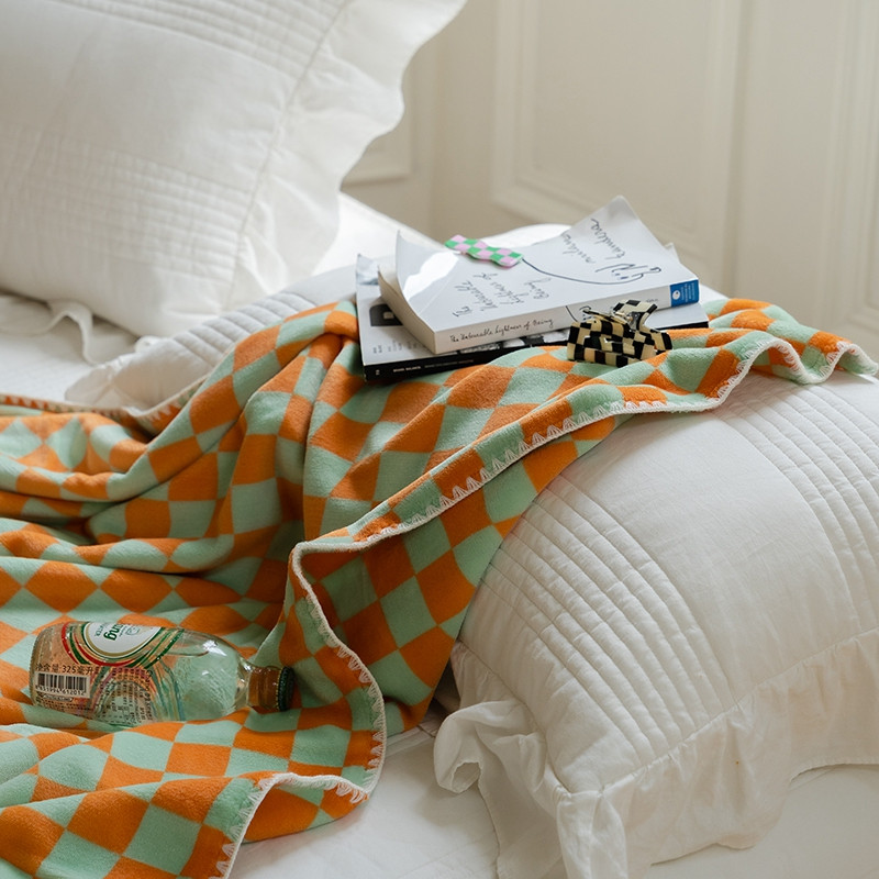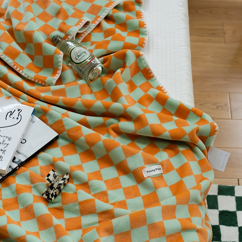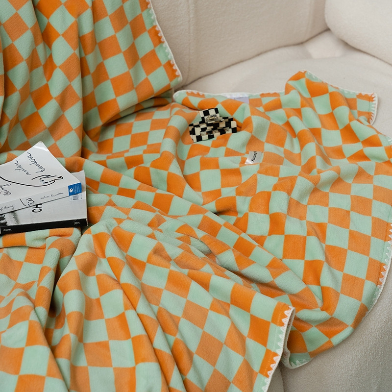 洋铭区 2021冬季新品棋盘格双色牛奶绒毯子 蜜柚橘