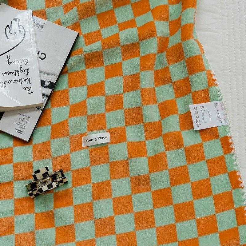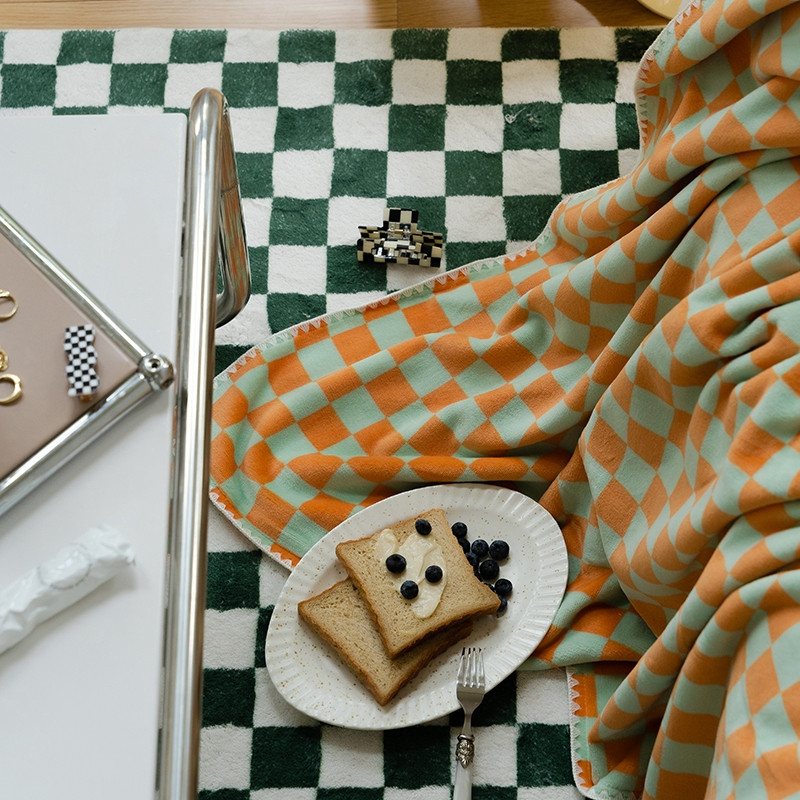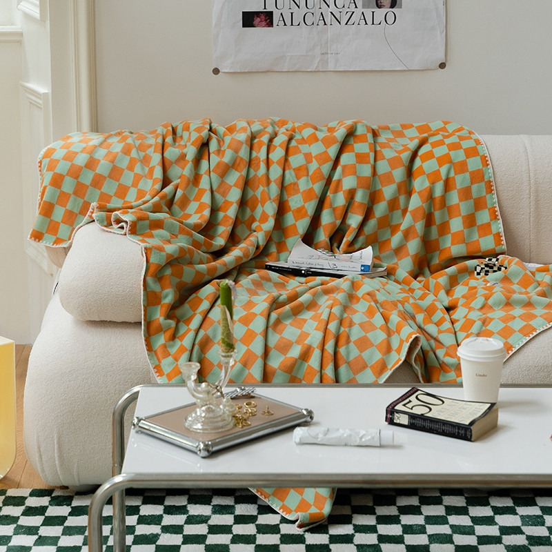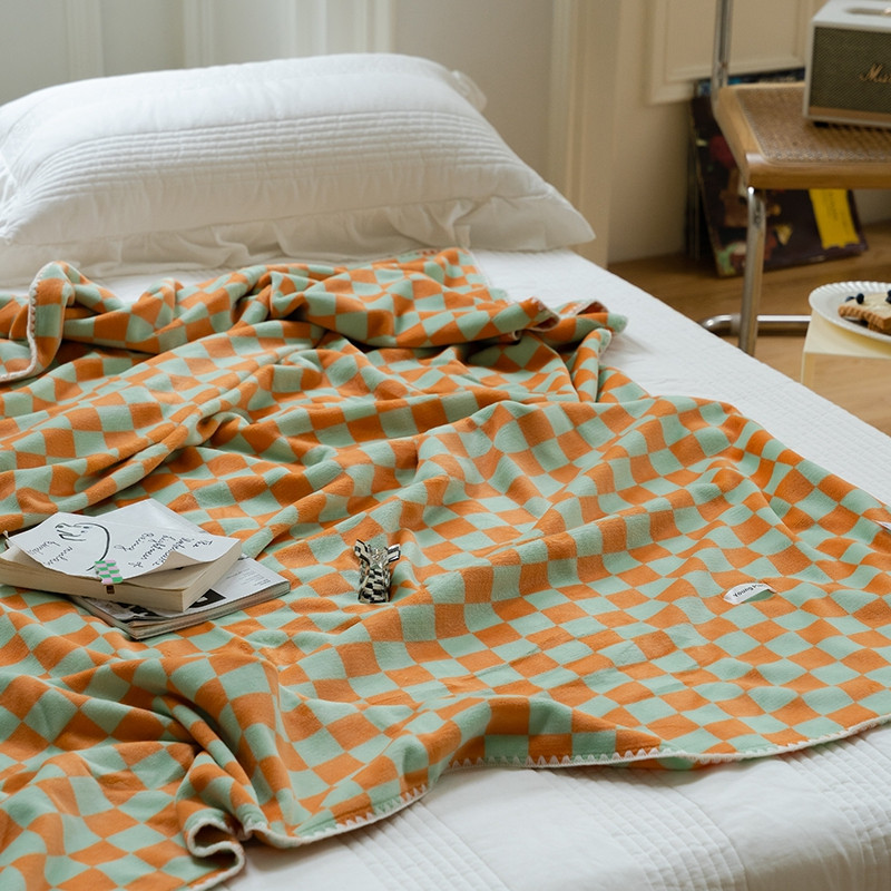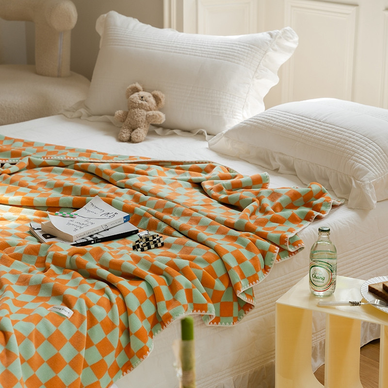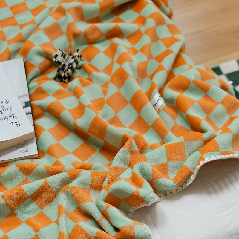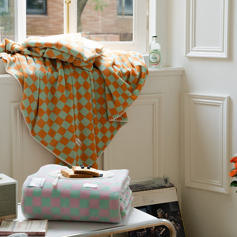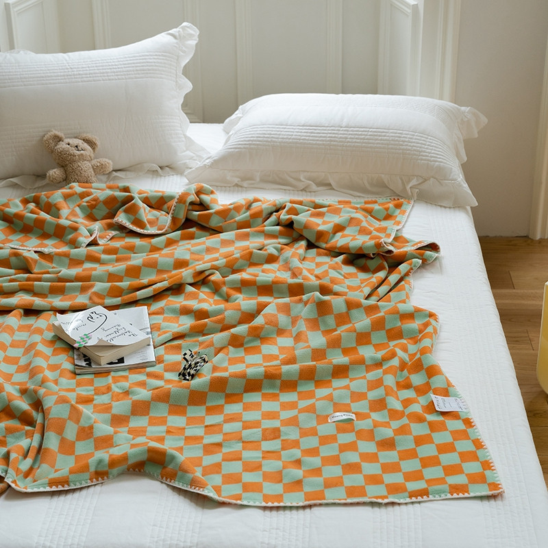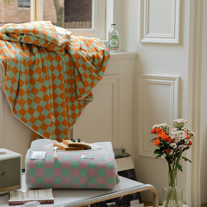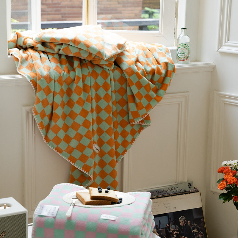 洋铭区 2021冬季新品棋盘格双色牛奶绒毯子 蜜柚橘