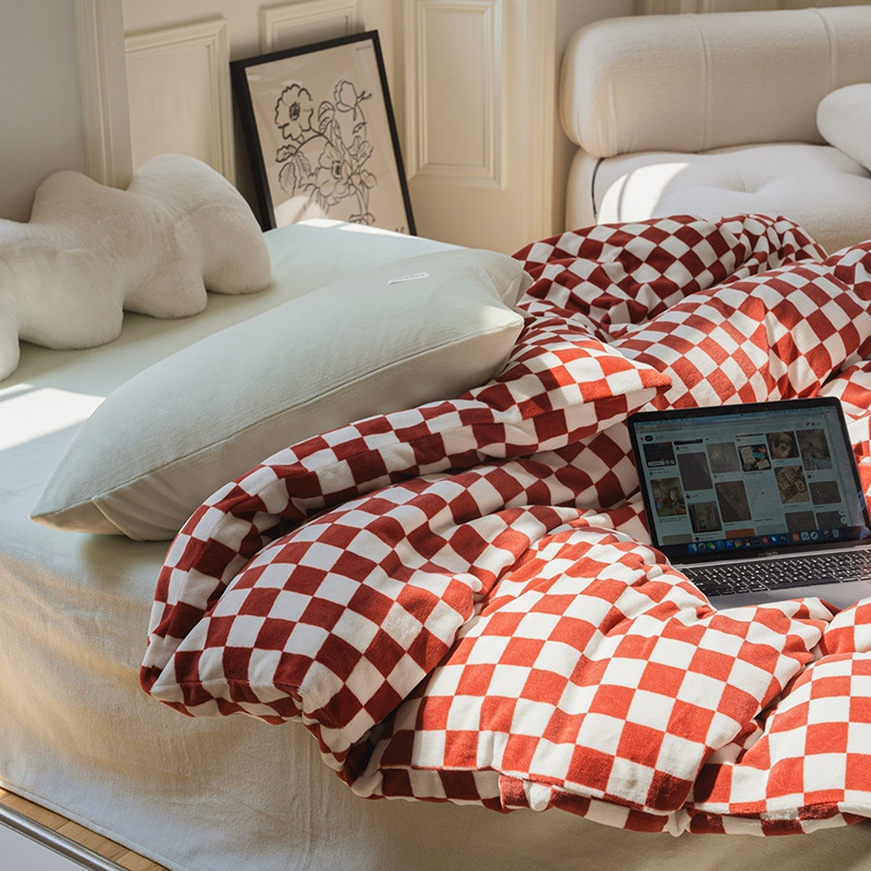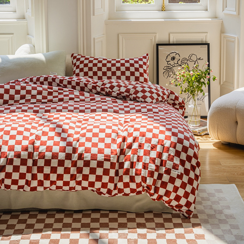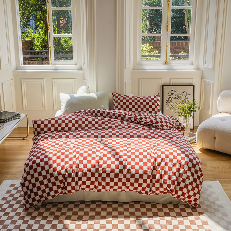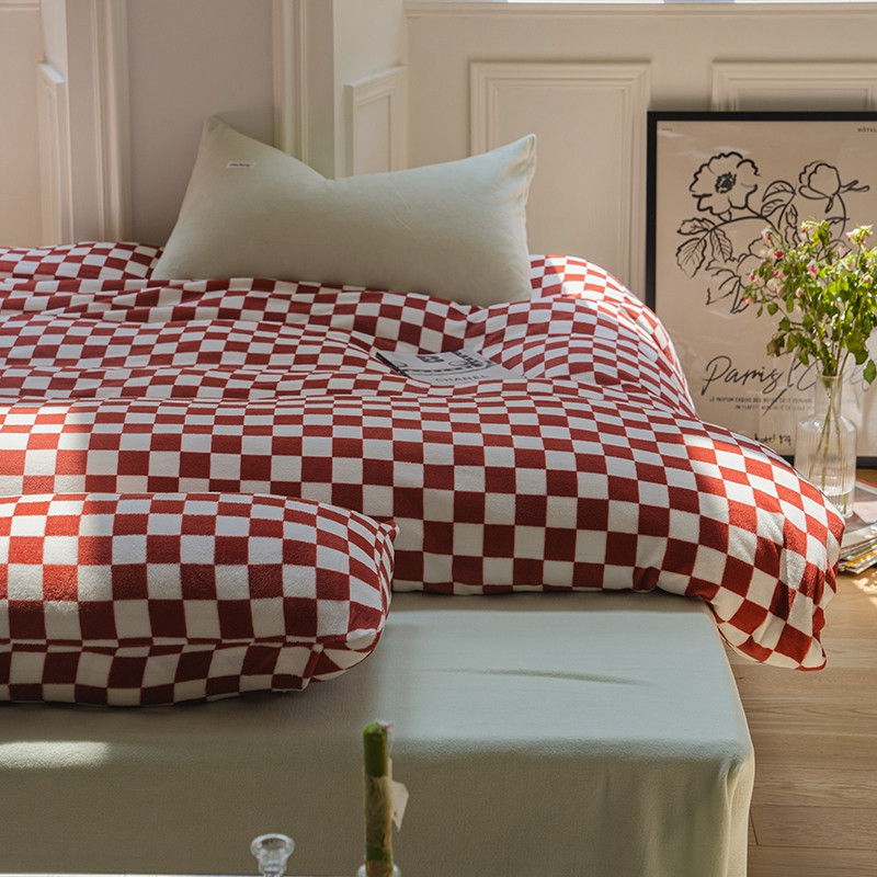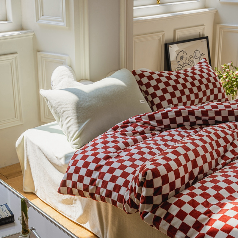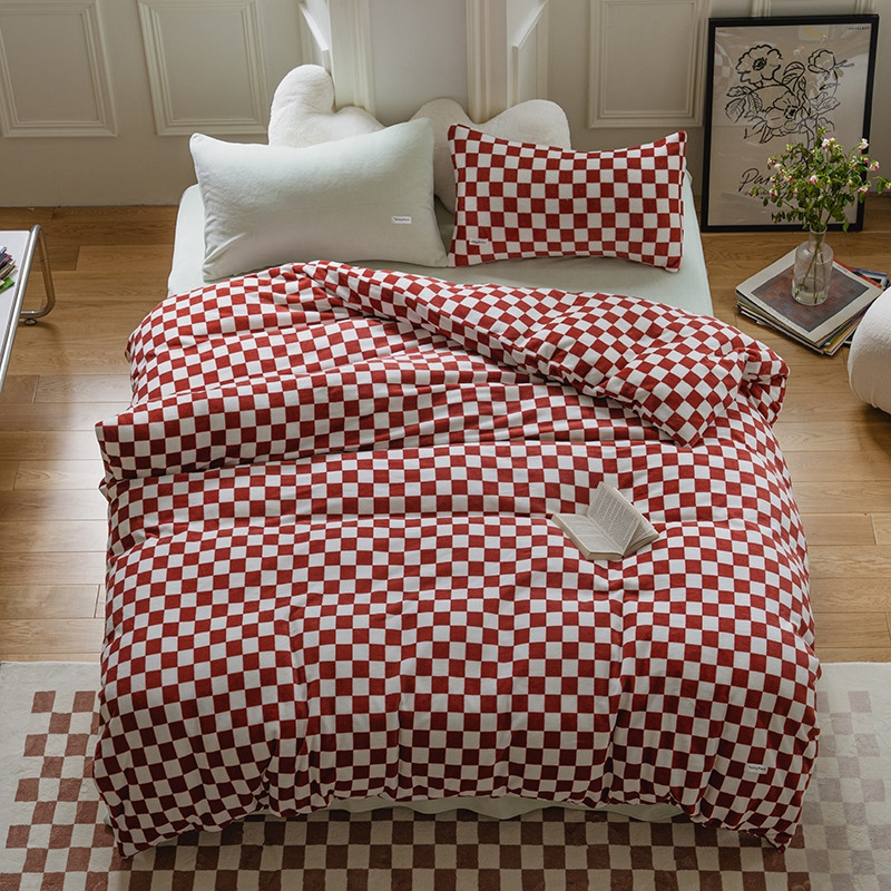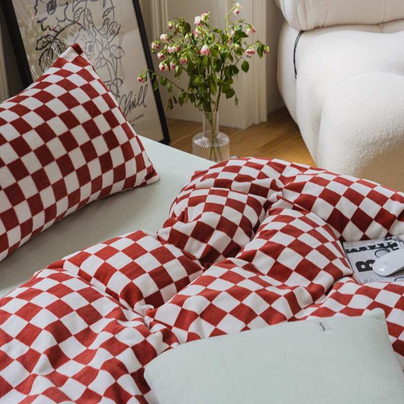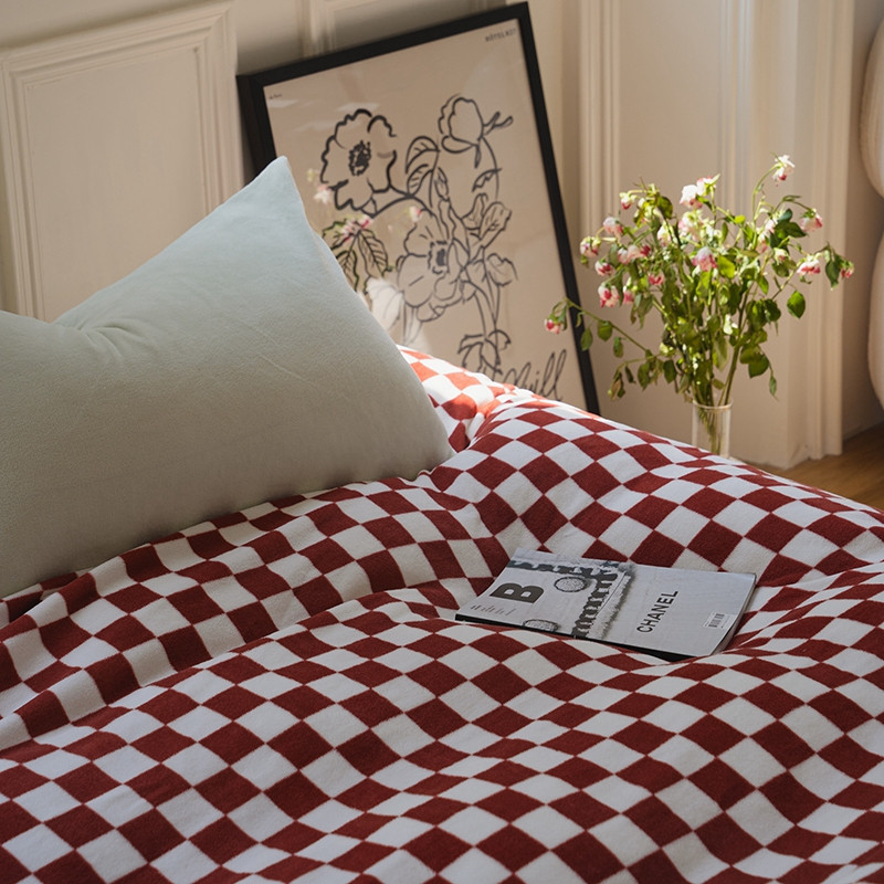 洋铭区 2021冬季新品棋盘格牛奶绒四件套 初恋红格