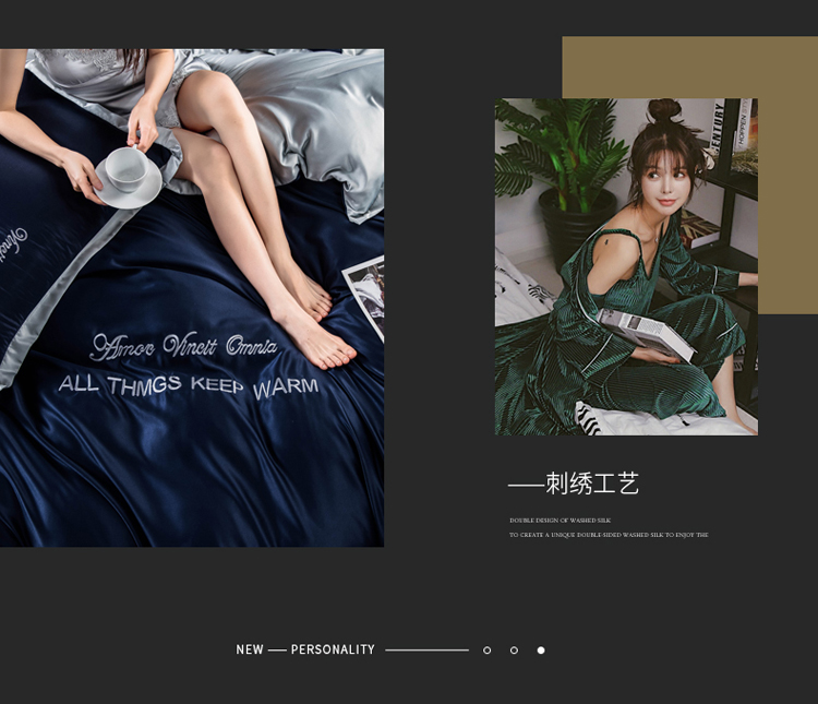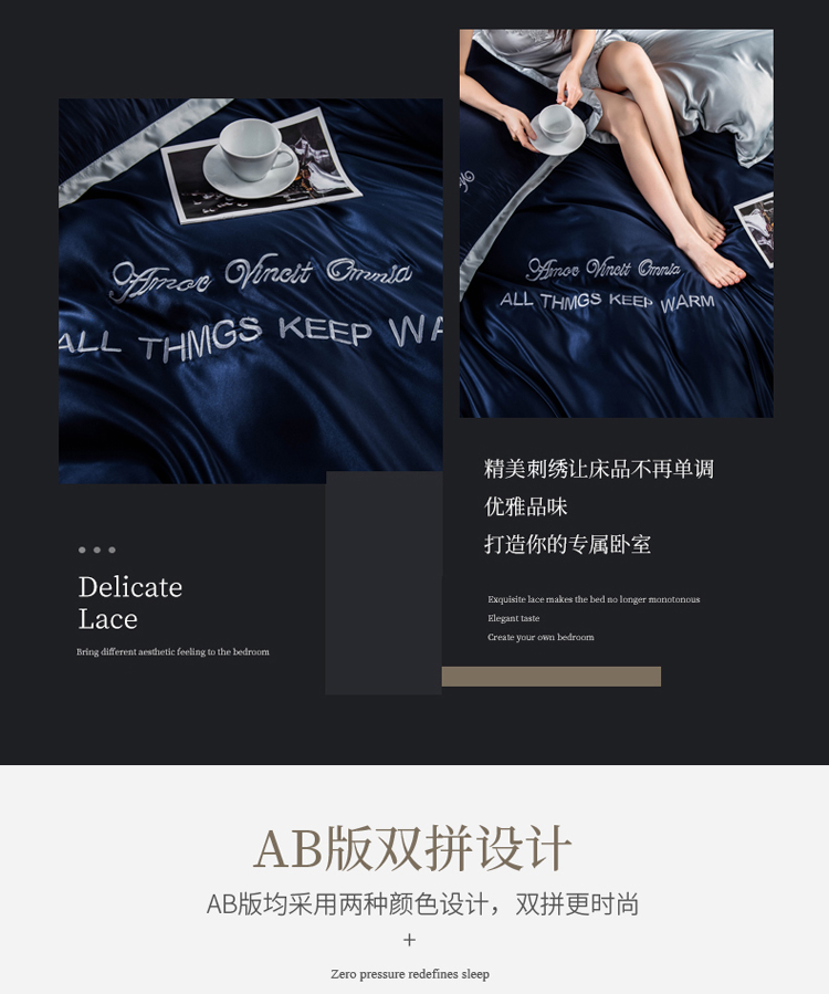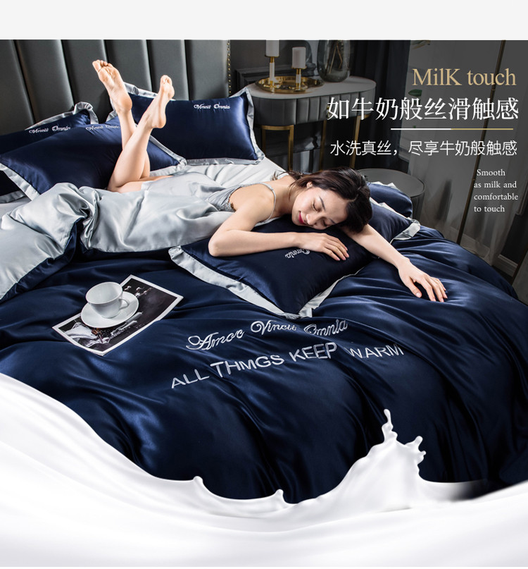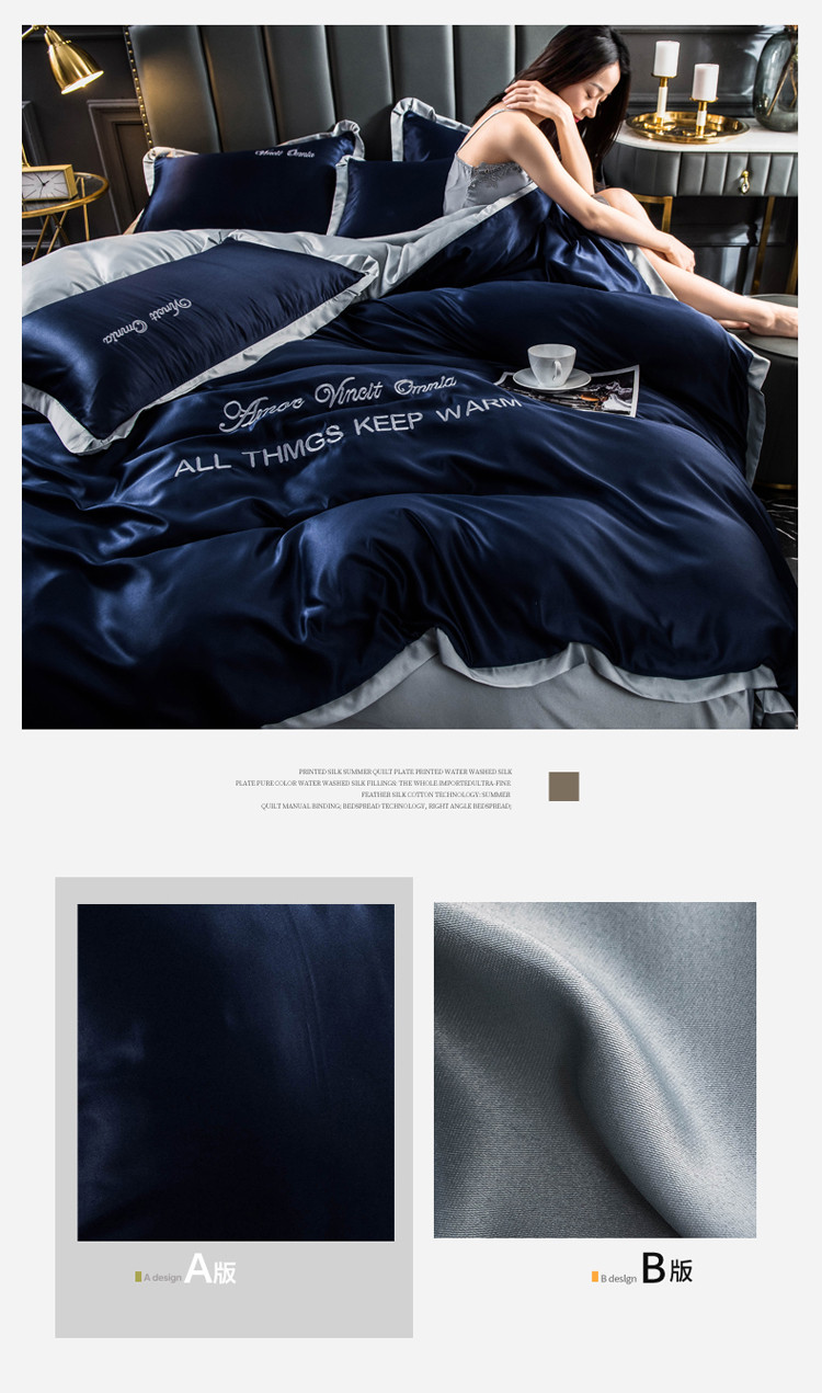 欧冠 2022新款水洗真丝盛夏系列四件套 宝蓝+灰