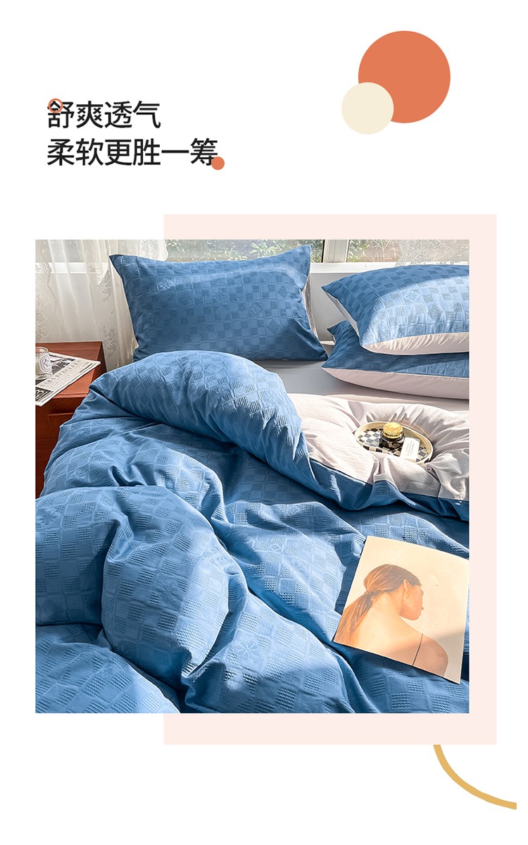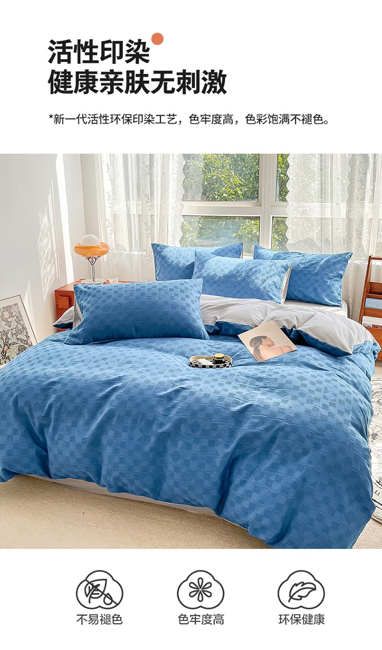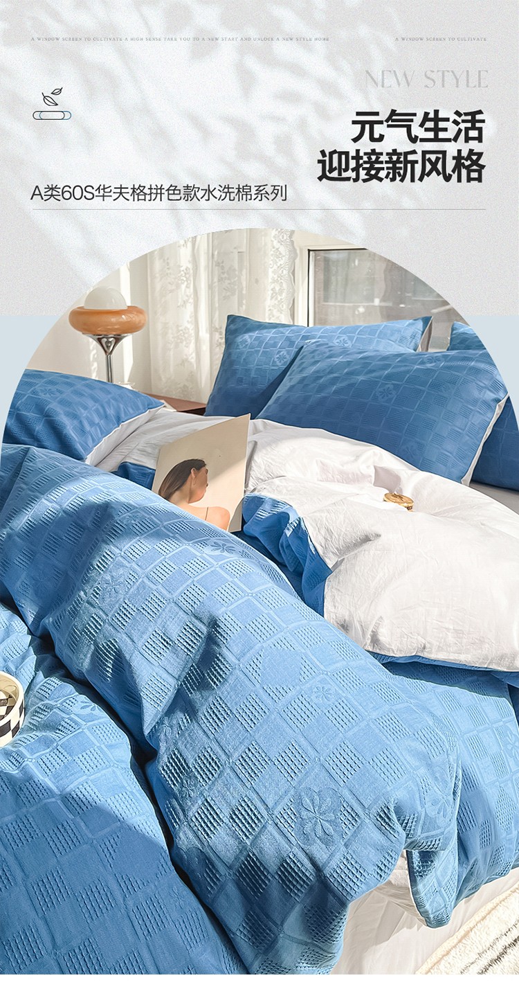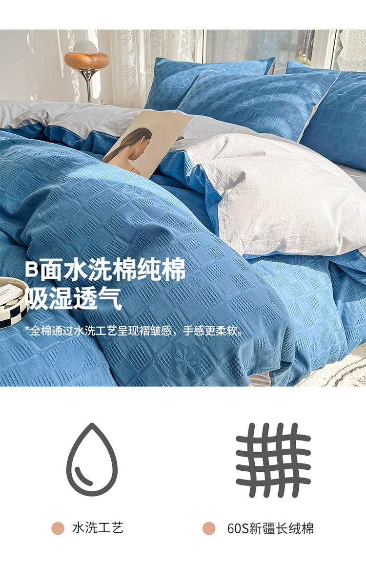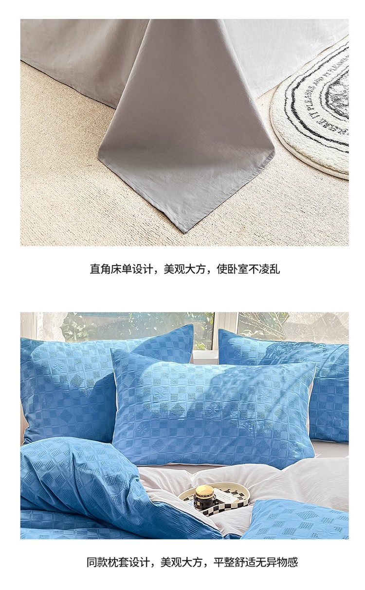 商品名称:蓝米卡夫A类60S华夫格拼色款全棉系列四件套 米夫格-蓝+浅灰