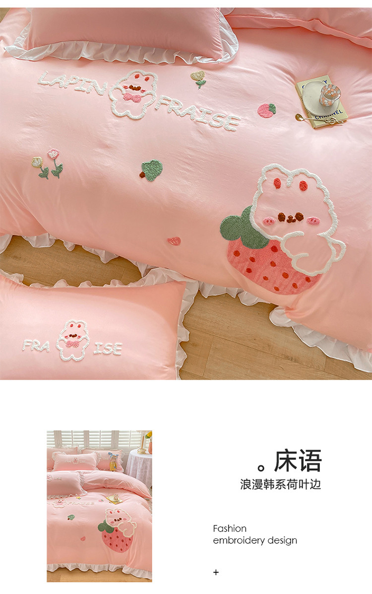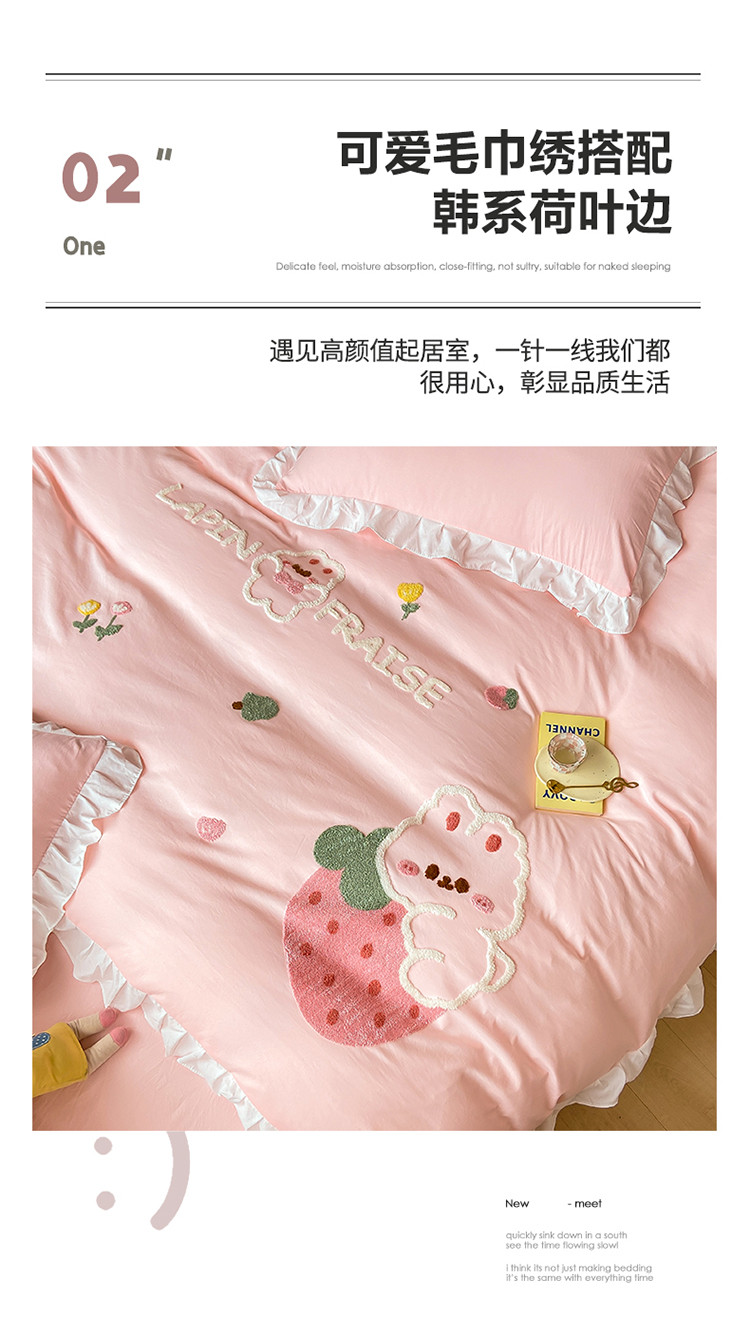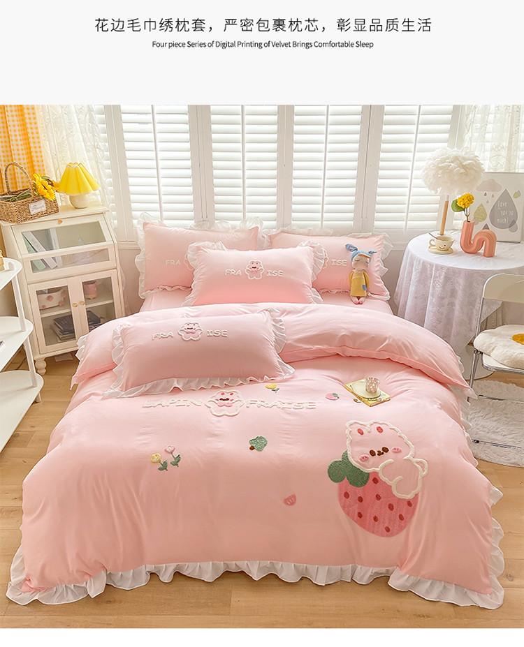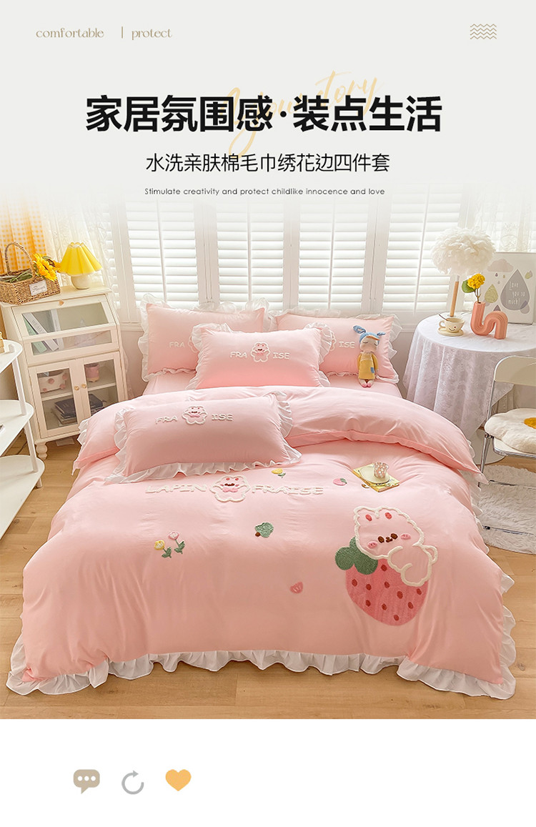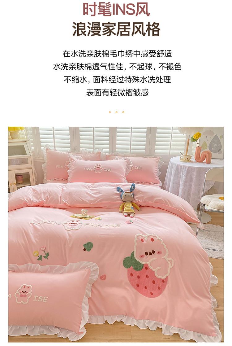 当前位置: 91家纺网 > 商品网购 > 床品套件 > 四件套 > 水洗棉四件套 > 易禾 2022新款水洗亲肤棉毛巾绣草莓兔四件套草莓兔-粉