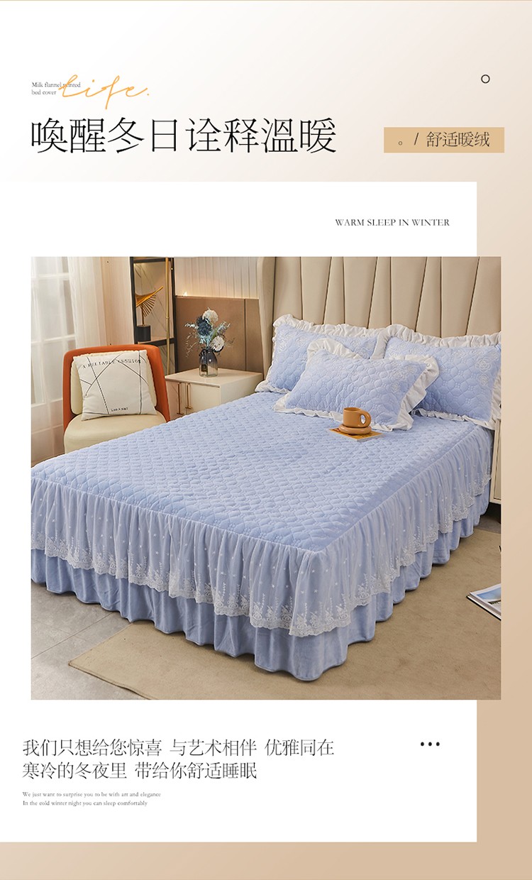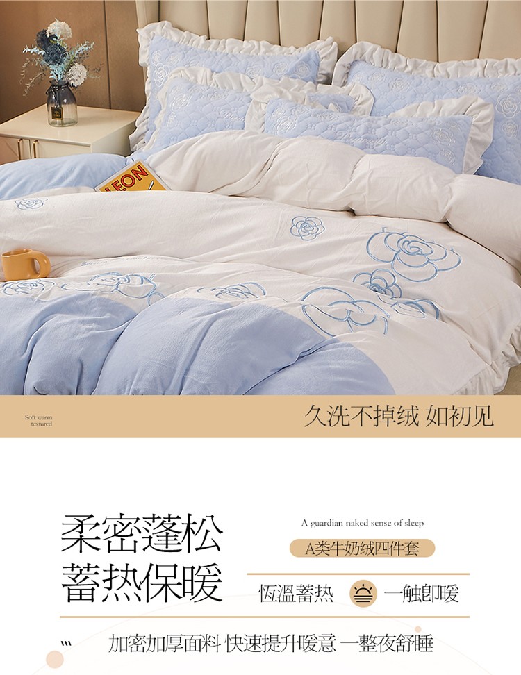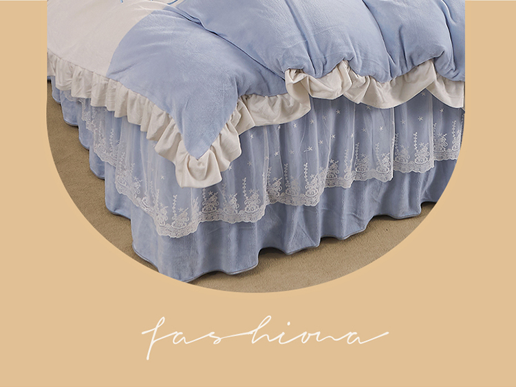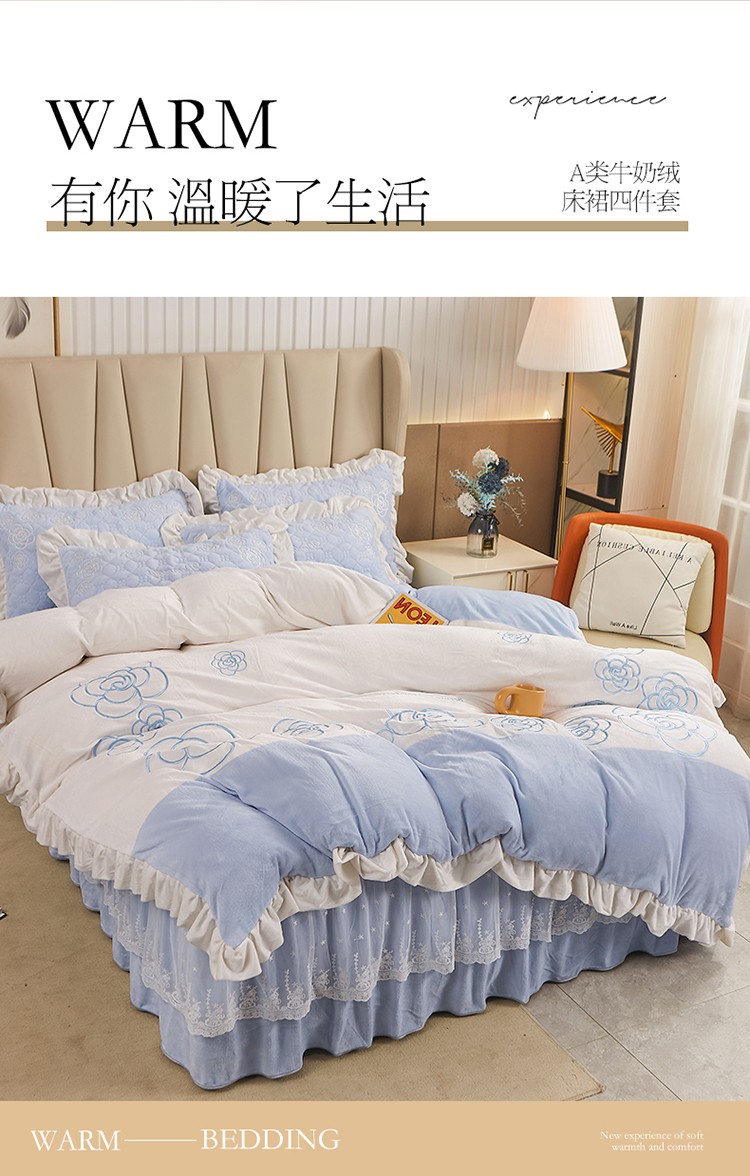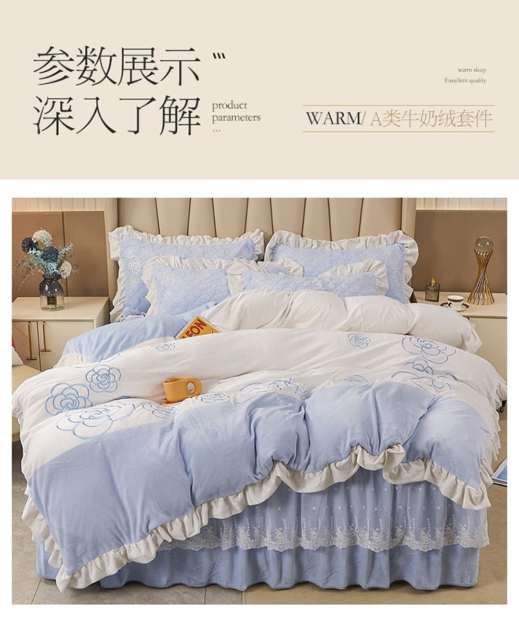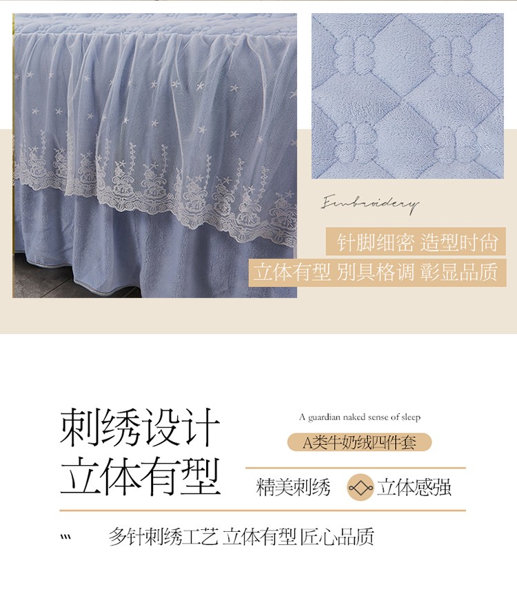 • 91家纺网 家纺一手货源 找家纺 宜凡 2022新款A类牛奶绒绣花床裙三四件套 花间序语-雪青