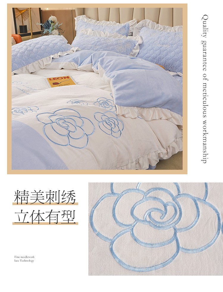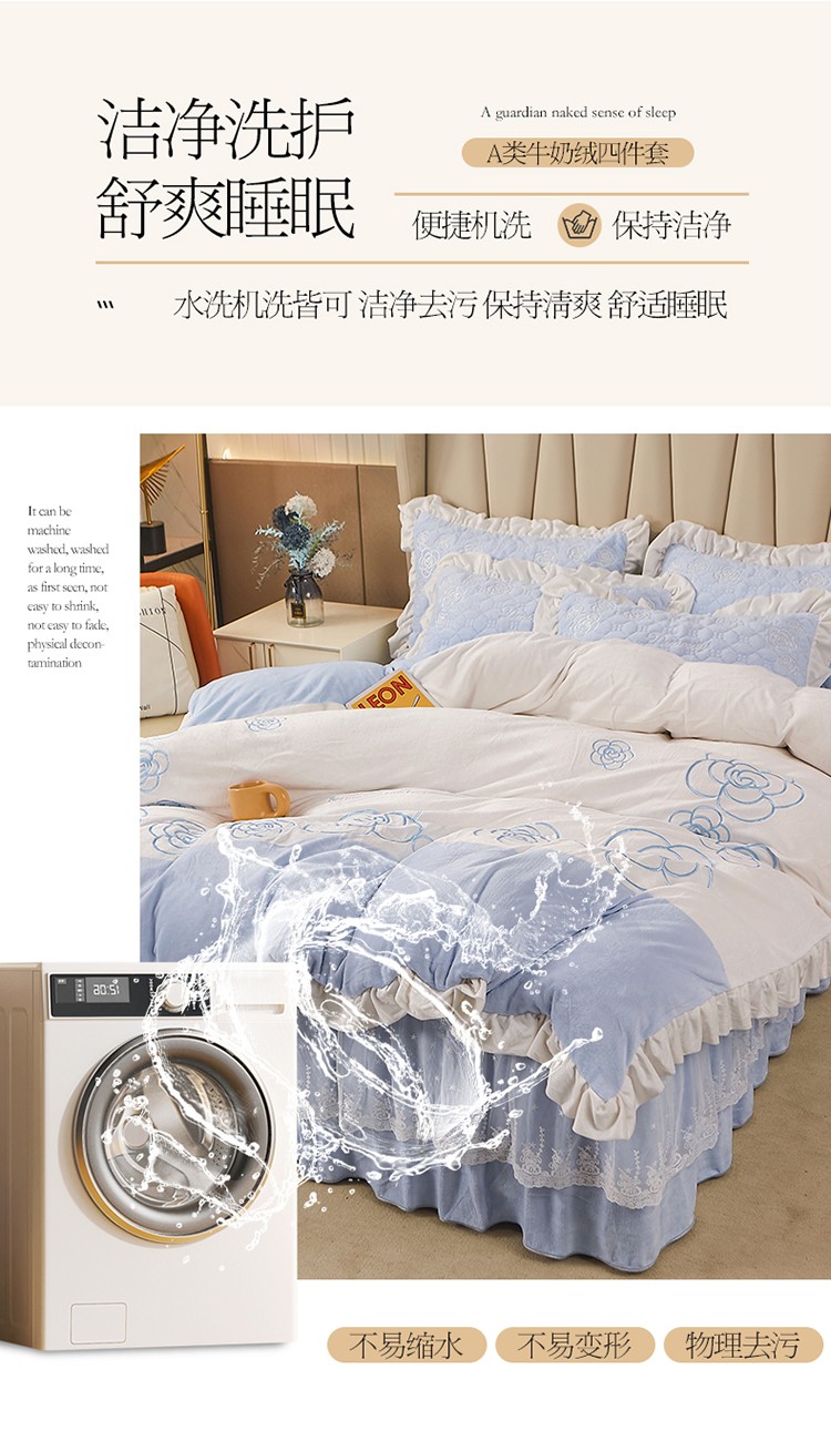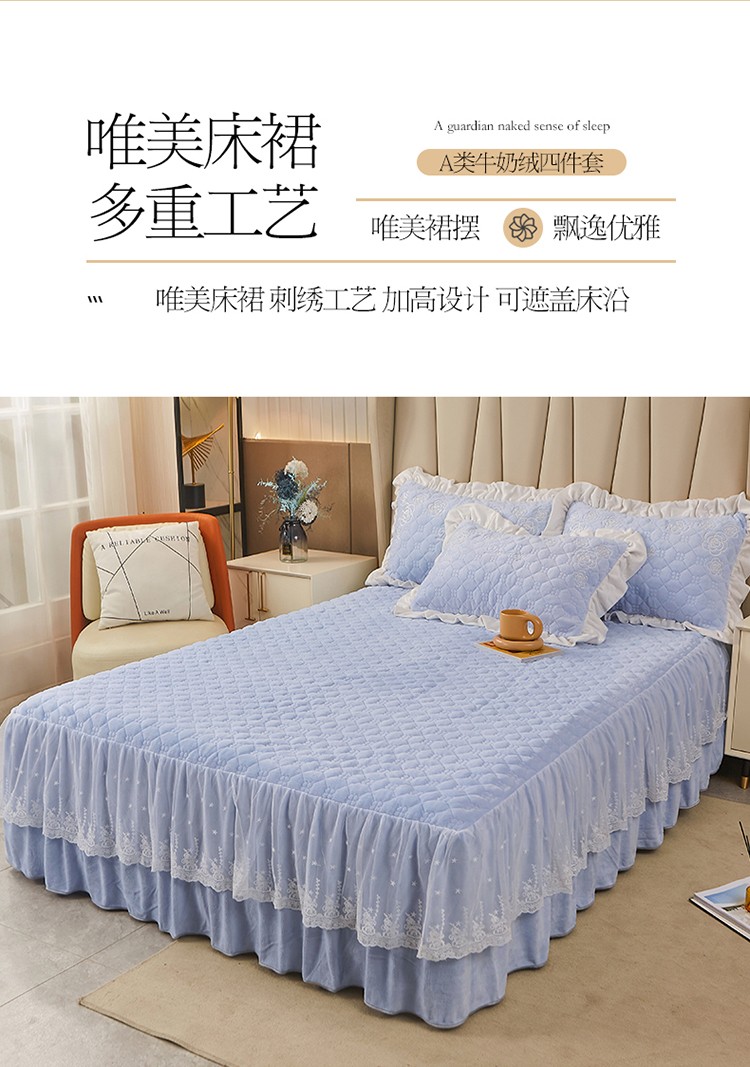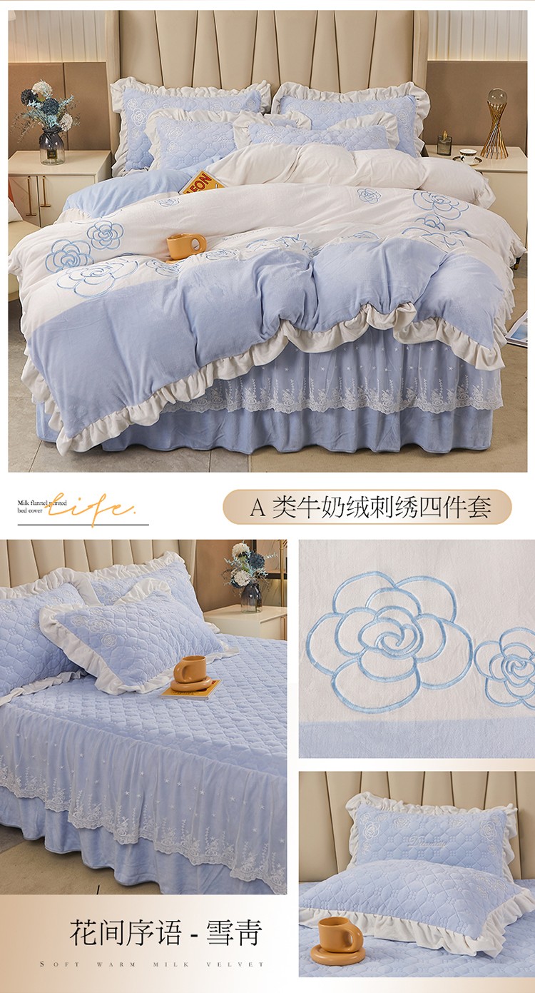 宜凡 2022新款A类牛奶绒绣花床裙三四件套 花间序语-雪青