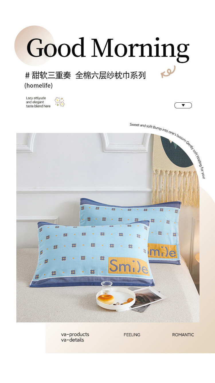 棠薇 2023新款全棉6层纱布枕巾-简约系列 6层 繁星浅蓝53*80cm/对