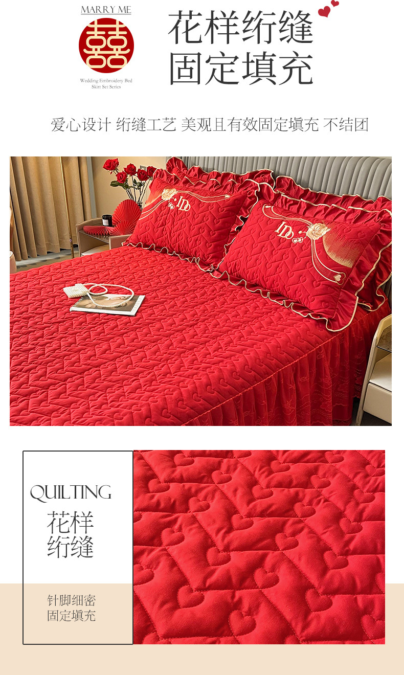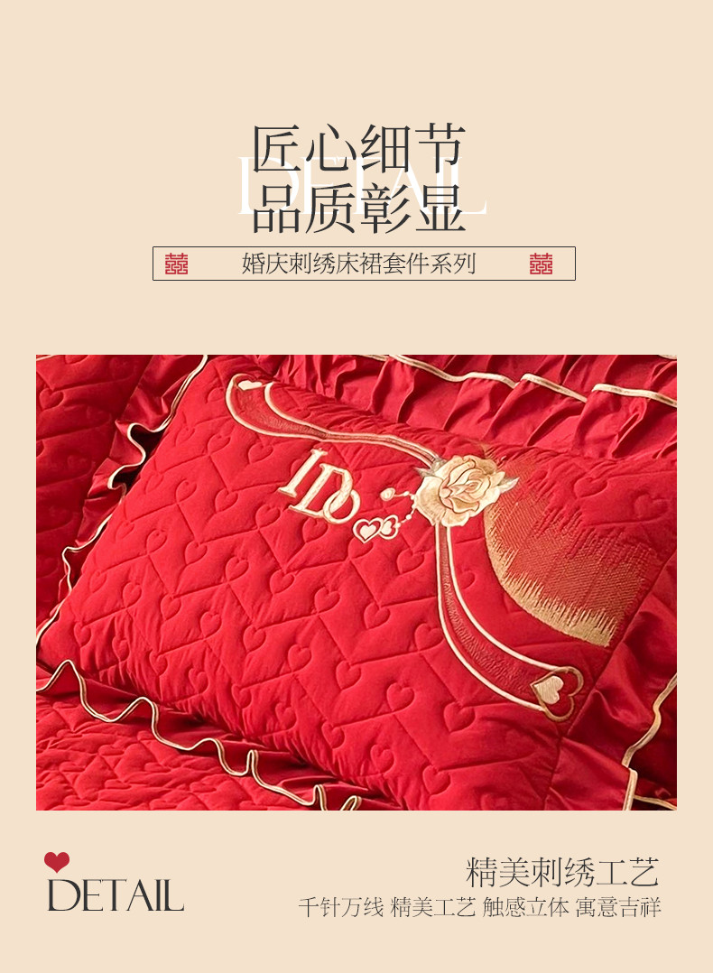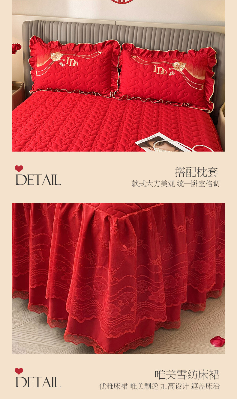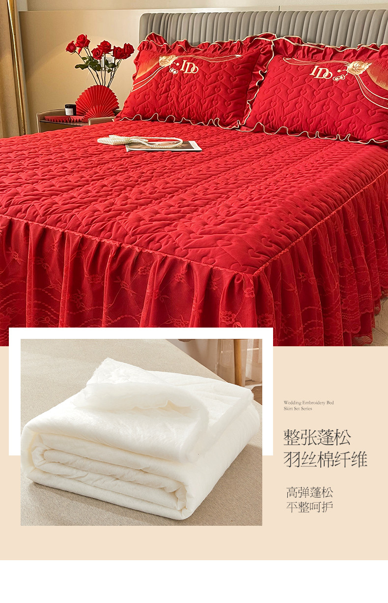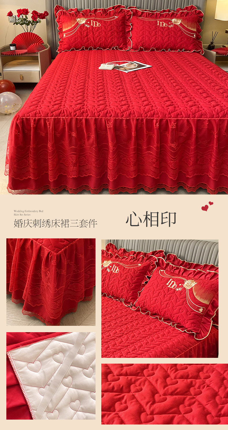 商品名称:宜凡家纺 2023新款亲肤磨毛婚庆夹棉床裙三件套 心相印