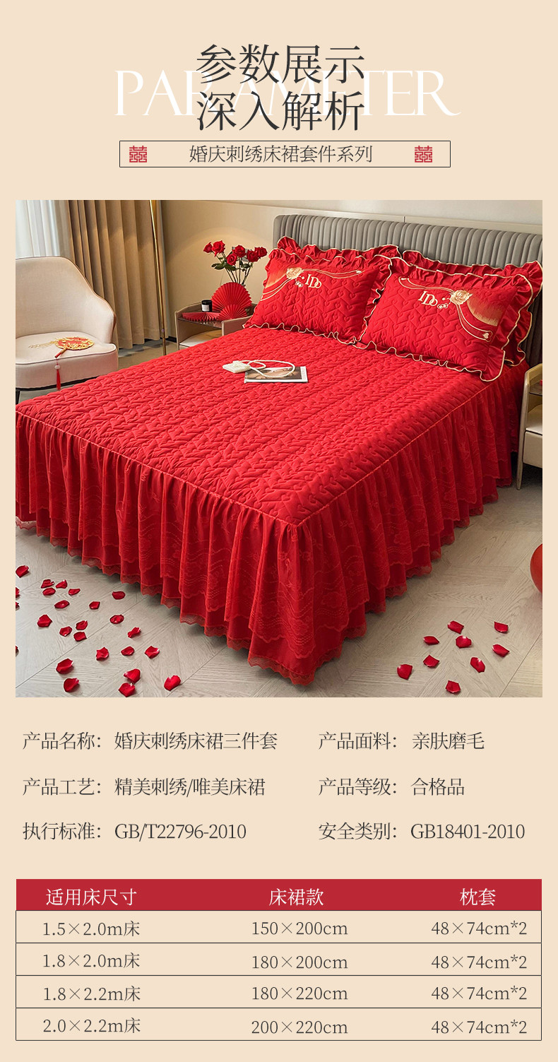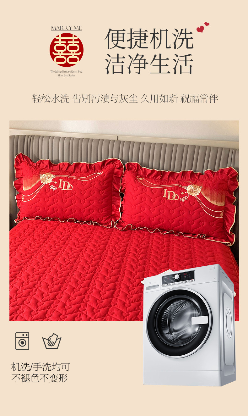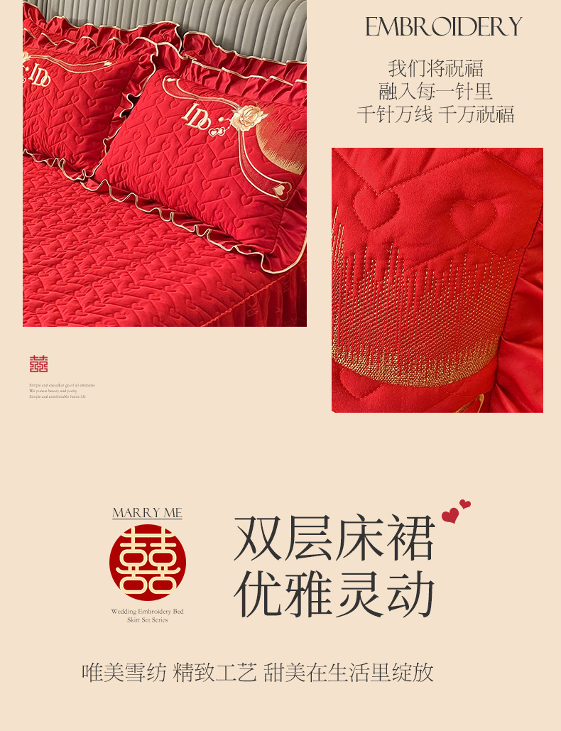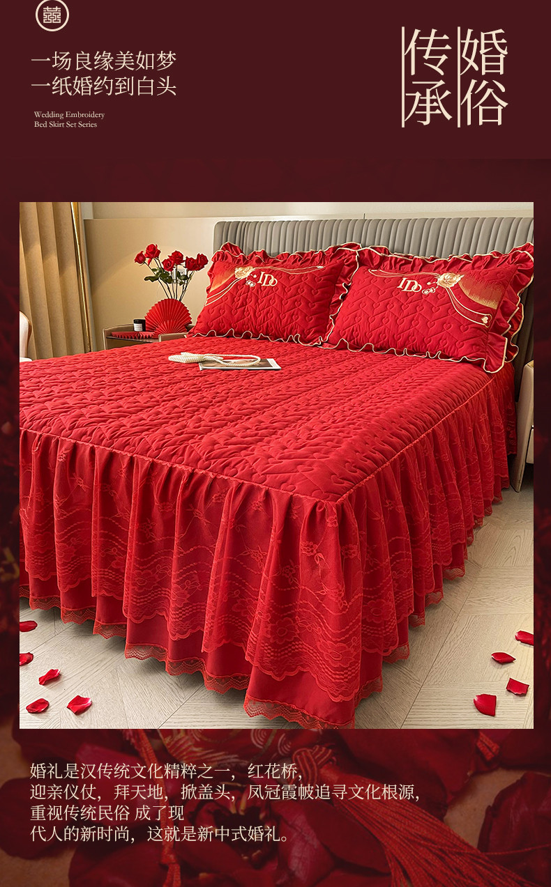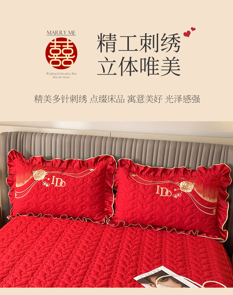 商品名称:宜凡家纺 2023新款亲肤磨毛婚庆夹棉床裙三件套 心相印