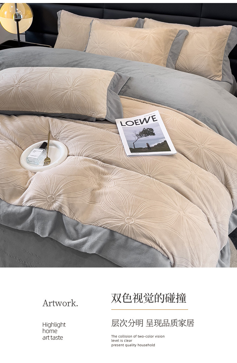 KA 2023冬季宽边雕花牛奶绒四件套 四叶草卡其