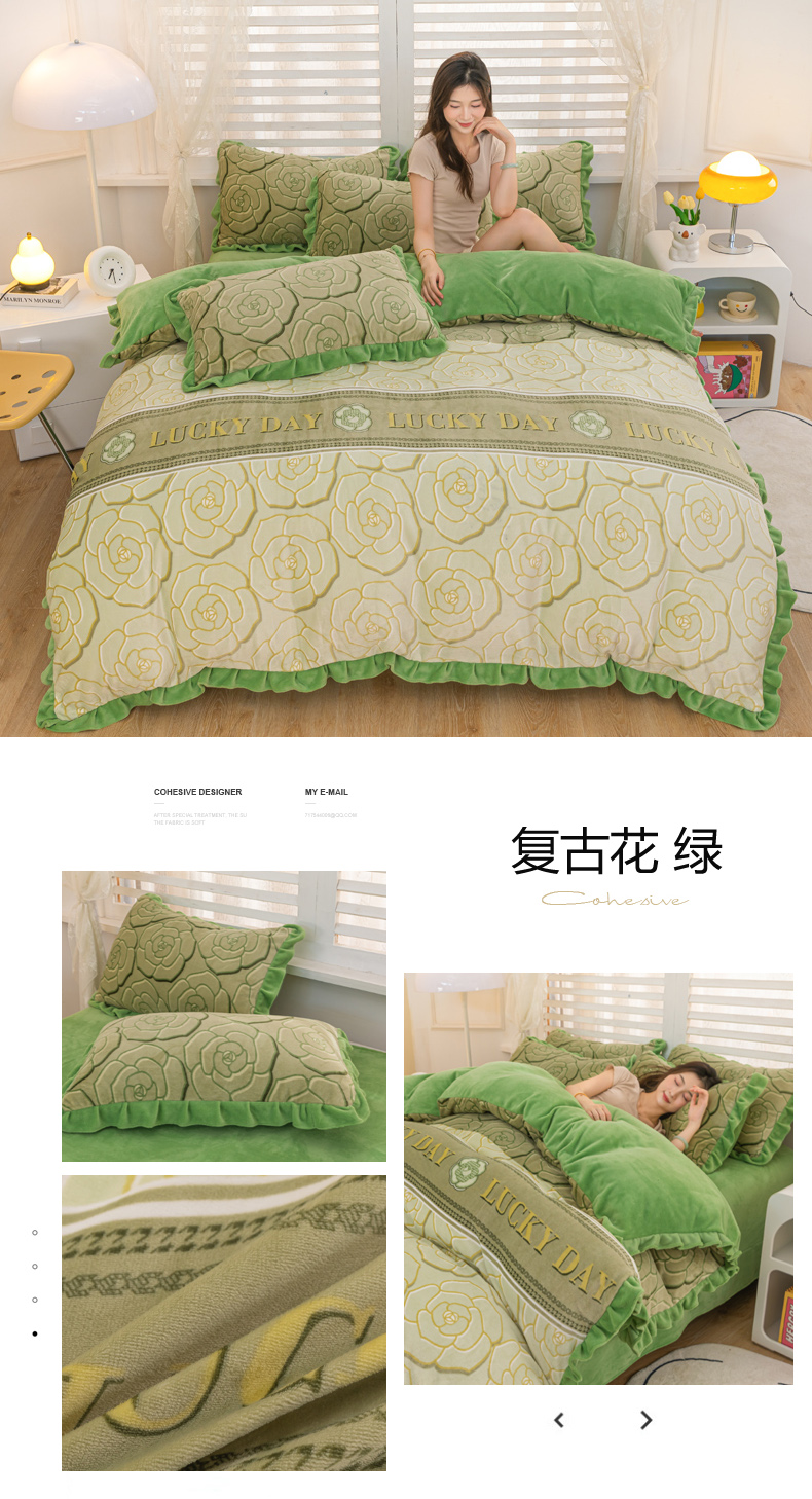 商品名称:首选 2023新款韩版花边牛奶绒四件套 复古花-绿