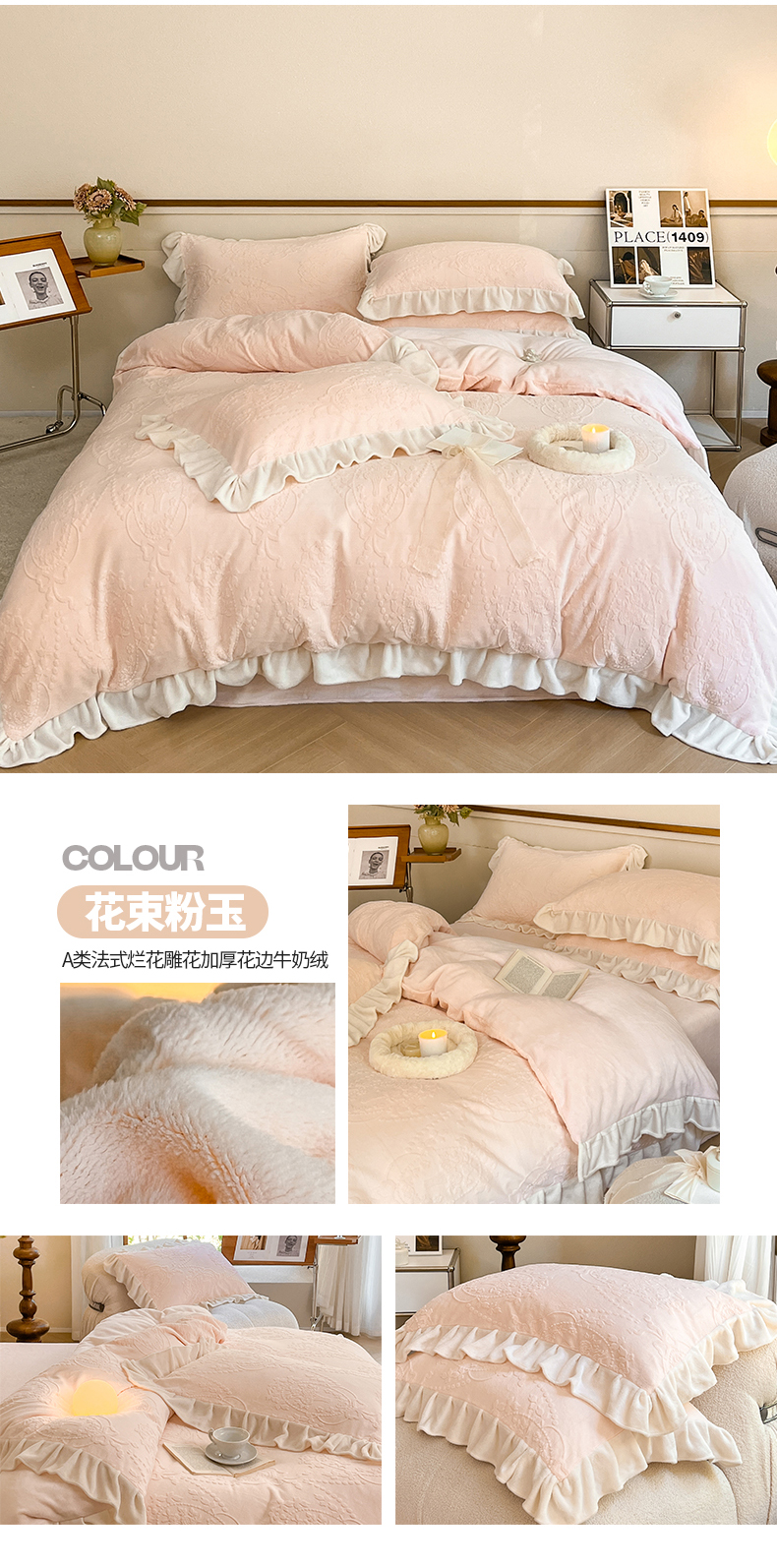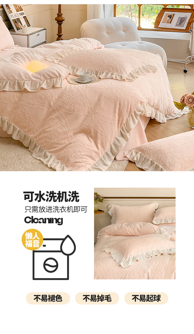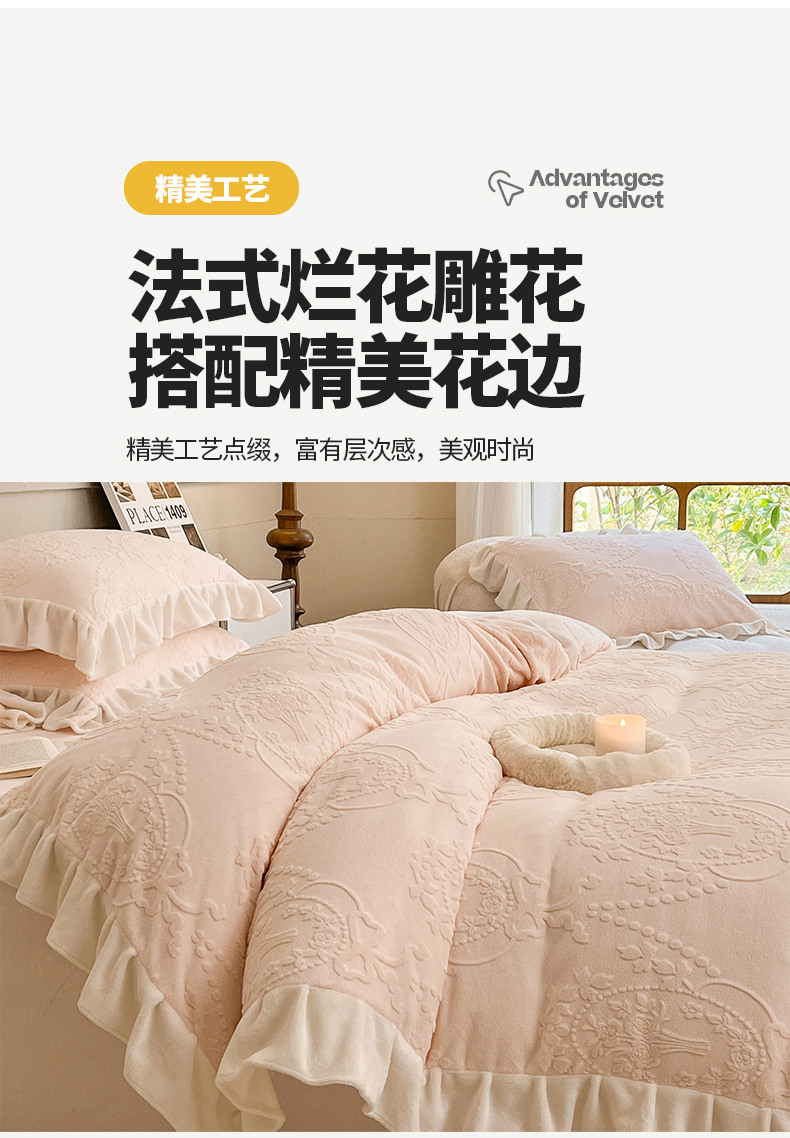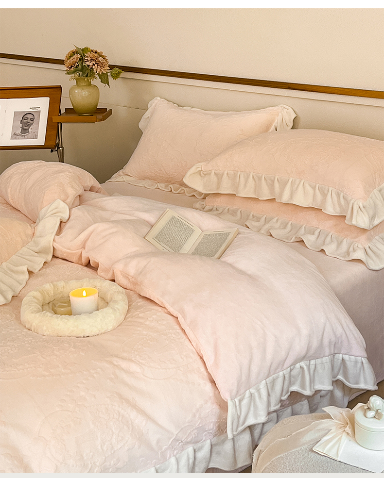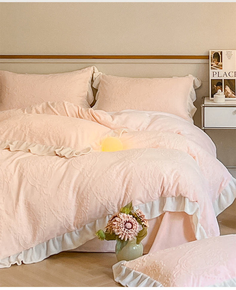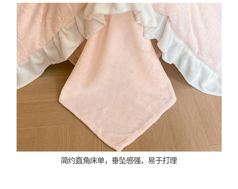 商品名称:桃子家居 2023新款A类高克重230克法式烂花雕花提花加厚韩版花边牛奶绒四件套 绒烂花-花束粉玉