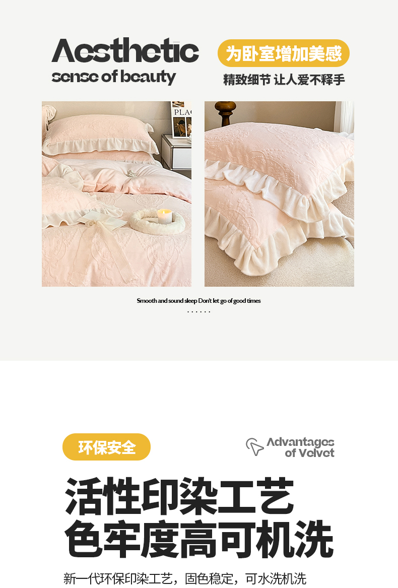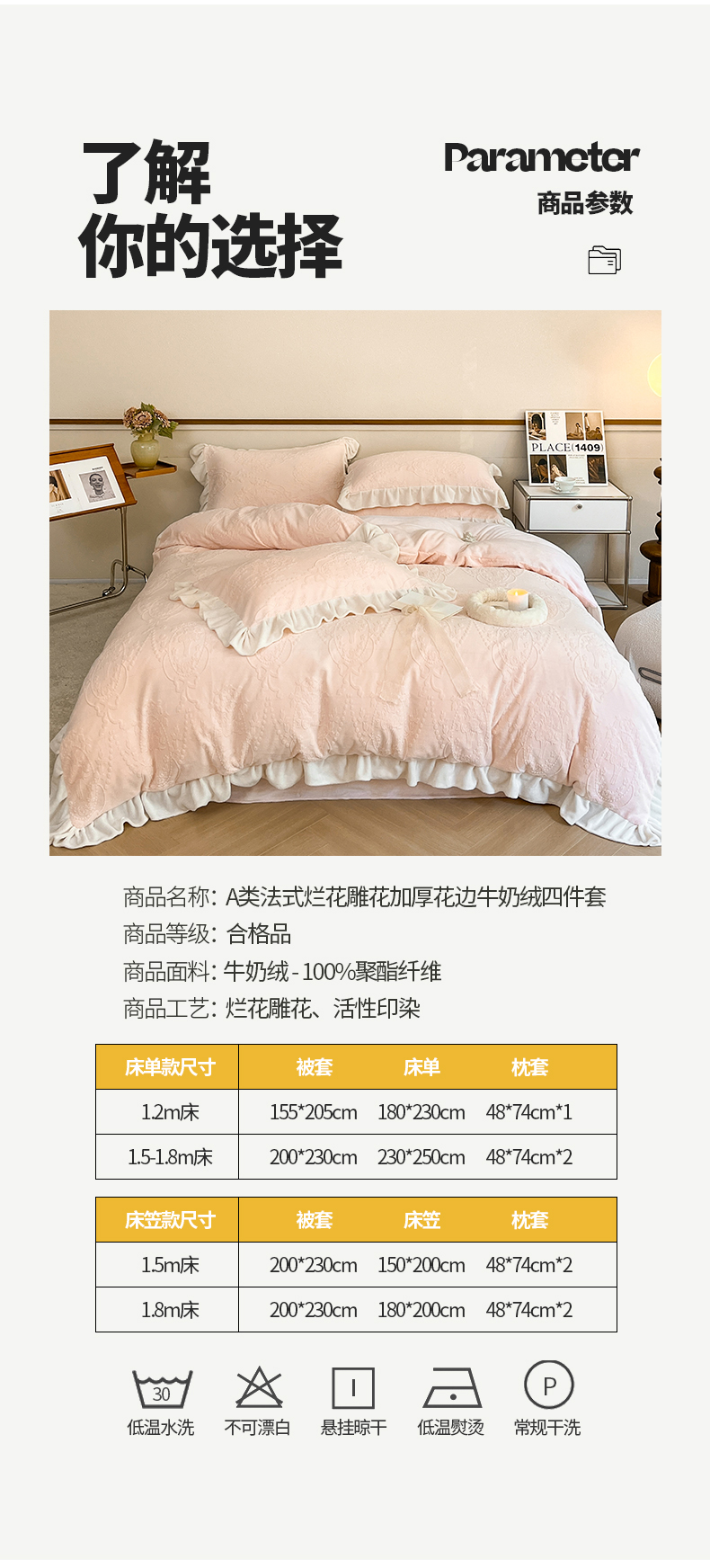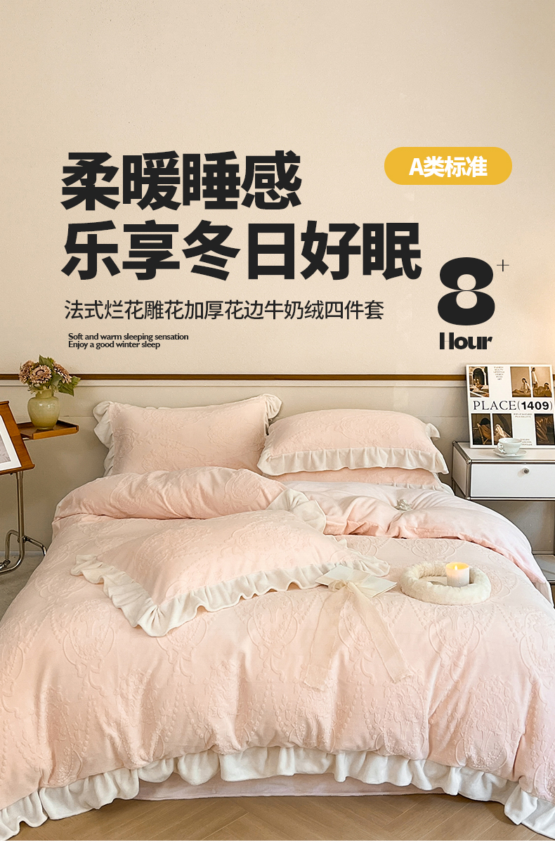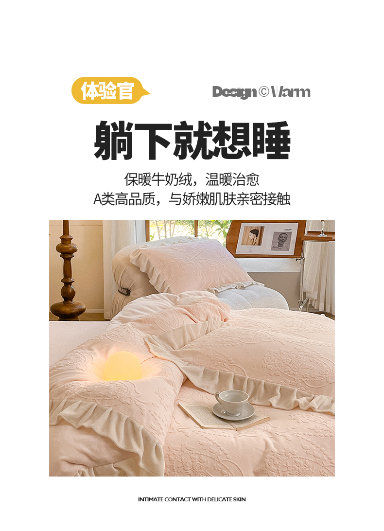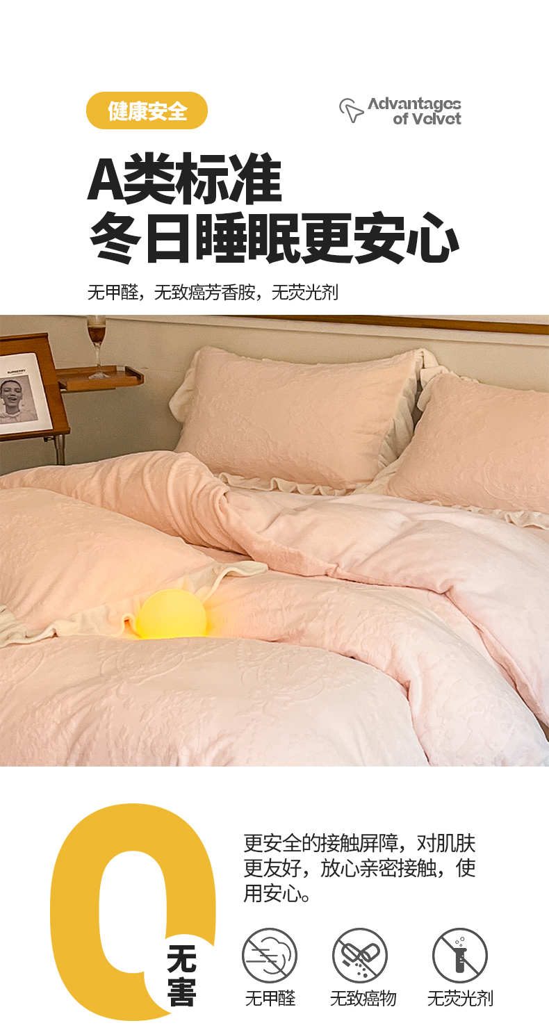 商品名称:桃子家居 2023新款A类高克重230克法式烂花雕花提花加厚韩版花边牛奶绒四件套 绒烂花-花束粉玉