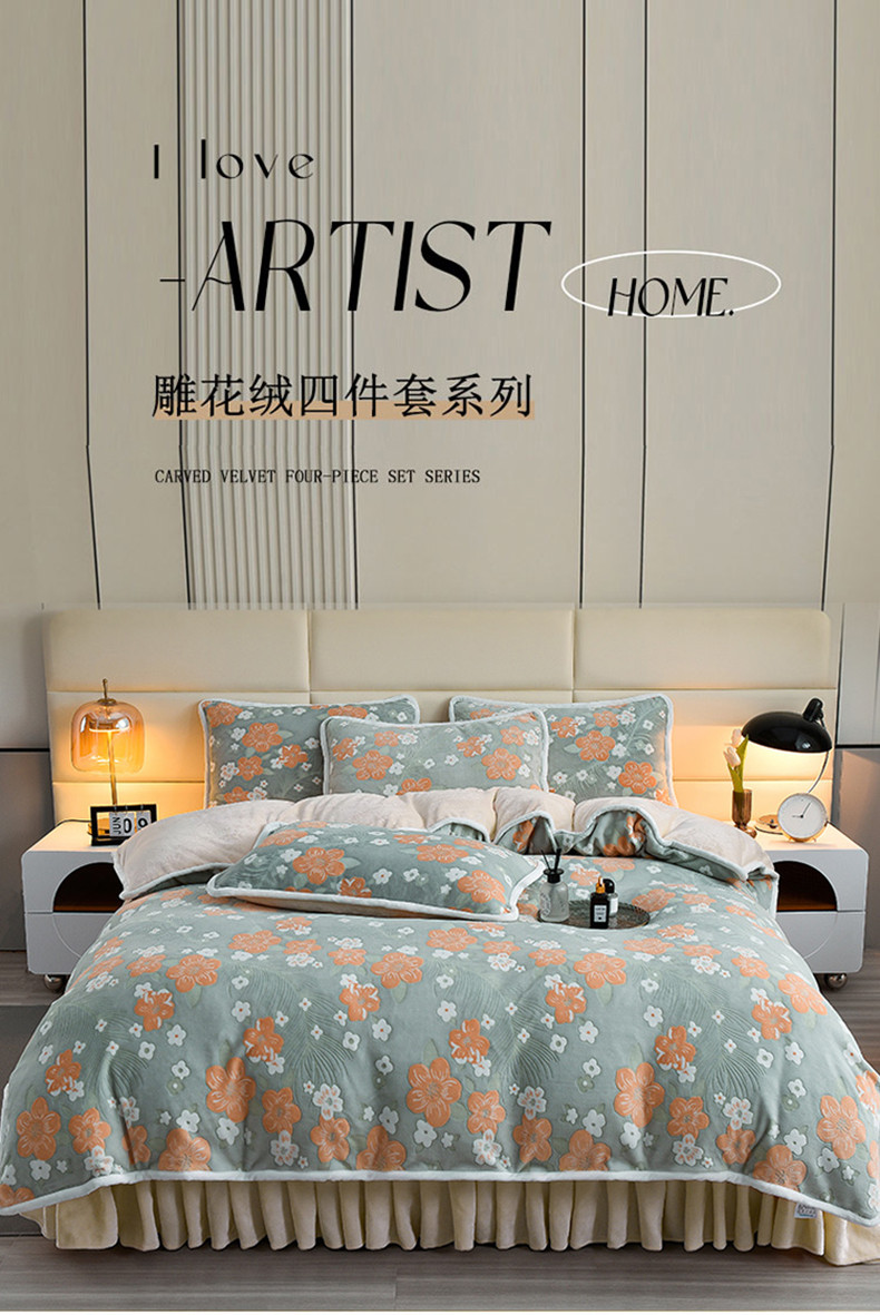 畅畅家纺 2023新款A类雕花绒牛奶绒四件套 海棠花-浅绿