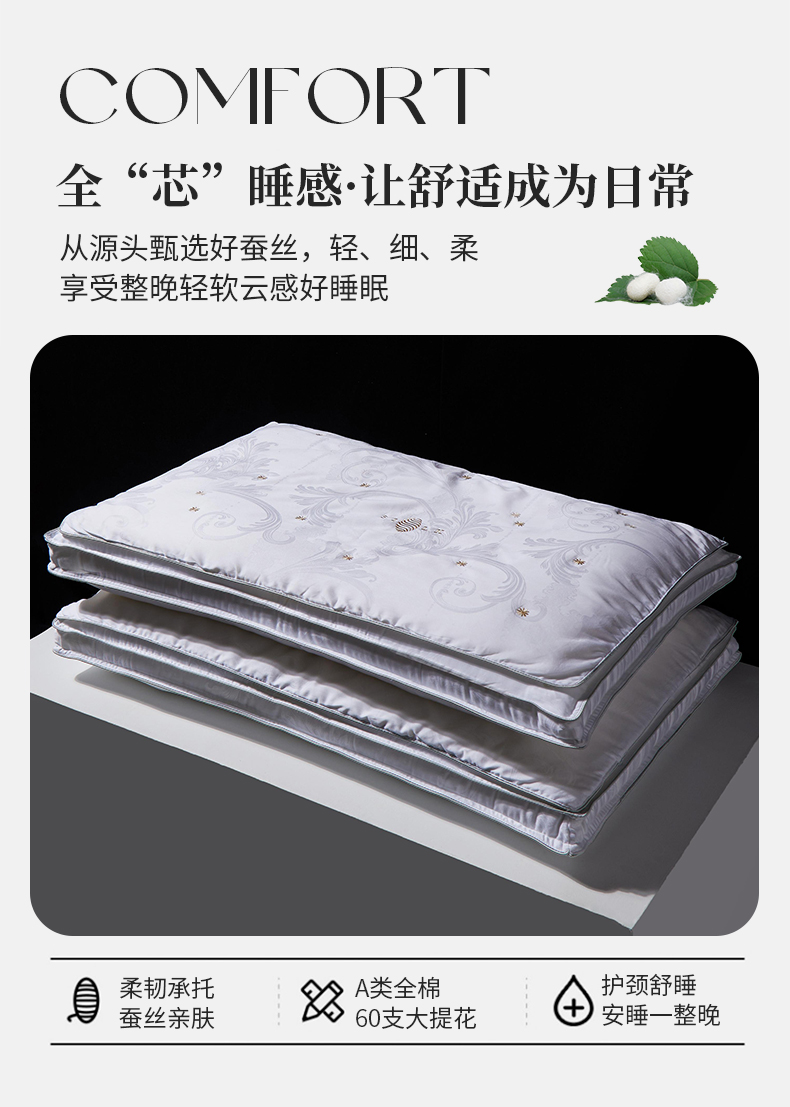 当前位置: 91家纺网 > 商品网购 > 枕头/枕芯/保健枕/颈椎枕 > 普通枕芯 > (总)昕科 2025新款A类提花蚕丝二合一枕芯-全棉可拆卸蚕丝枕头爆款