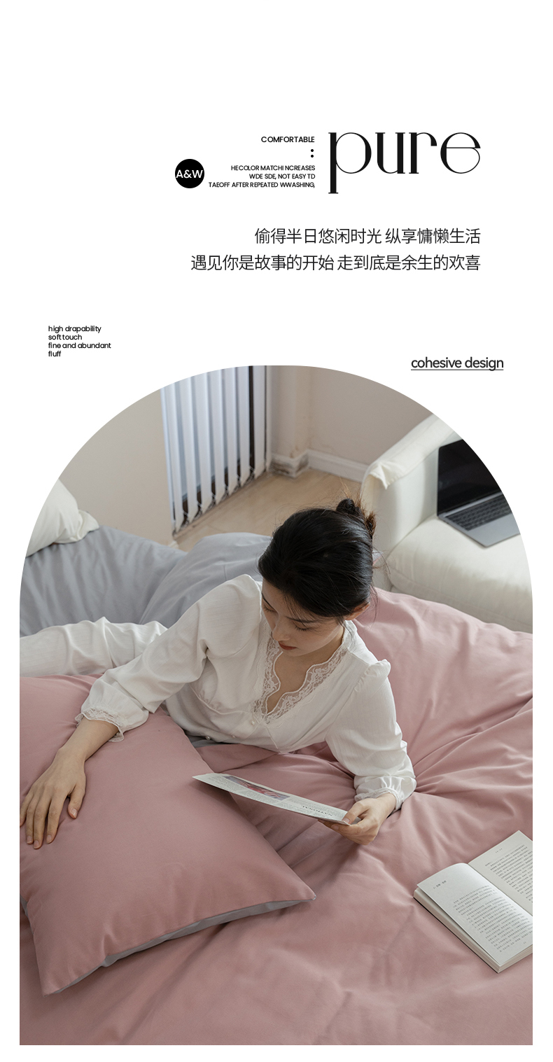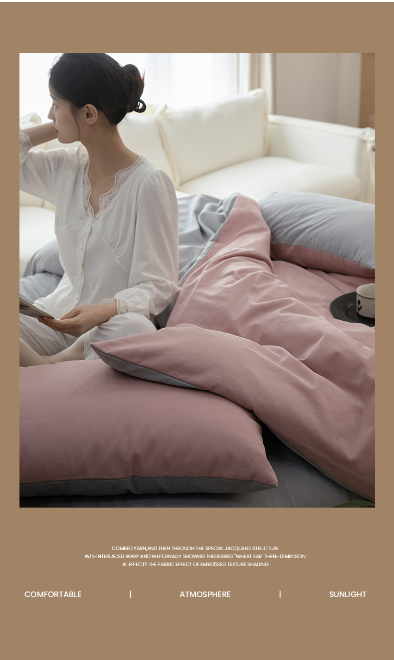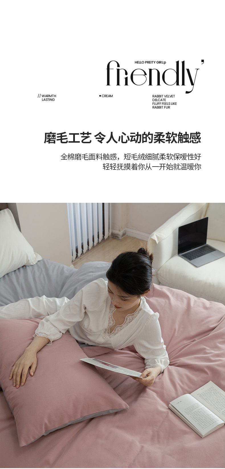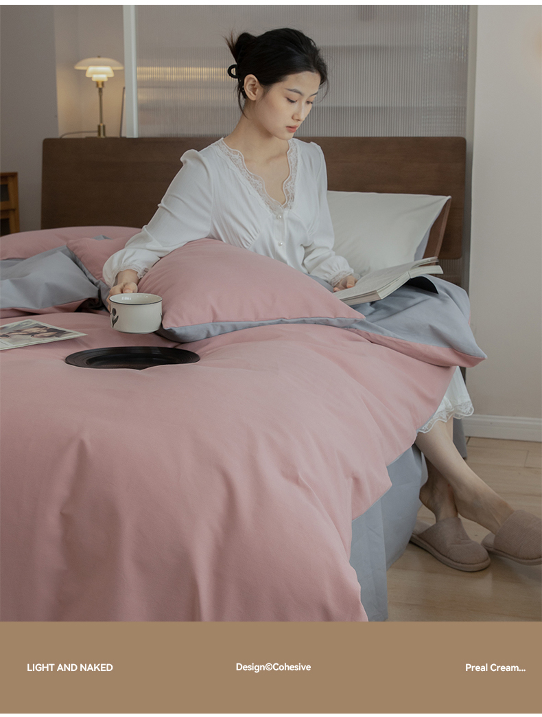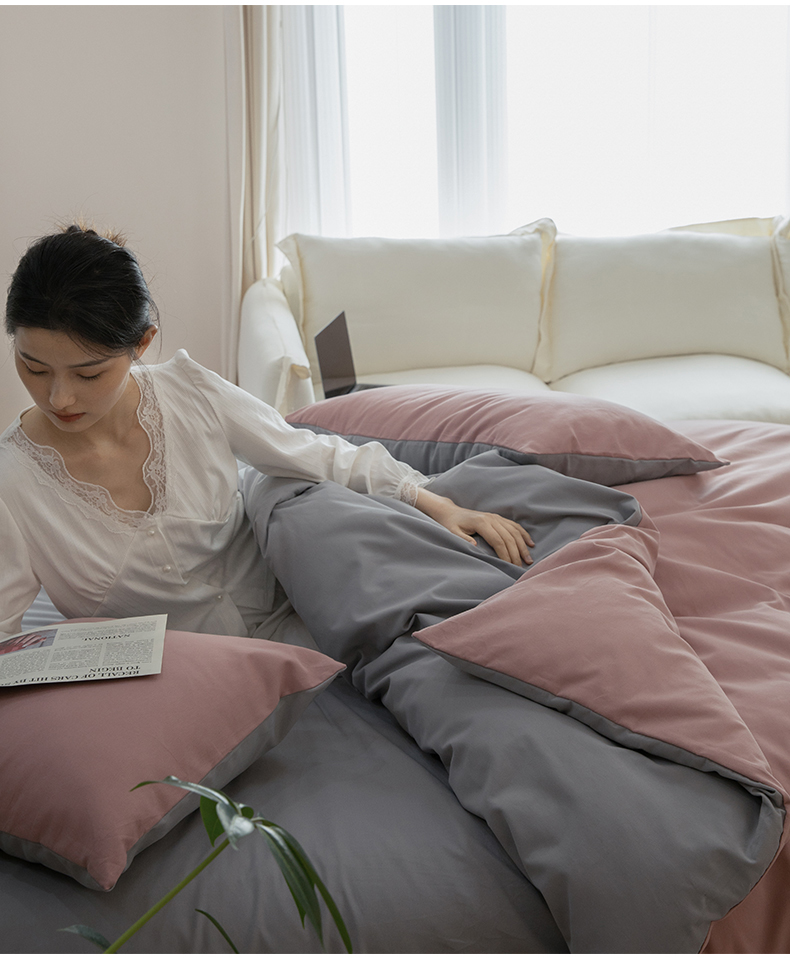 当前位置: 91家纺网 > 商品网购 > 床品套件 > 四件套 > 普通磨毛四件套 > 寐眠 2023新款纯棉磨毛双拼四件套 爱丽丝粉灰