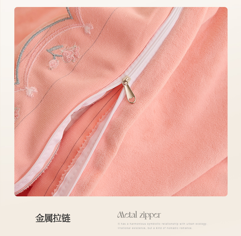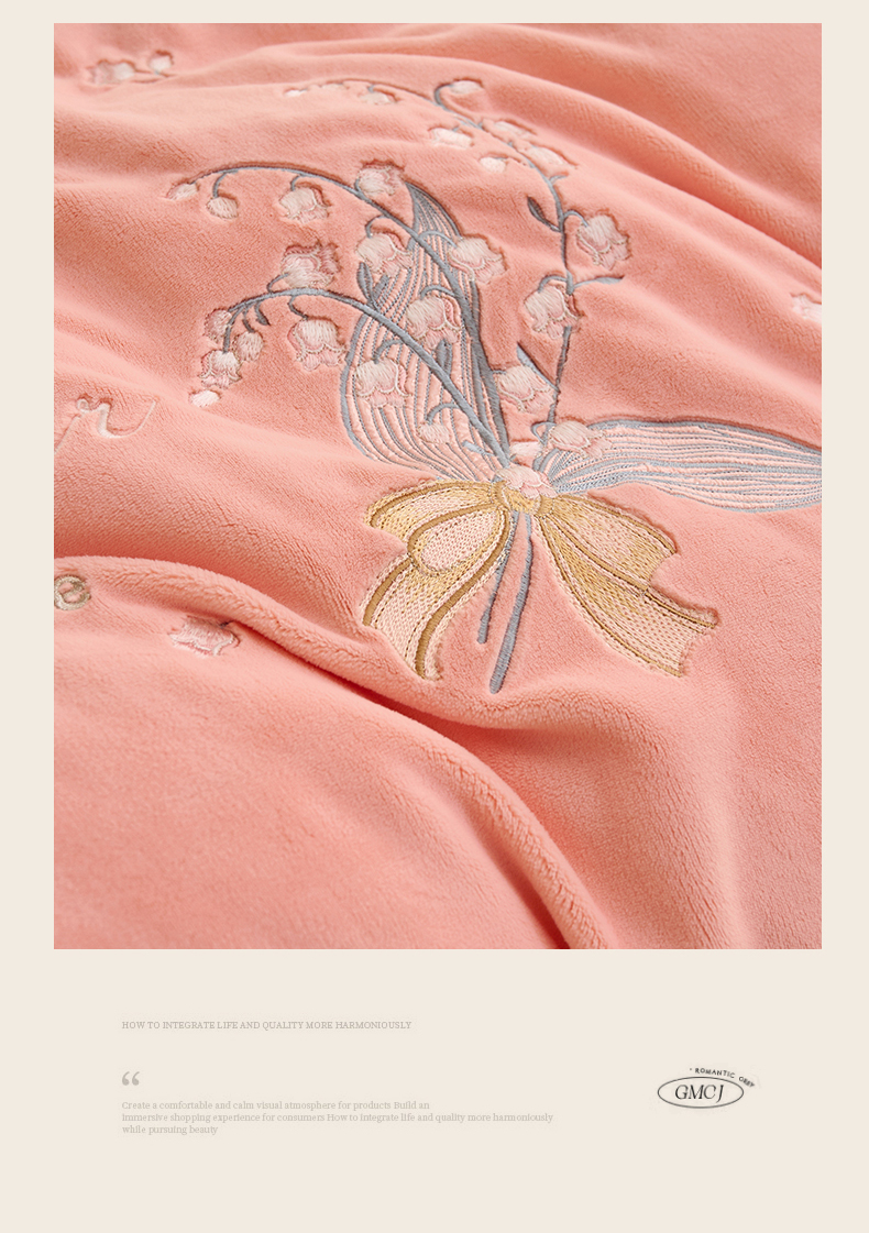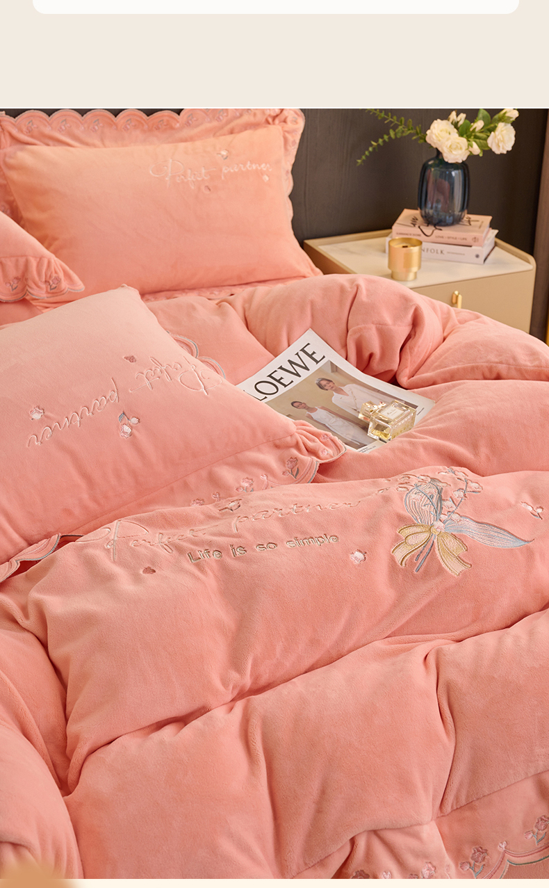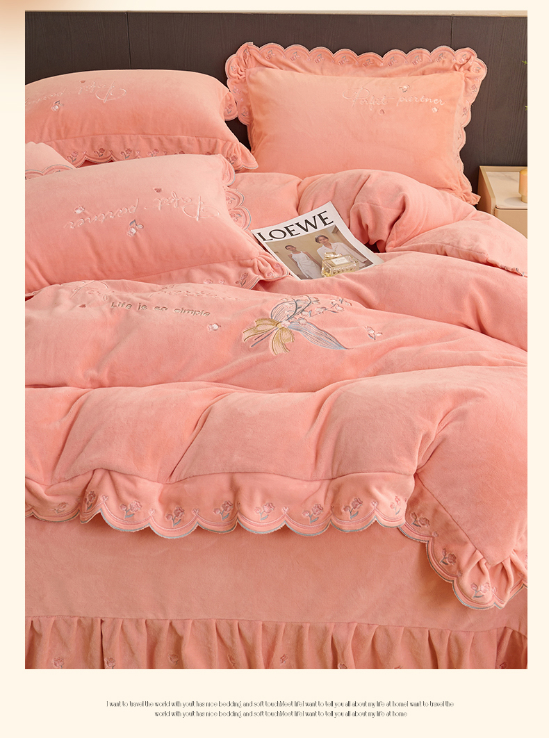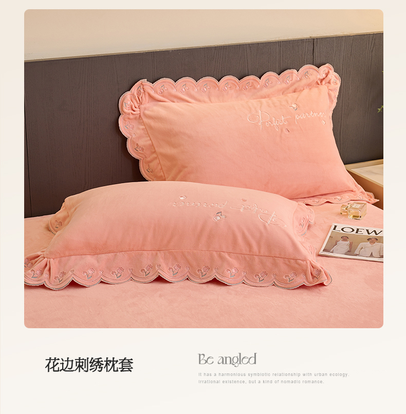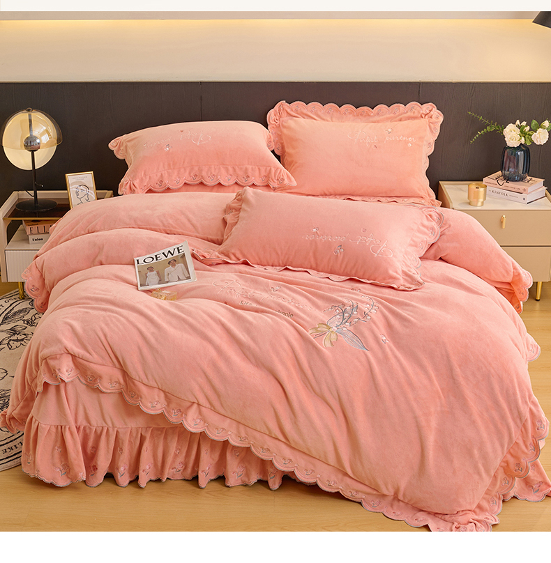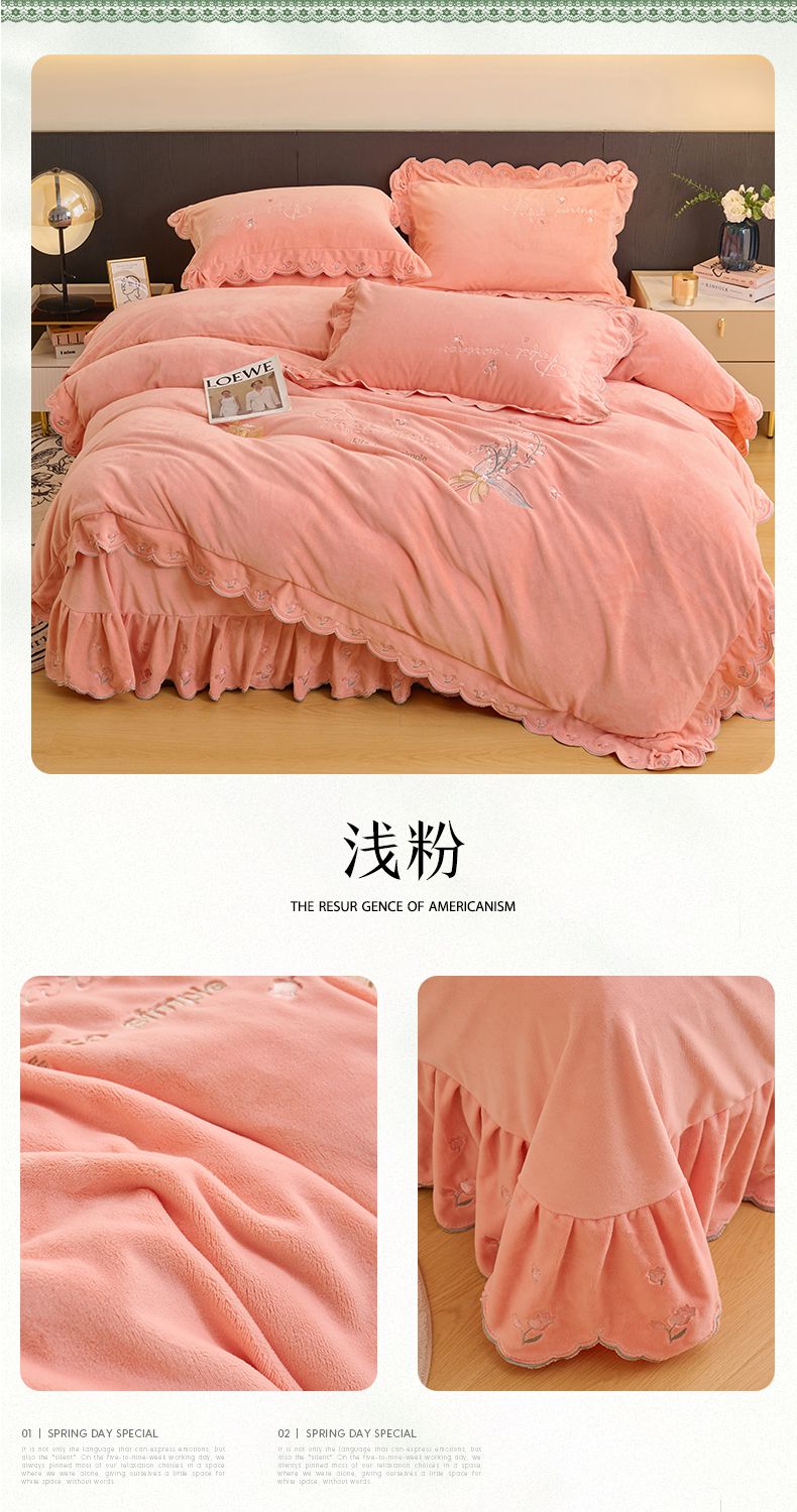 商品名称:恒爱2023新款加厚双面牛奶绒绣花花边款四件套-铃兰花 浅粉