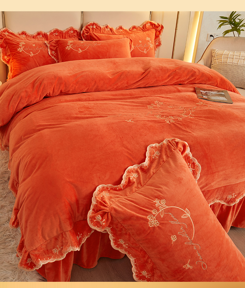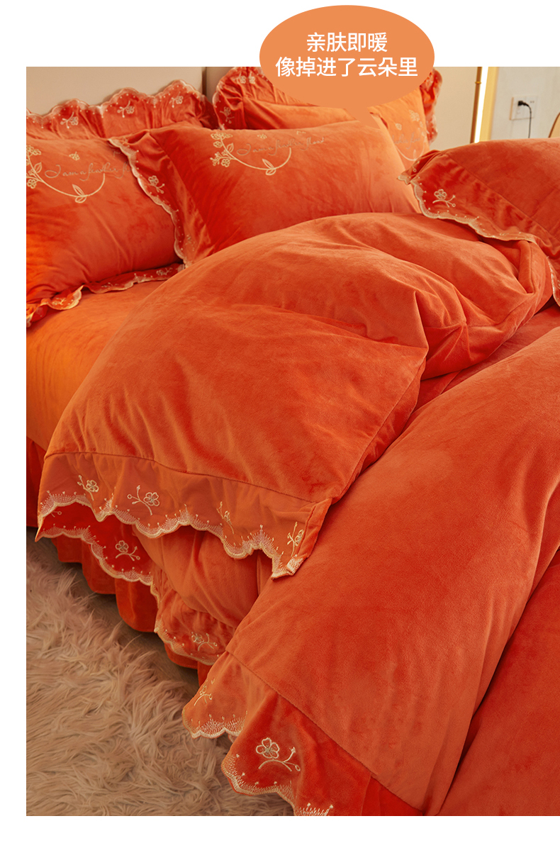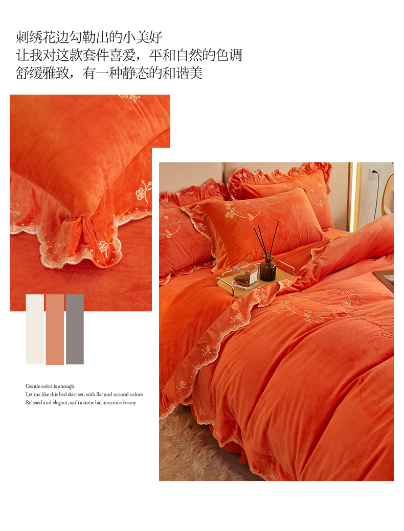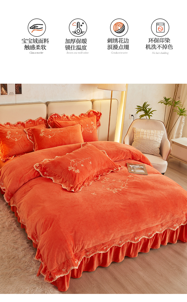 (总)恒爱 2022新款秋冬轻奢宝宝绒刺绣床裙款四件套,爱玛橙,宾利蓝,豆沙红,橄榄绿,高级灰,酒红,梦想粉,浅灰蓝,温馨粉,喜庆红,香妃粉,香芋紫