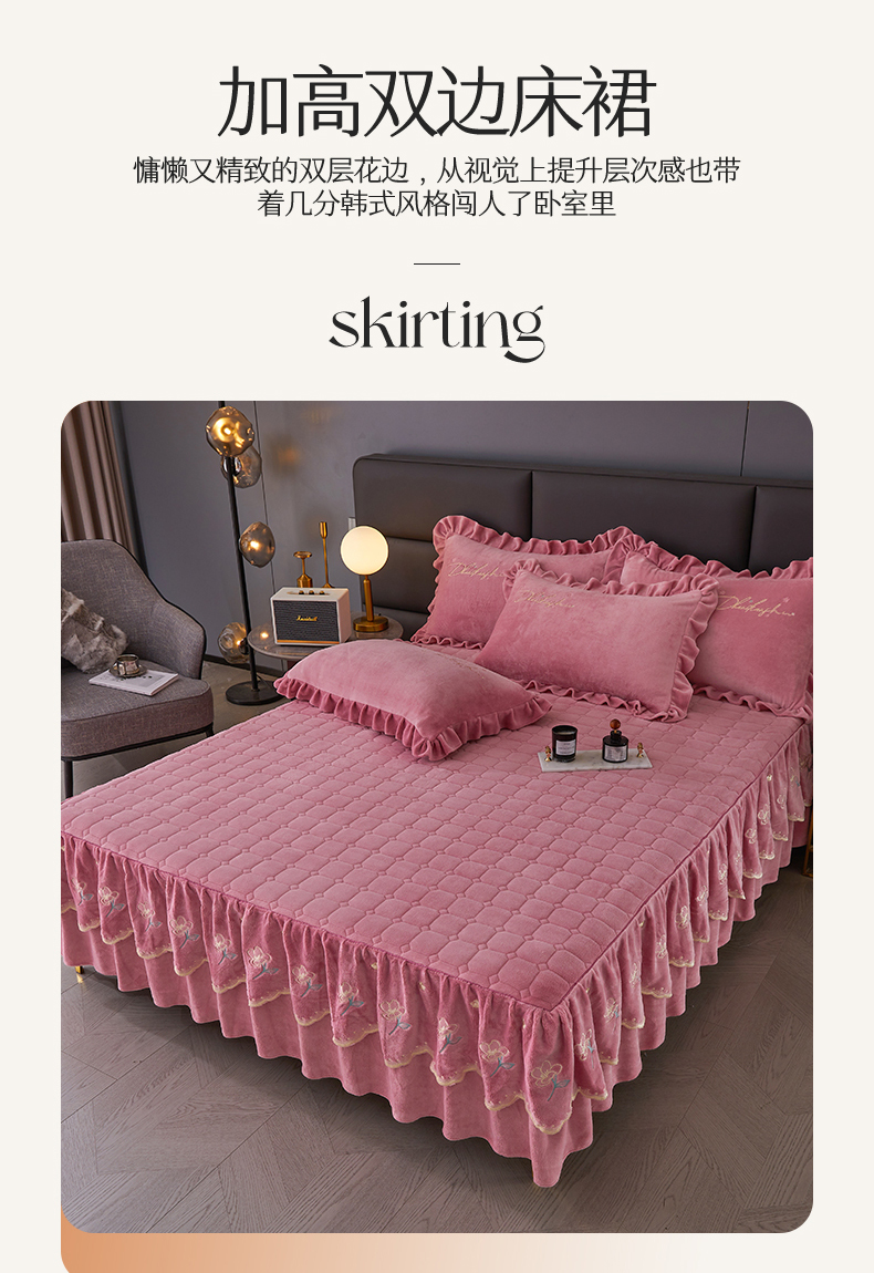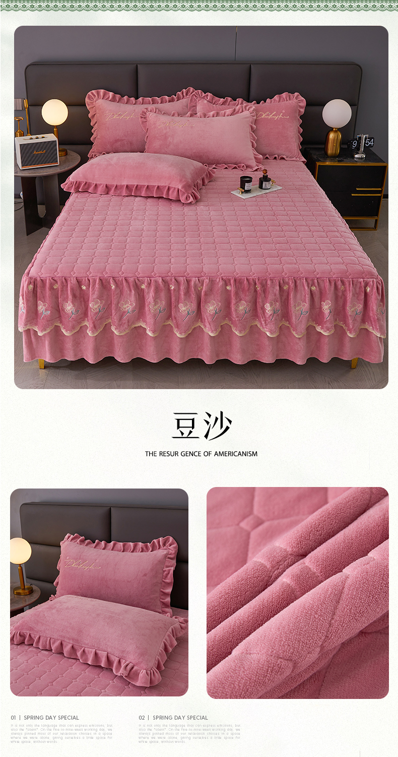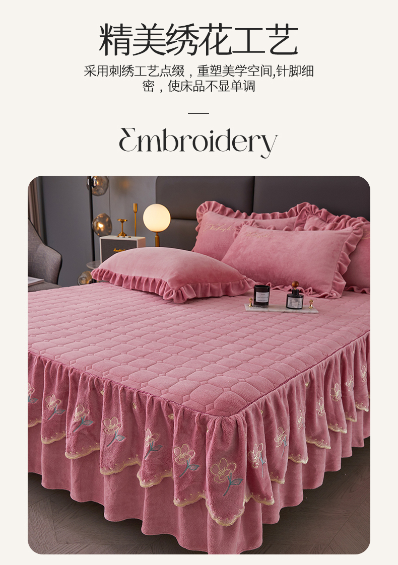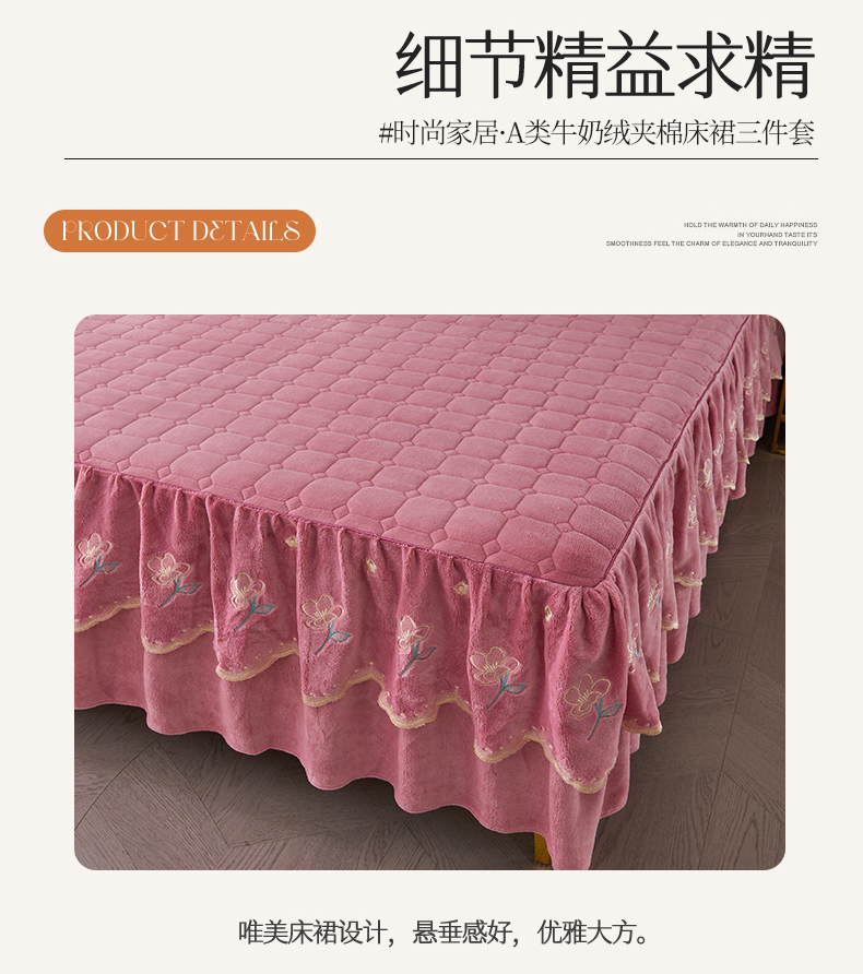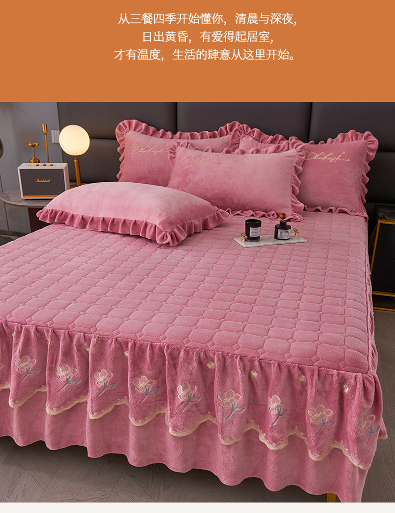 当前位置: 91家纺网 > 商品网购 > 床品套件 > 三件套 > 恒爱家纺 2023新款牡丹花开床裙牛奶绒三件套 豆沙