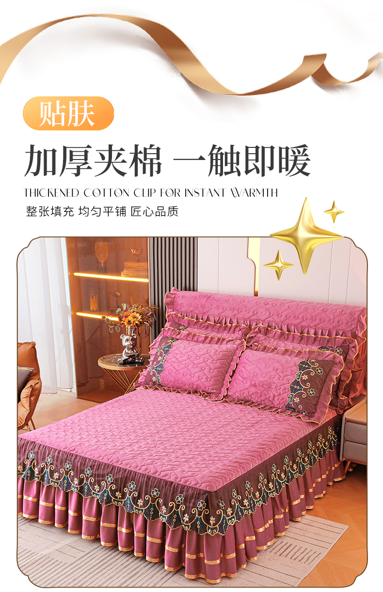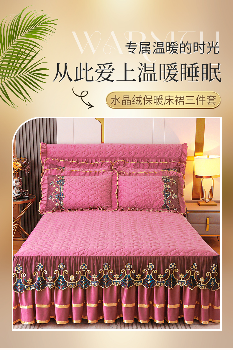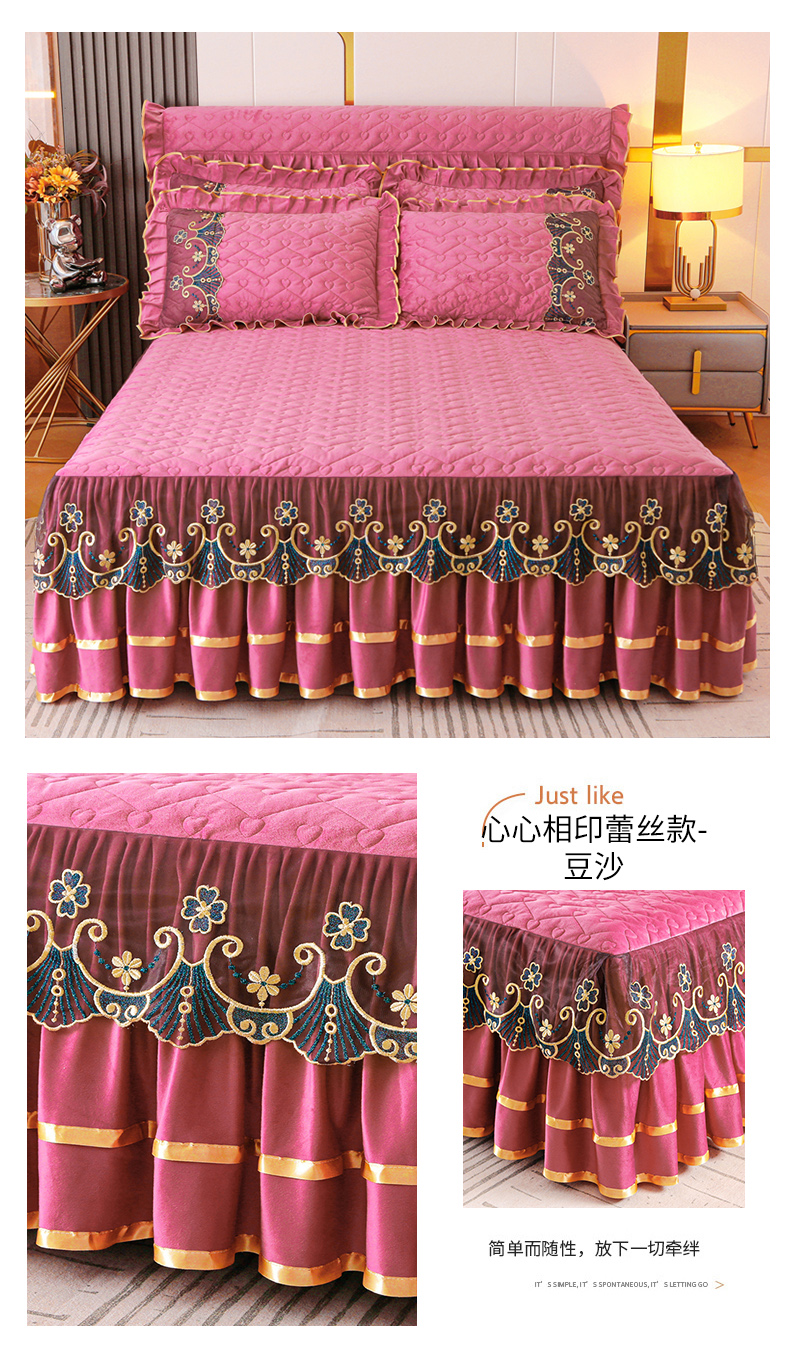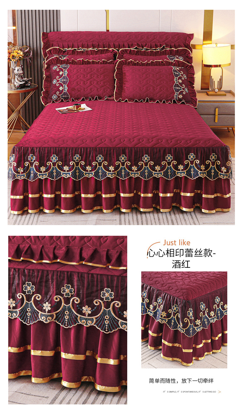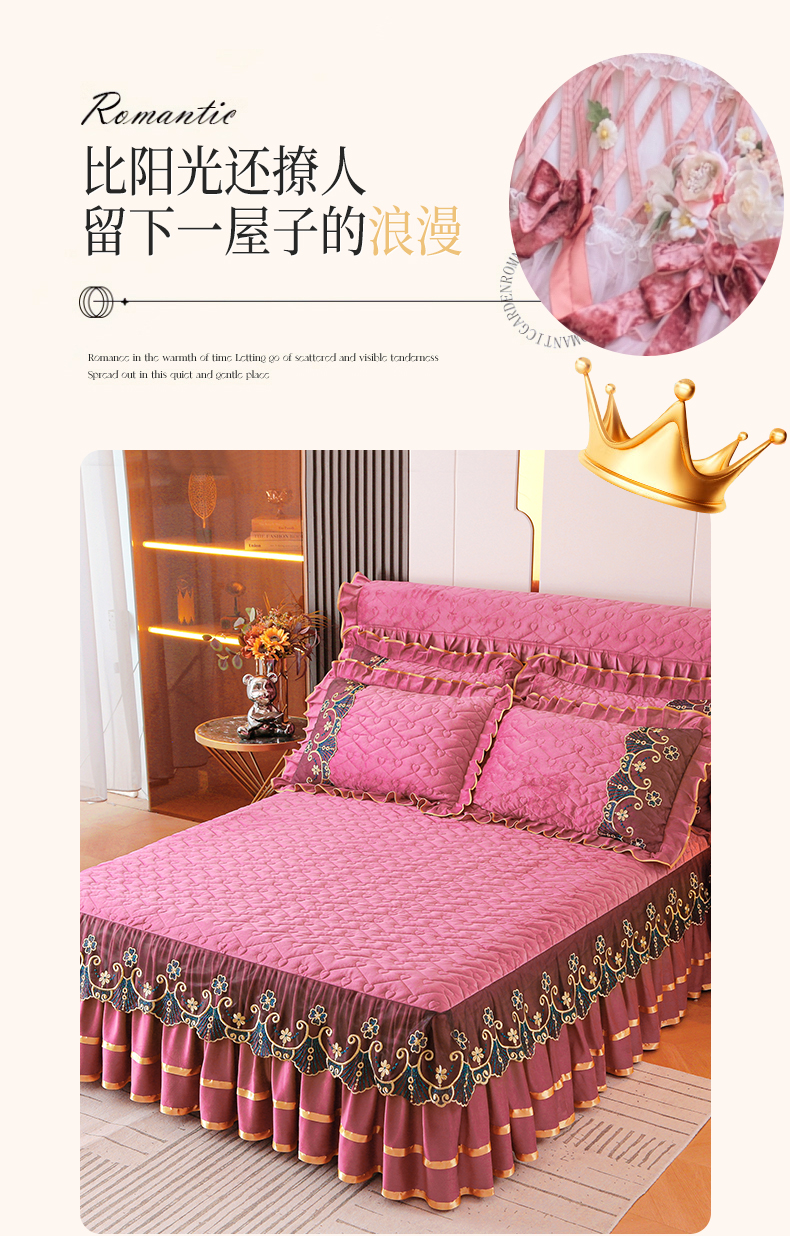 (总)屹成家纺2025新款水晶绒夹棉绗缝蕾丝床裙三件套(塞纳河畔)床裙单件起售价不低于105元,大红,豆沙,翡翠绿,粉玉,橄榄绿,蔚蓝,银灰