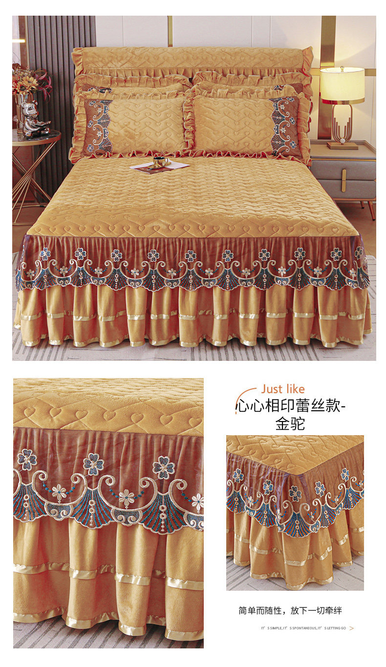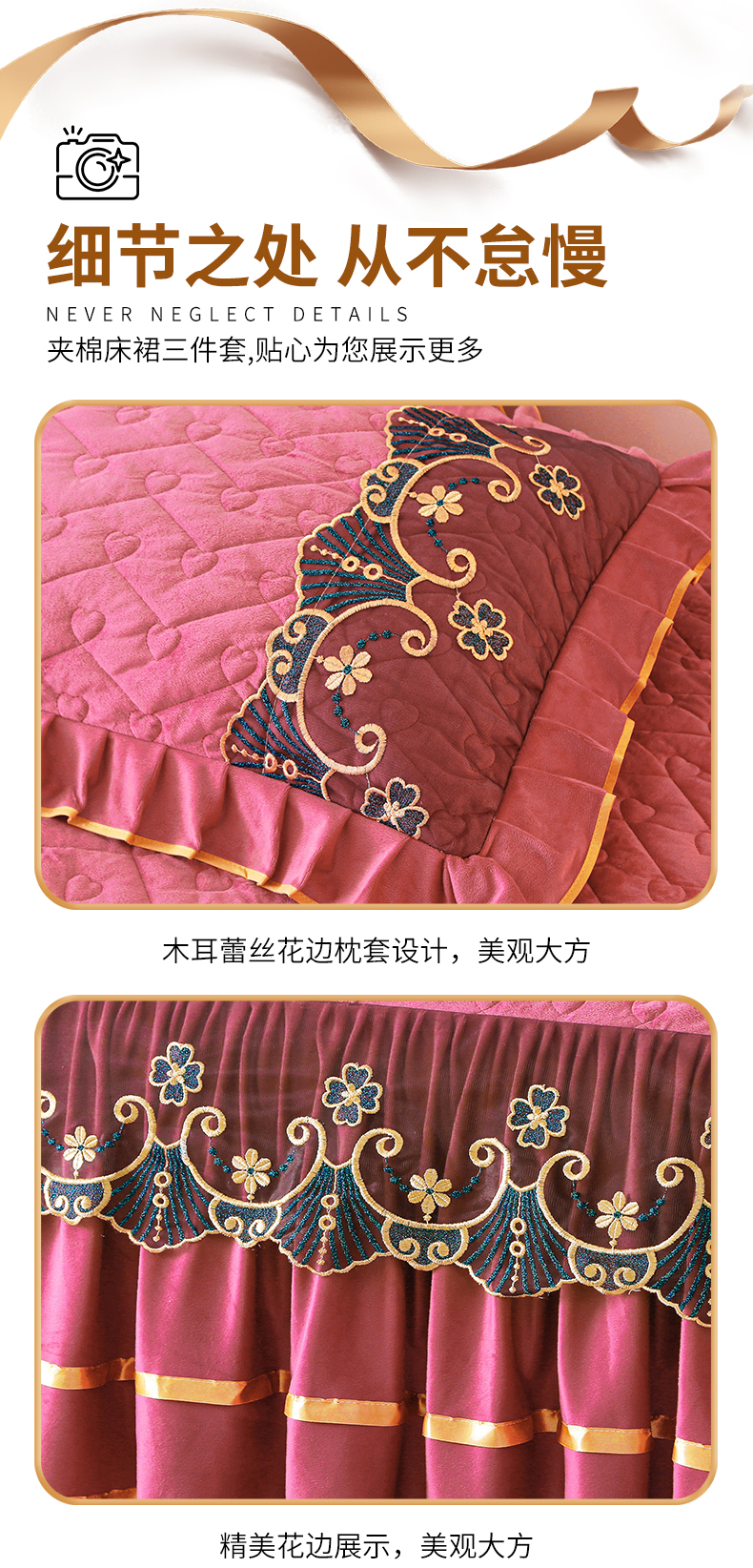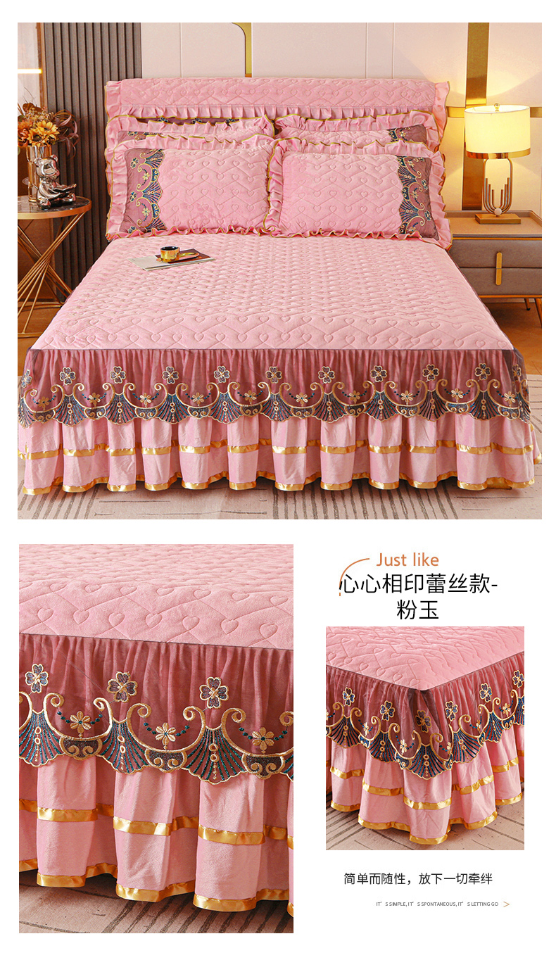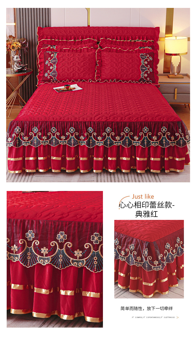 (总)屹成家纺2025新款水晶绒夹棉绗缝蕾丝床裙三件套(塞纳河畔)床裙单件起售价不低于105元,大红,豆沙,翡翠绿,粉玉,橄榄绿,蔚蓝,银灰