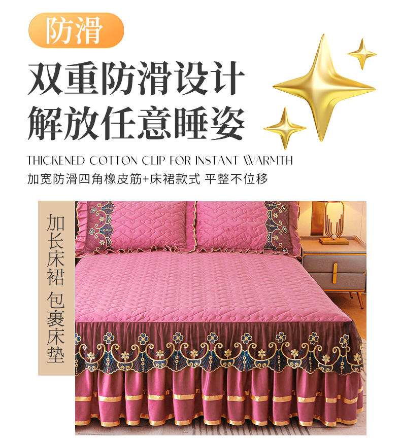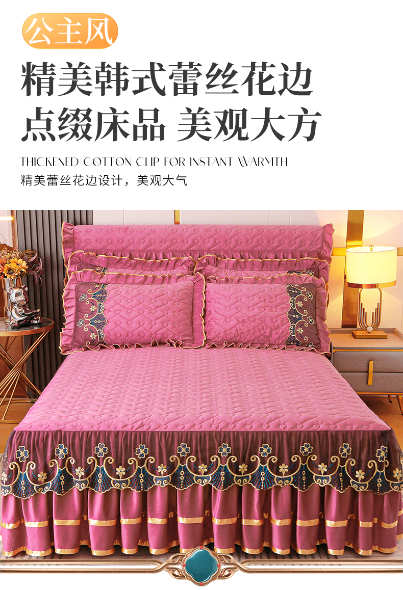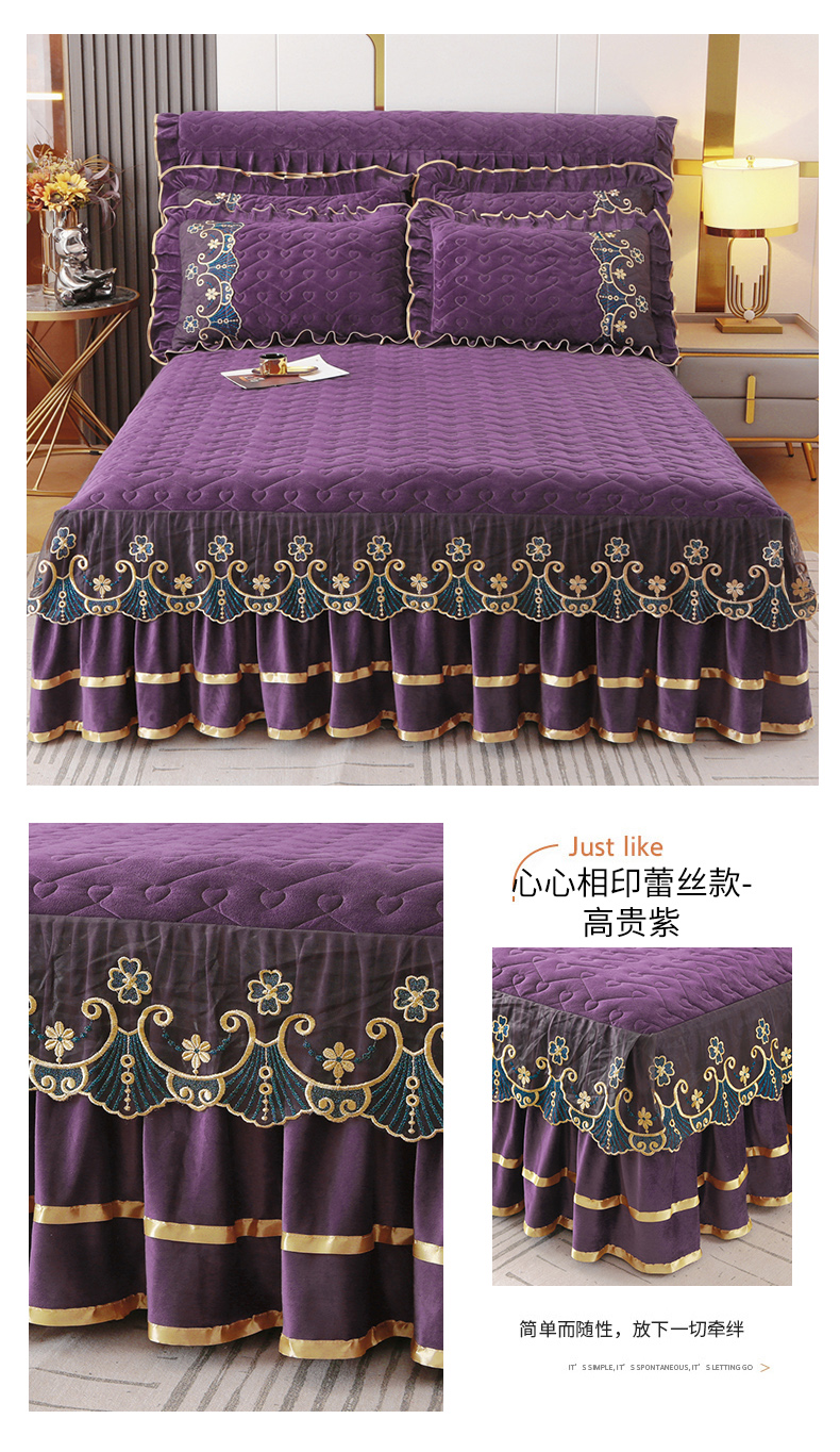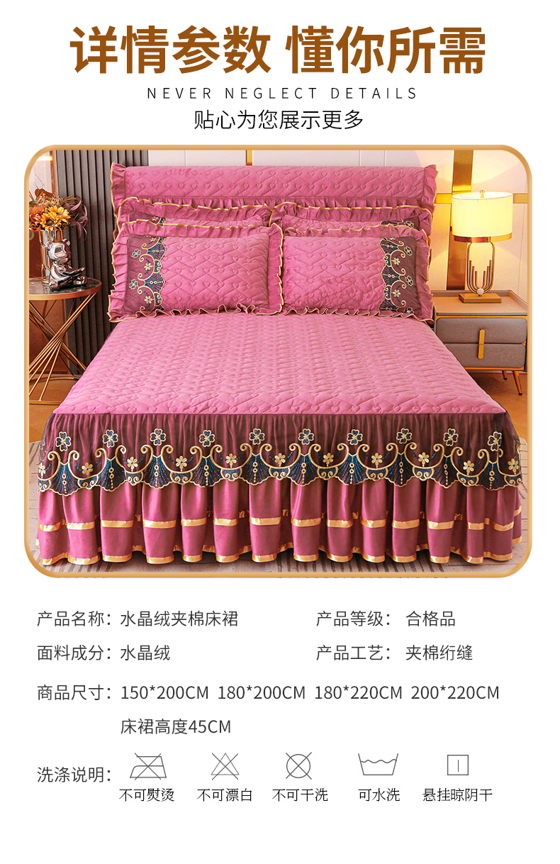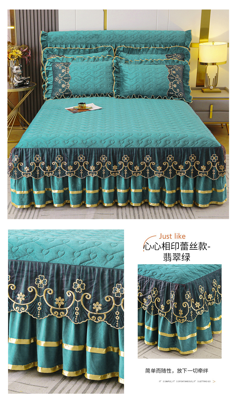 (总)屹成家纺2025新款水晶绒夹棉绗缝蕾丝床裙三件套(塞纳河畔)床裙单件起售价不低于105元,大红,豆沙,翡翠绿,粉玉,橄榄绿,蔚蓝,银灰
