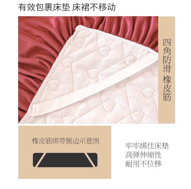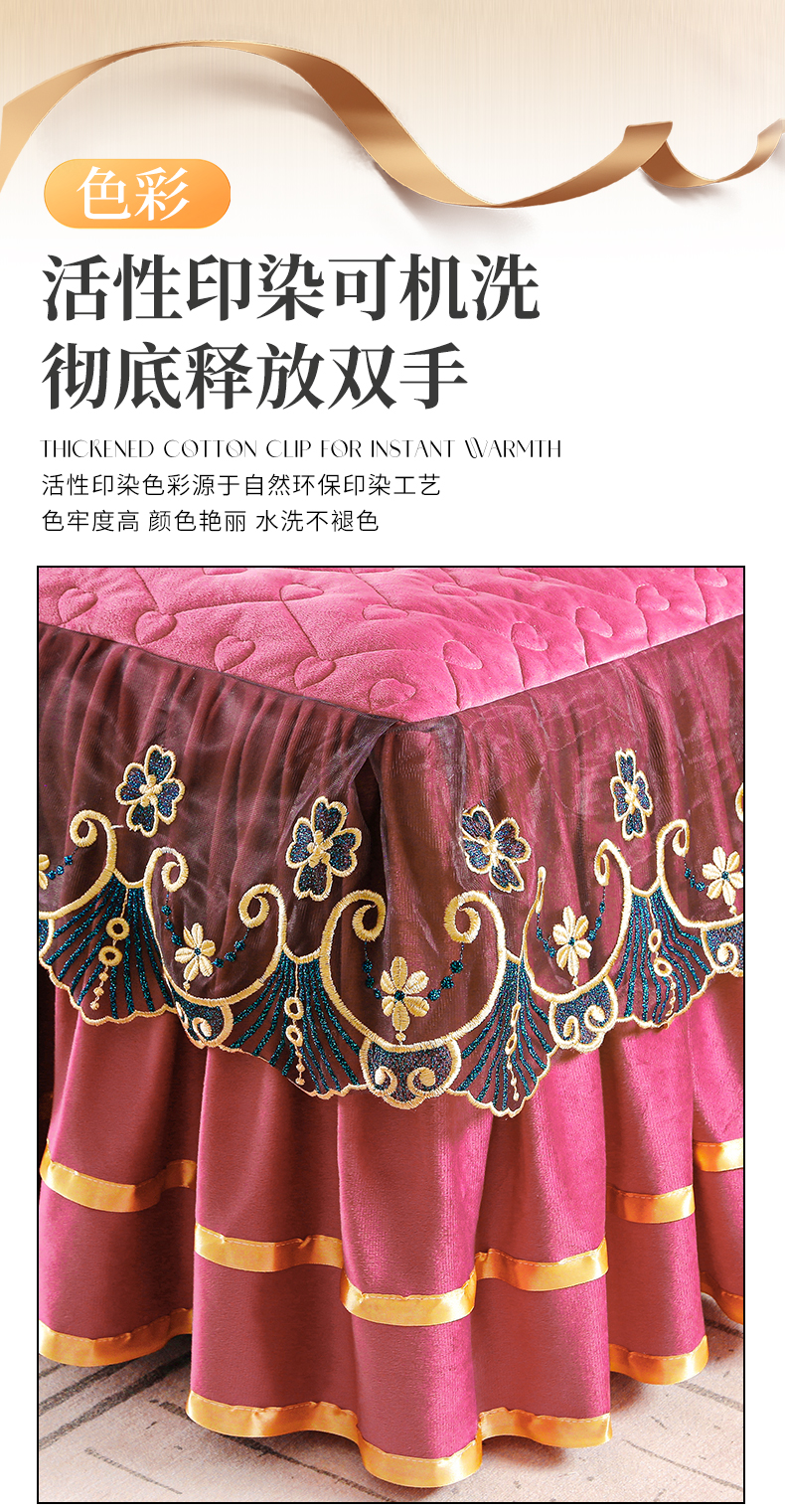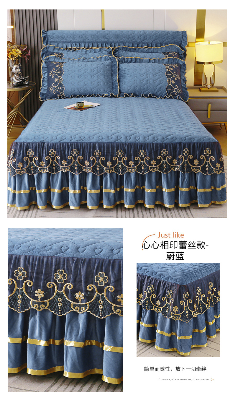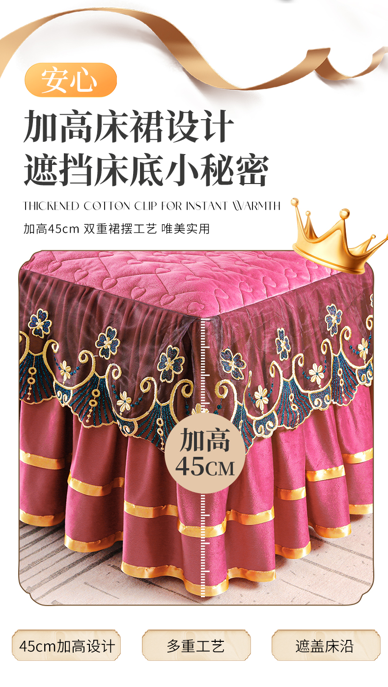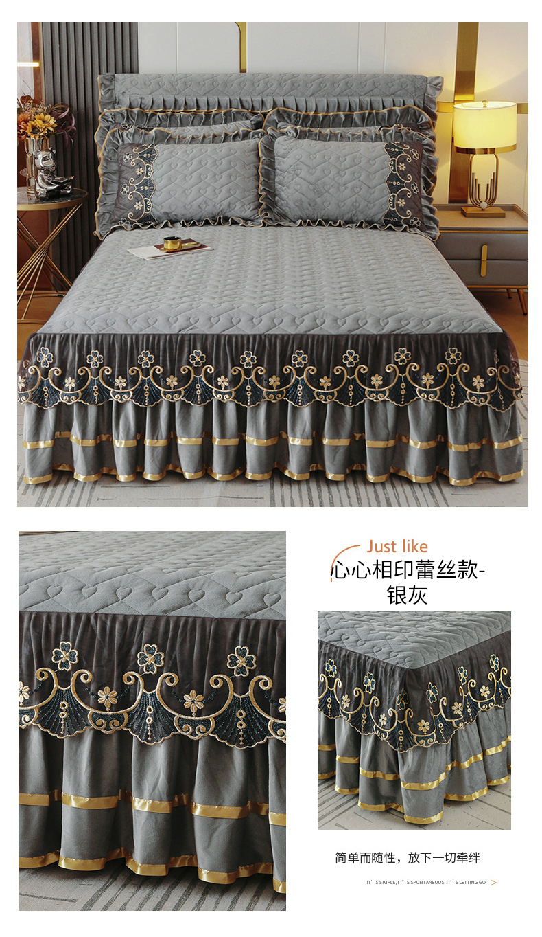 (总)屹成家纺2025新款水晶绒夹棉绗缝蕾丝床裙三件套(塞纳河畔)床裙单件起售价不低于105元,大红,豆沙,翡翠绿,粉玉,橄榄绿,蔚蓝,银灰