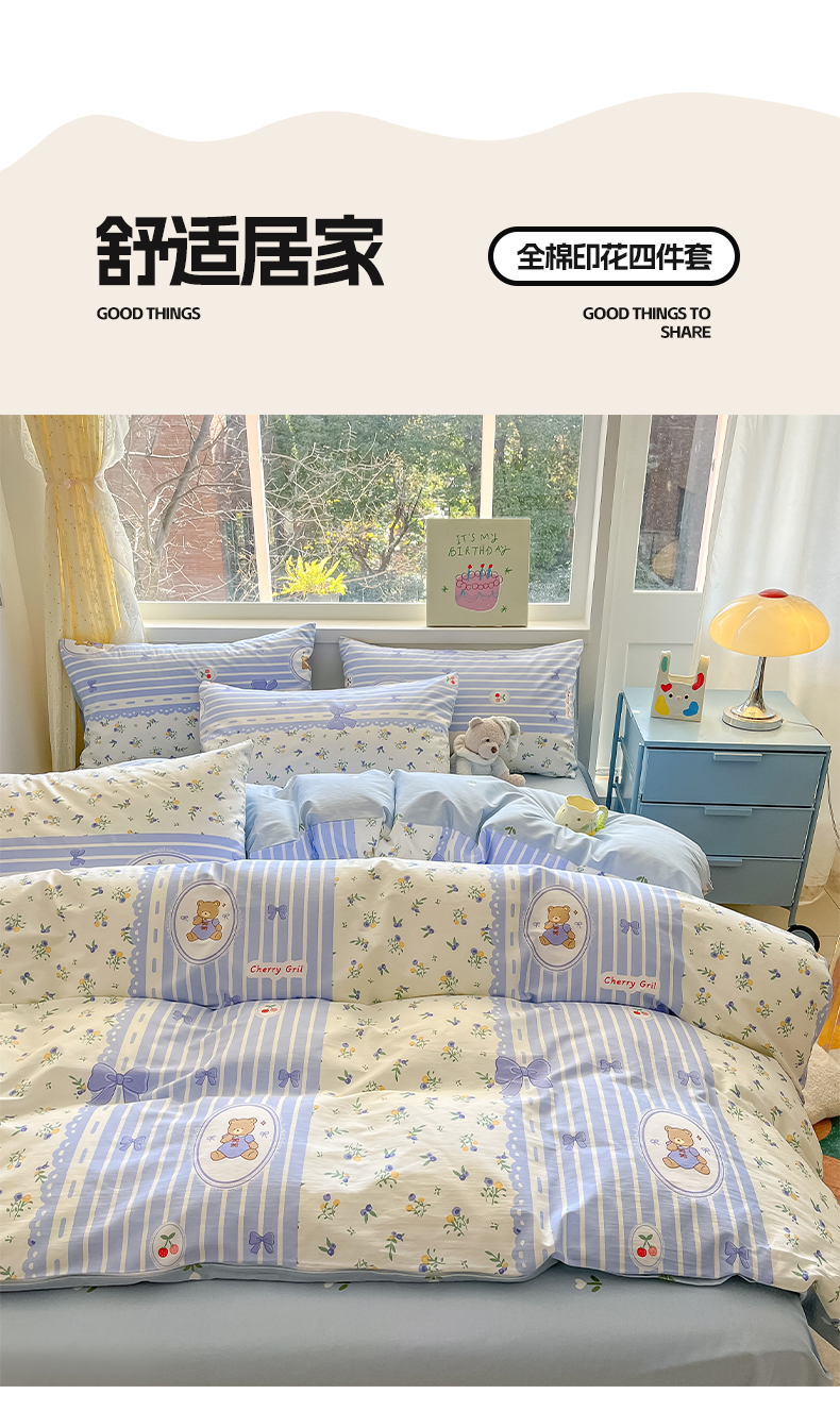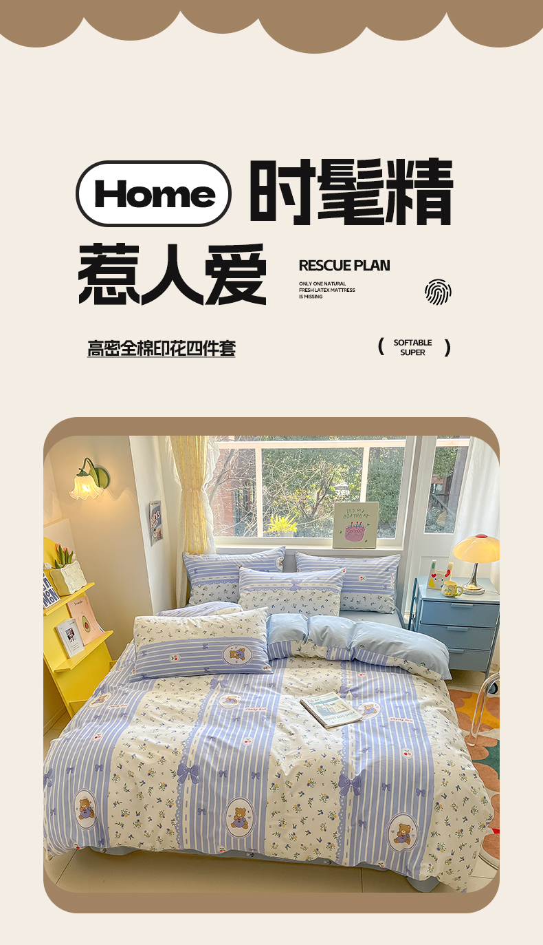 雅居纺 2024新款高密全棉13070印花四件套 兰花熊