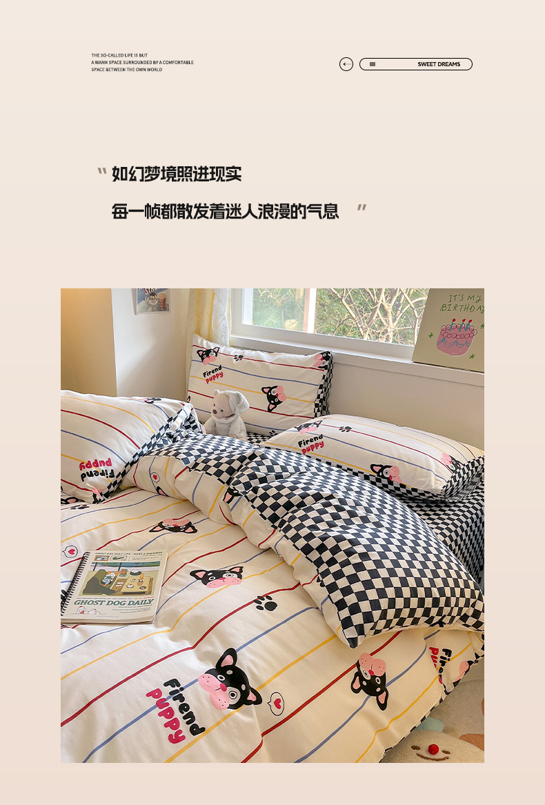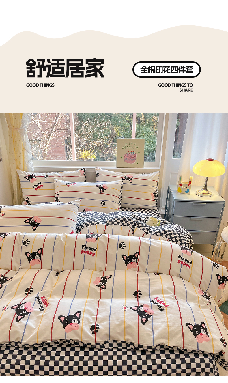 (总)雅居纺家纺 2026新款全棉小清新印花四件套,HI小狗,暴富,草莓蓝花,粉色熊熊,红红火火,简笔画小兔,蓝条花朵兔,绿色小兔,森林乐园,绅士快乐狗,贪睡猫猫,贪玩家族,贪玩小兔兔,祥瑞,小黑猫咪,幸福花朵,幸福兔-蓝,熊熊小汽车,紫色千鸟格