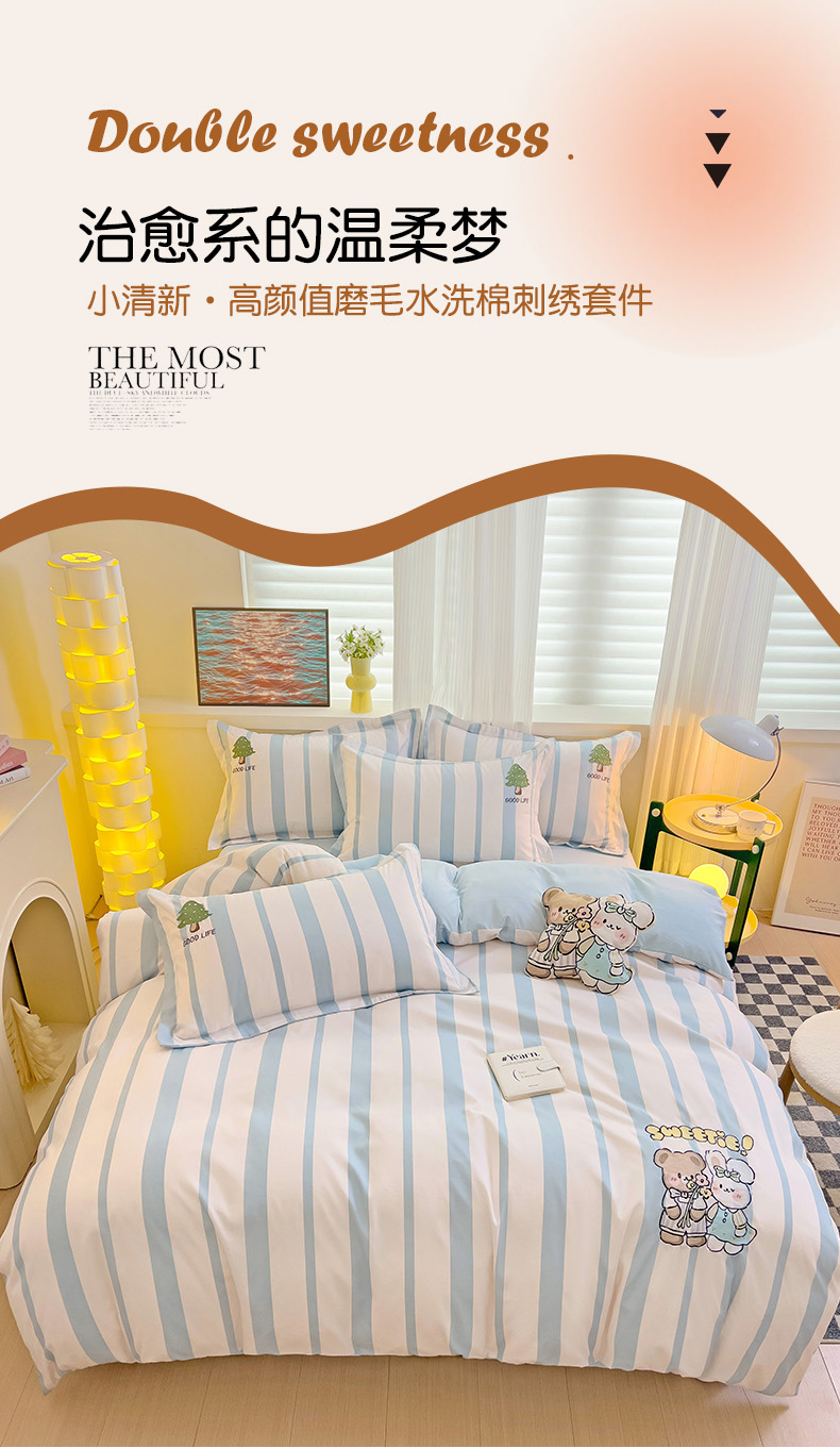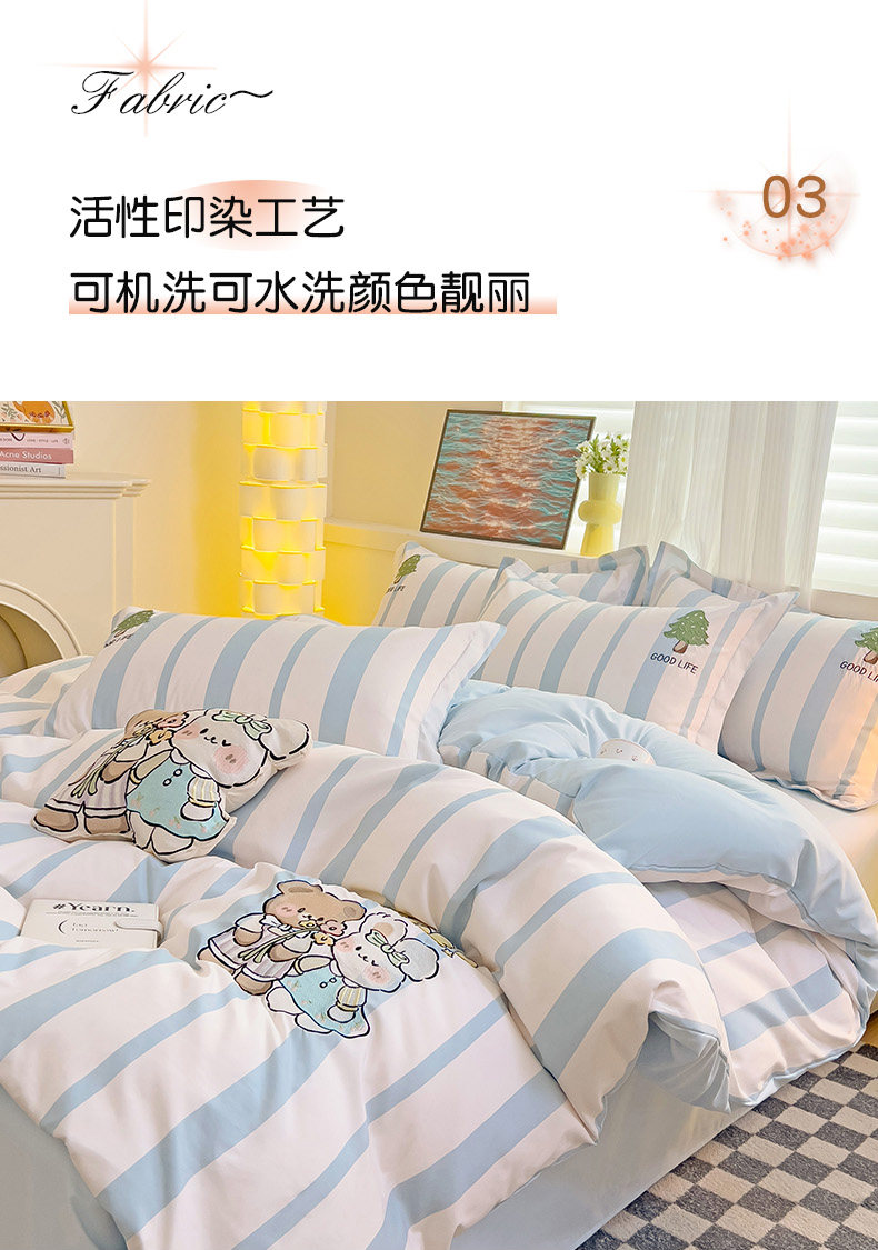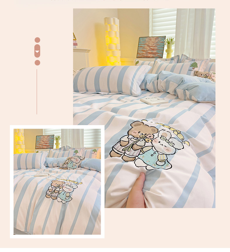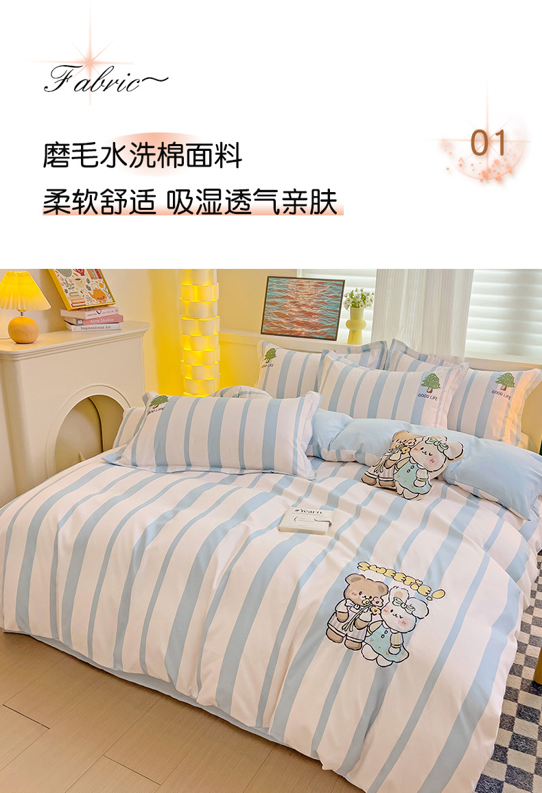 当前位置: 91家纺网 > 商品网购 > 床品套件 > 四件套 > 普通磨毛四件套 > 娜娜 2024新款磨毛水洗棉刺绣四件套 快乐伙伴-蓝