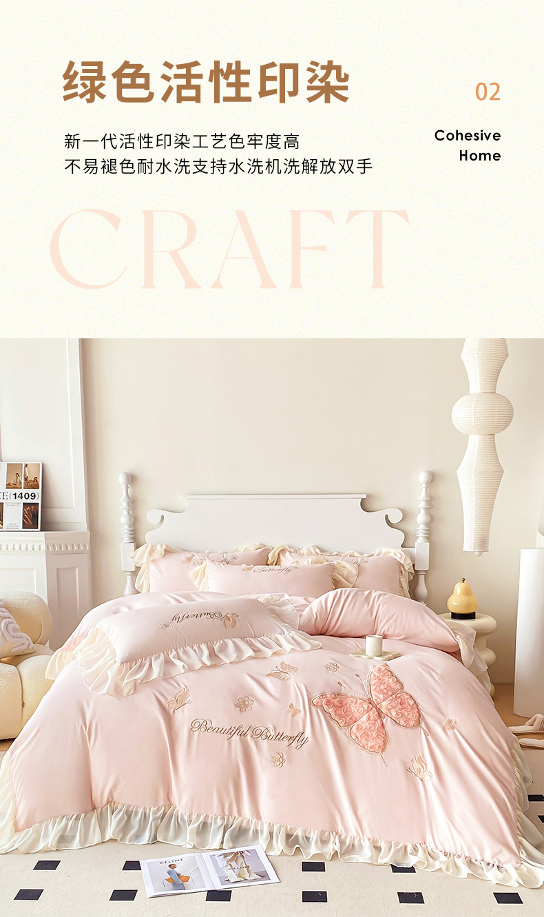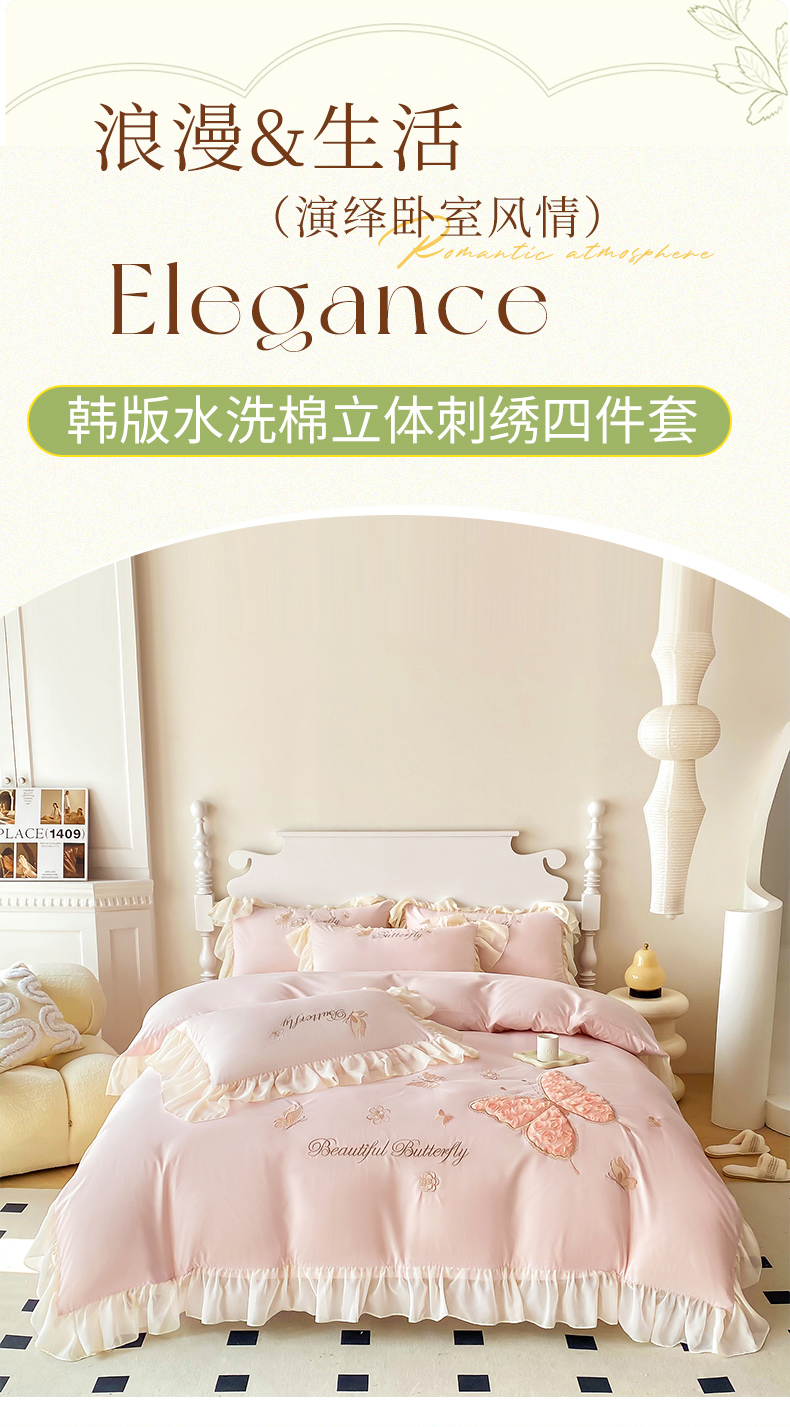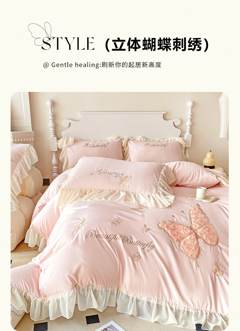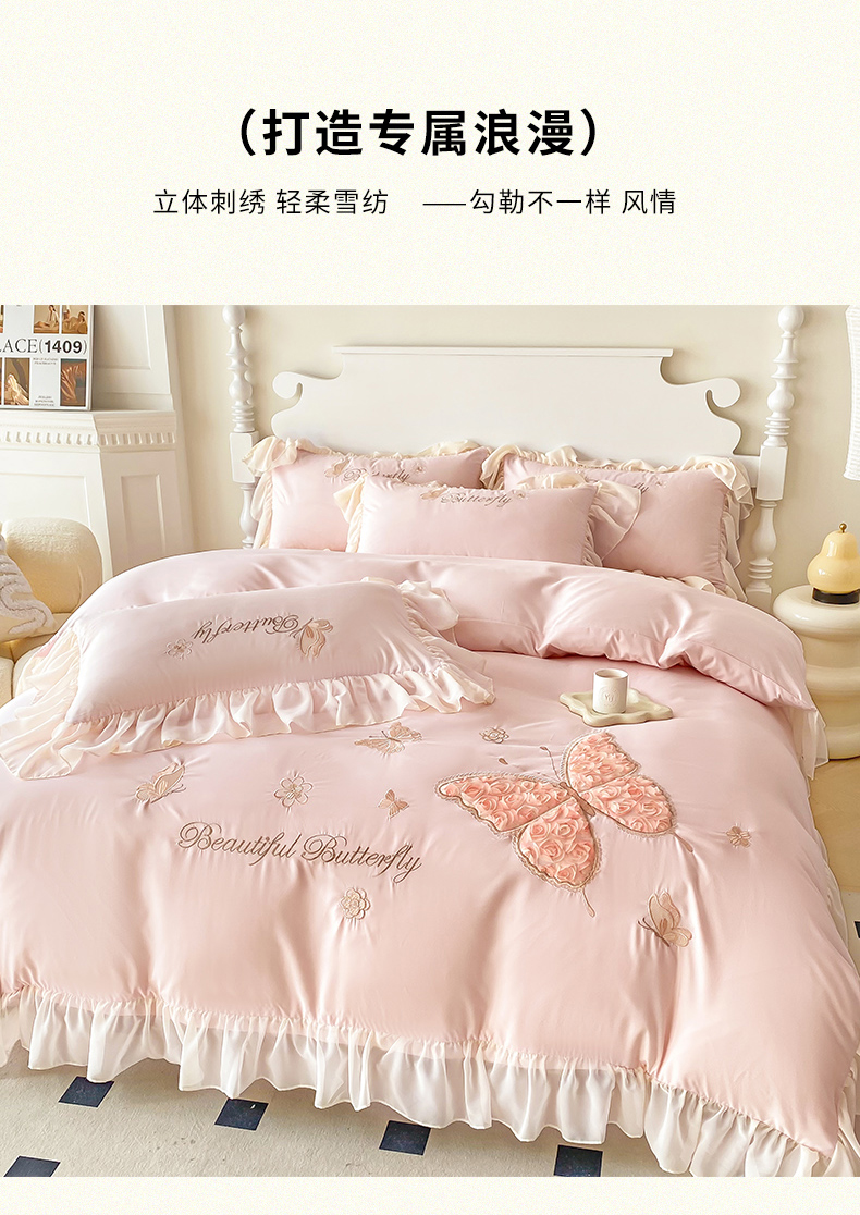 富盛 2024新款水洗亲肤棉立体刺绣四件套公主风四件套-蝴蝶系列 蝴蝶-粉