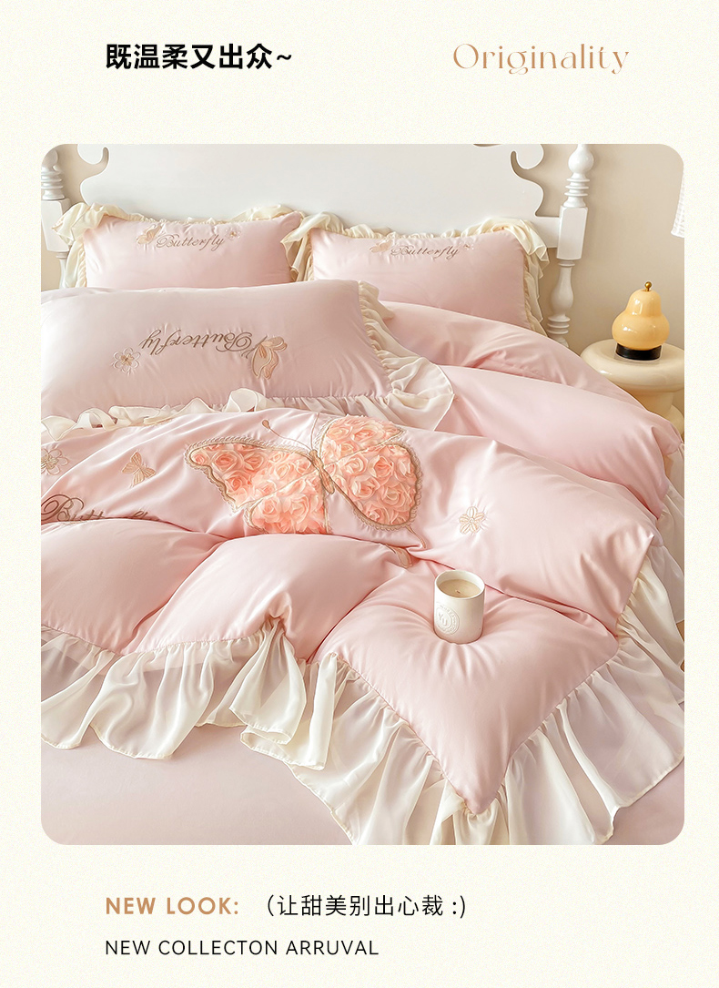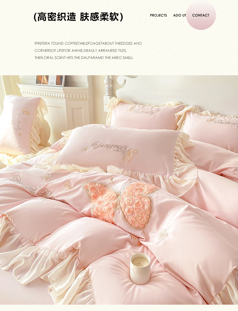 商品名称:富盛 2024新款水洗亲肤棉立体刺绣四件套公主风四件套-蝴蝶系列 蝴蝶-粉