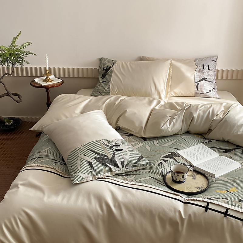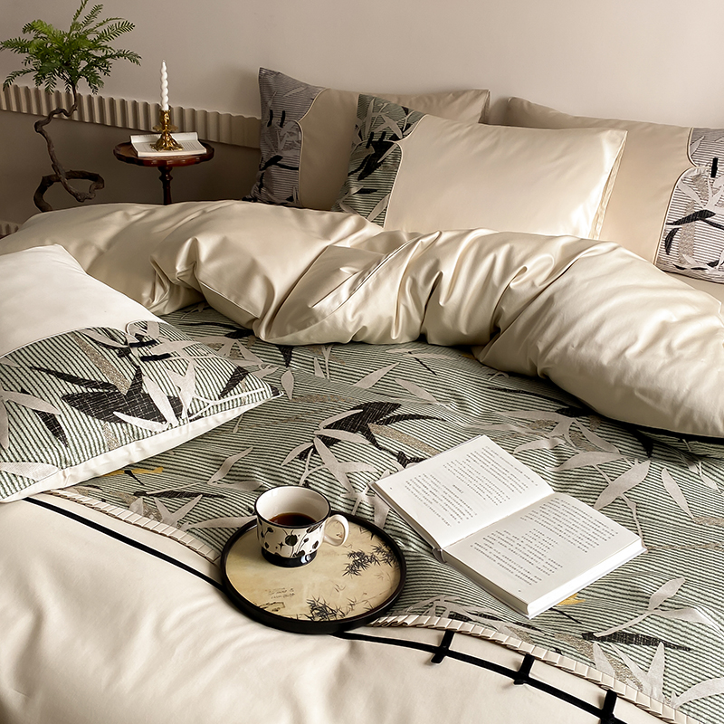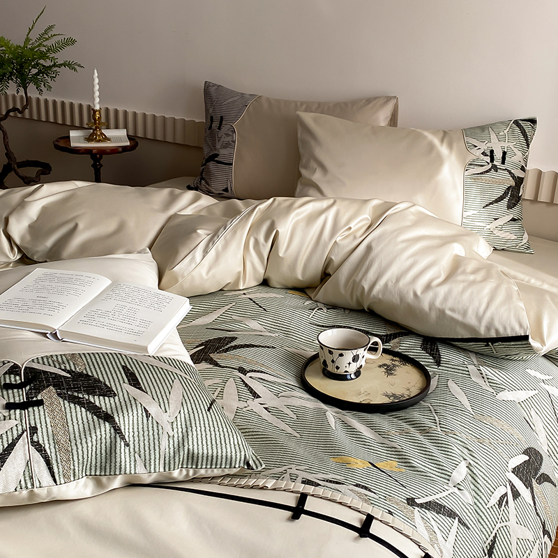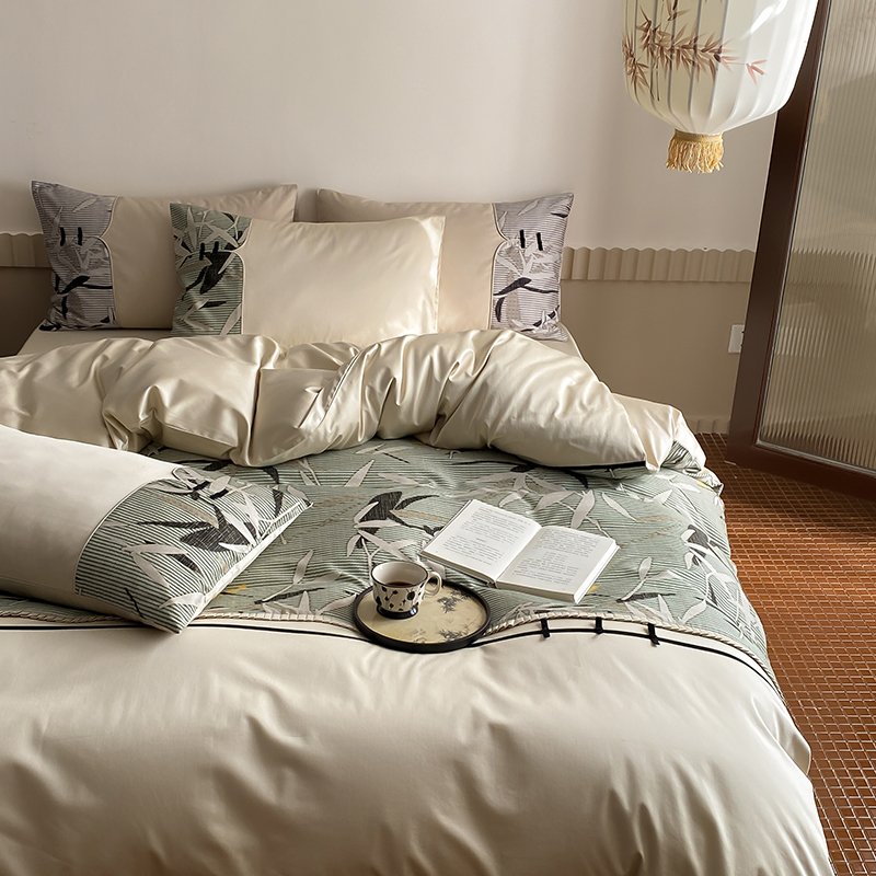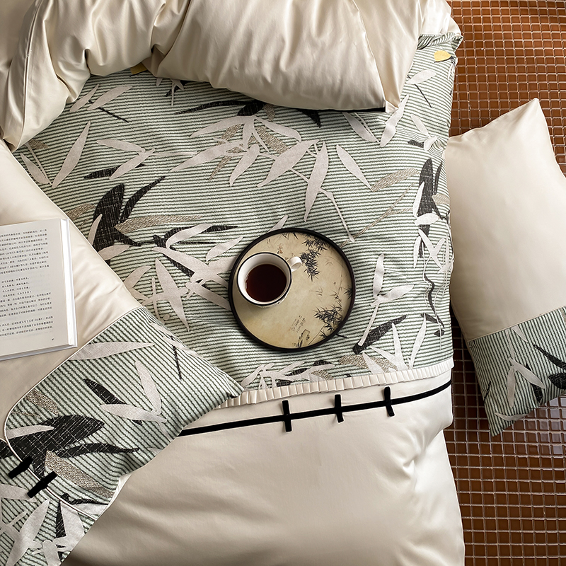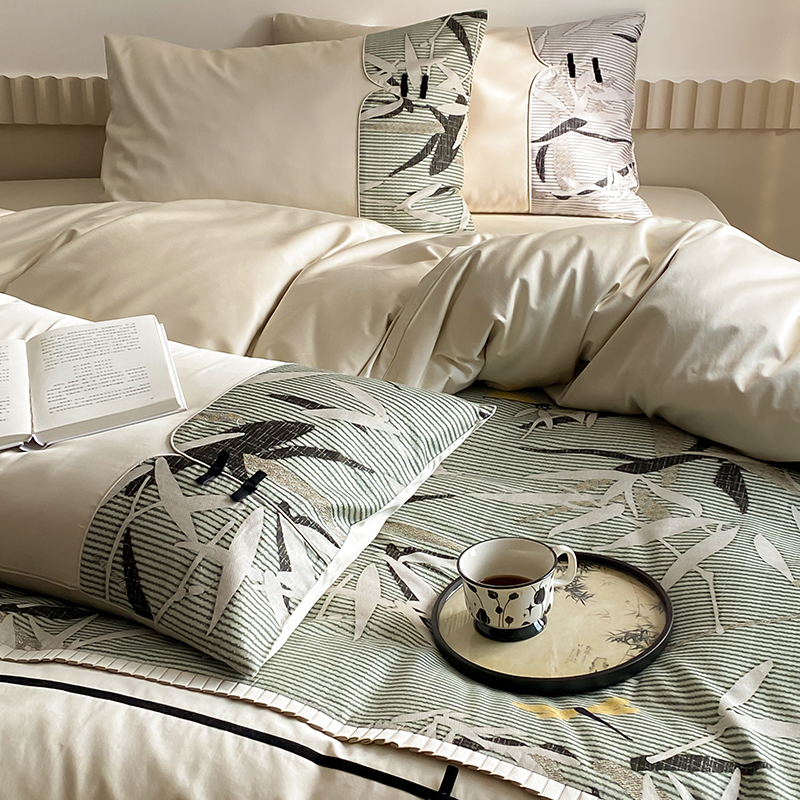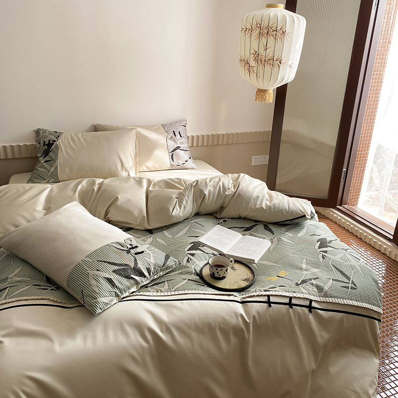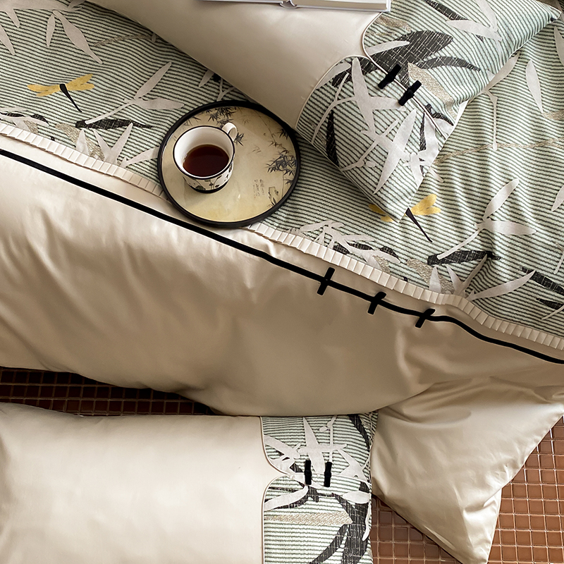 赫帛 2024新款50s缎纹数码印花长绒棉四件套--竹韵系列 竹韵-绿色