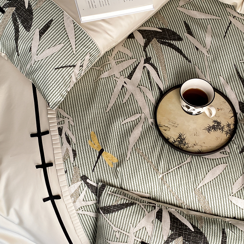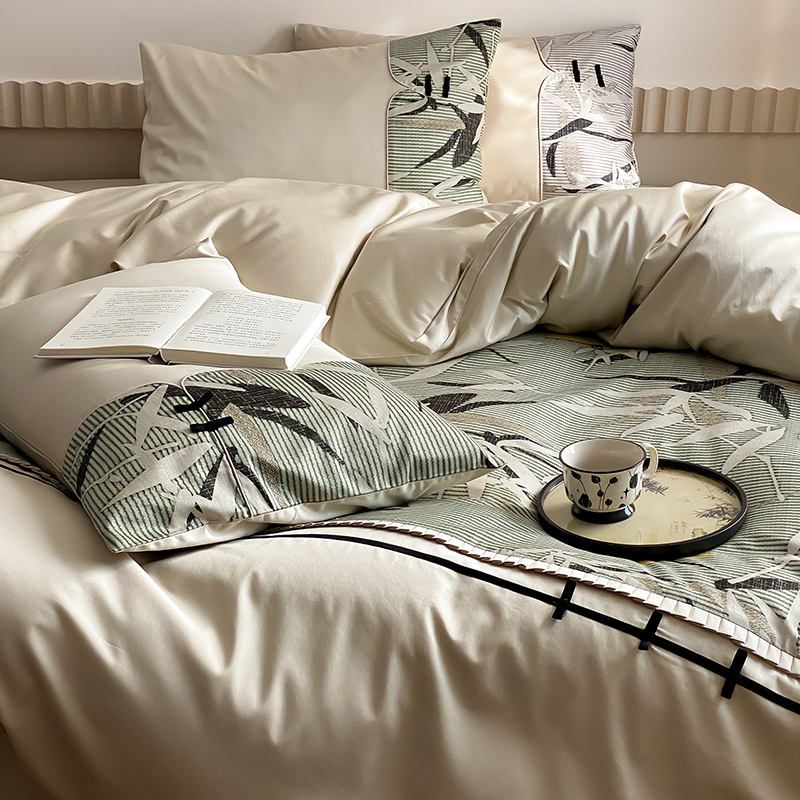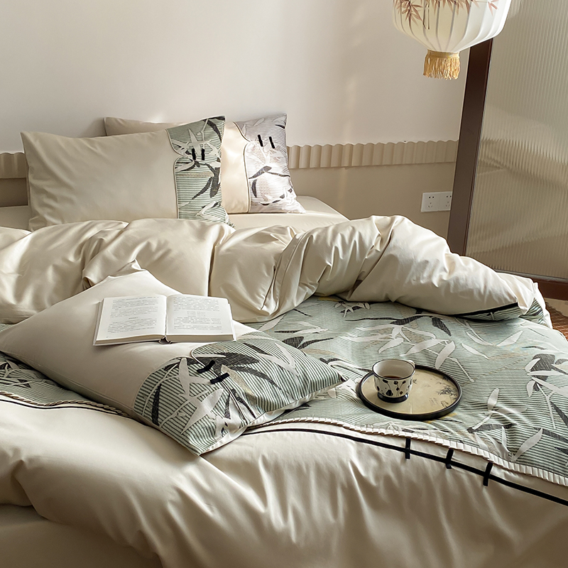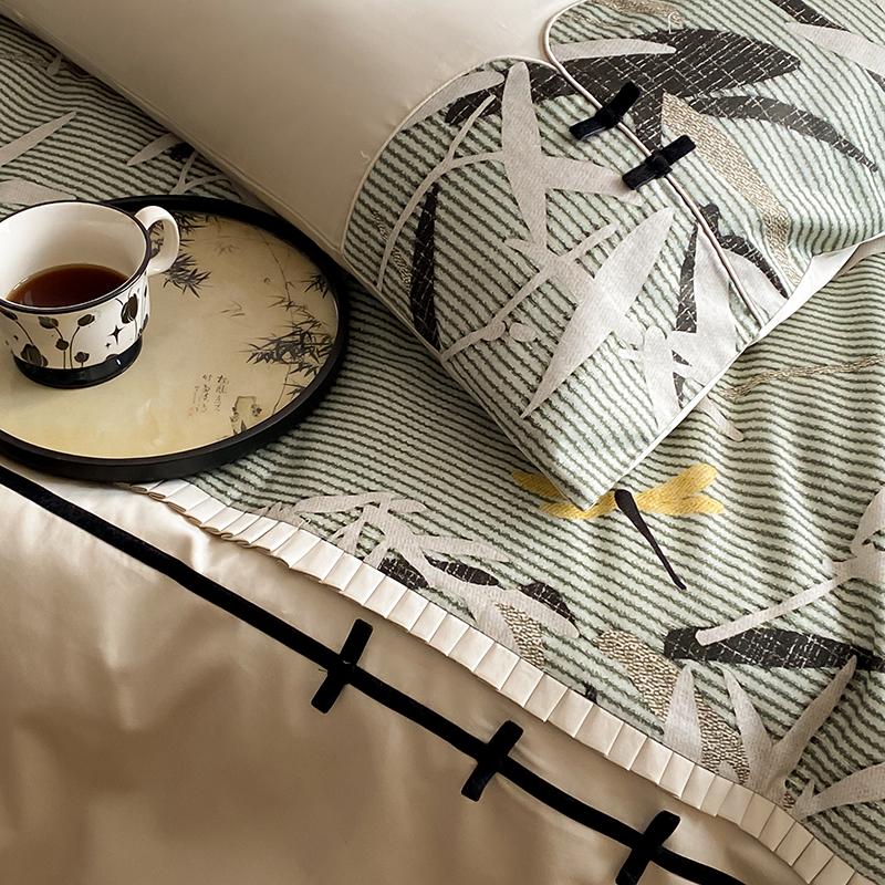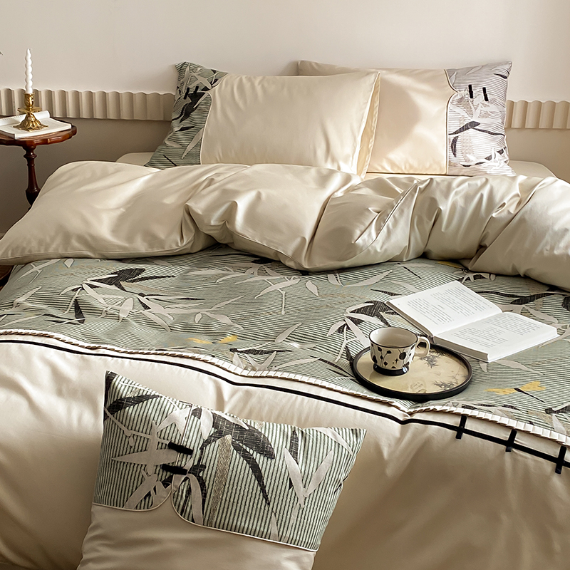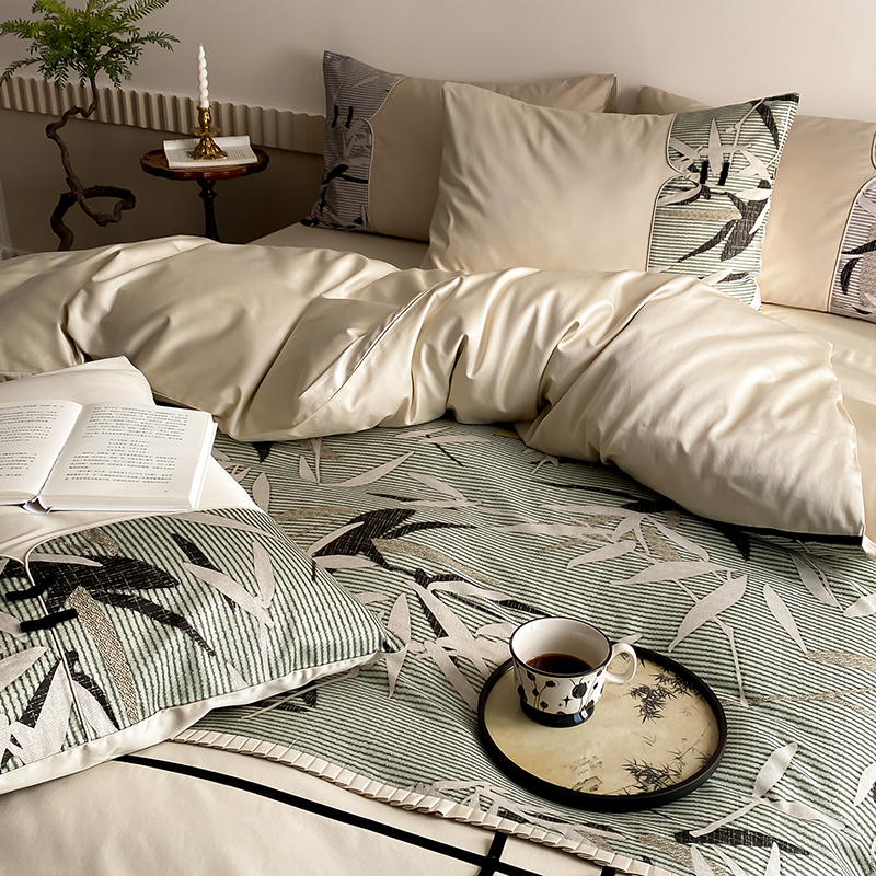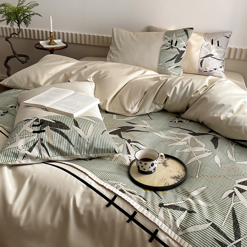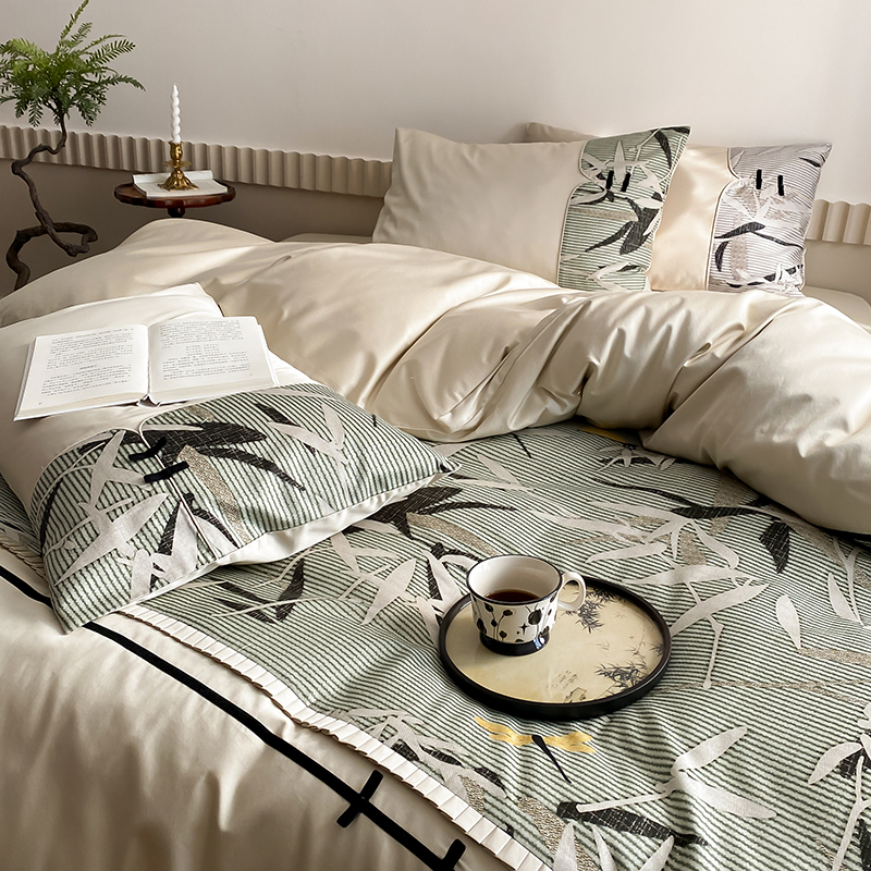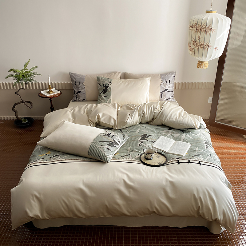 赫帛 2024新款50s缎纹数码印花长绒棉四件套--竹韵系列 竹韵-绿色