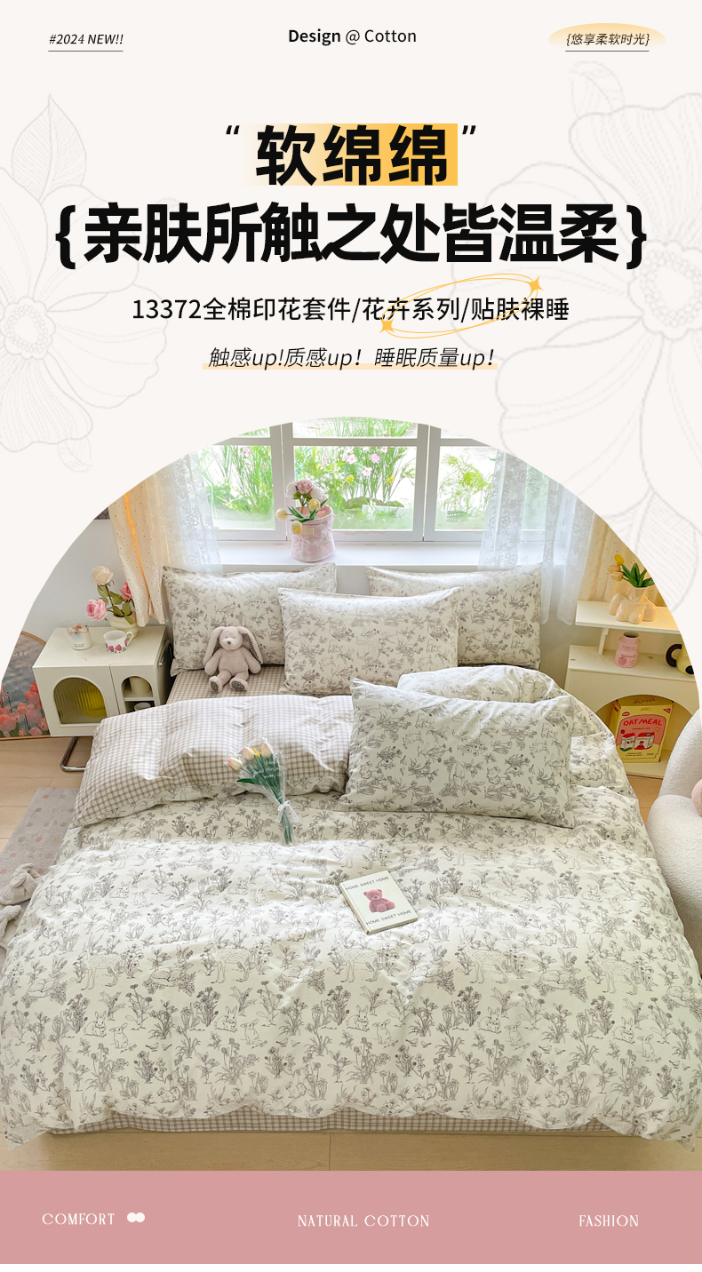 (总)芊寻家居 2024年新款全棉印花13372四件套,都市圈,红玫瑰,锦瑟,妙语花香,蘑菇兔,慕颜,优雅生活 灰,优雅生活 米,屋顶花园,秋硕,思恋白,思恋蓝,悉尼,夏恋,菲菲兔,赫本,简约,许愿兔,菲格拉,绽放,布鲁斯,方程式,极简生活,经典回味,米兰的春天,美杜莎,秋色宜人,泰迪熊,寻梦,印象派,画莓,交响曲