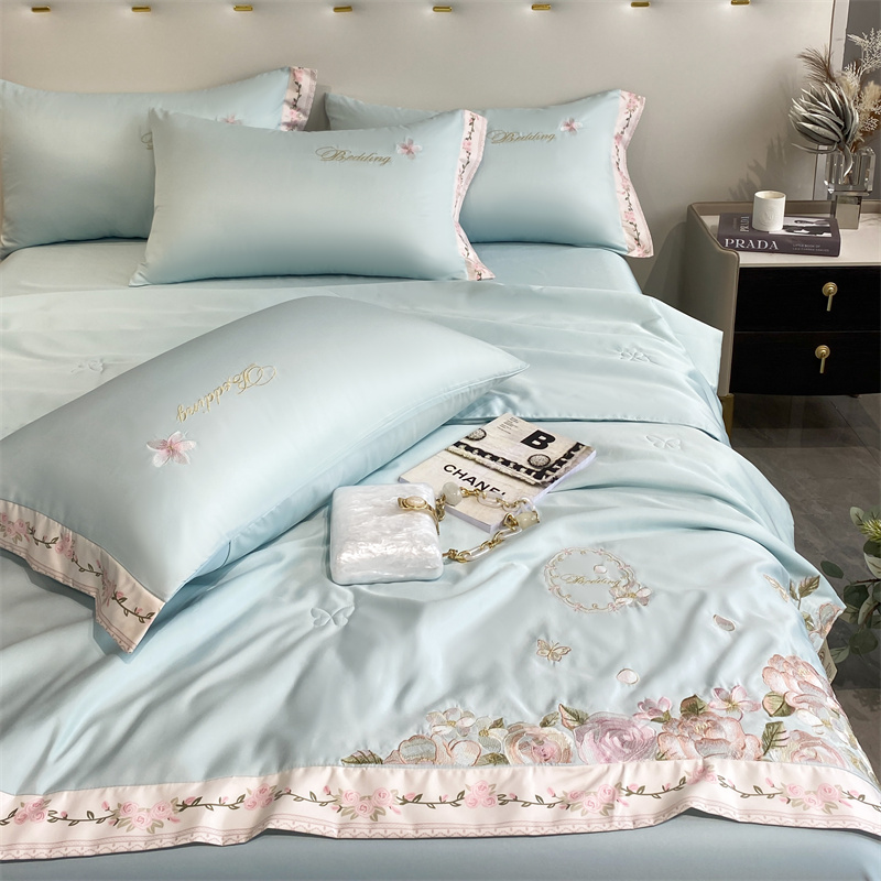 2024新款燕窝蛋白刺绣A类雪莲天丝数码边夏被四件套 水蓝