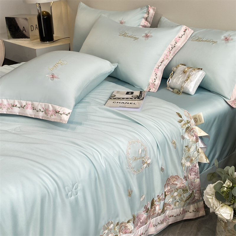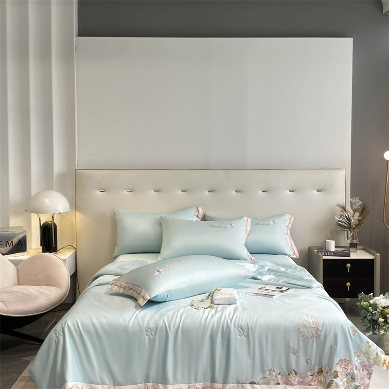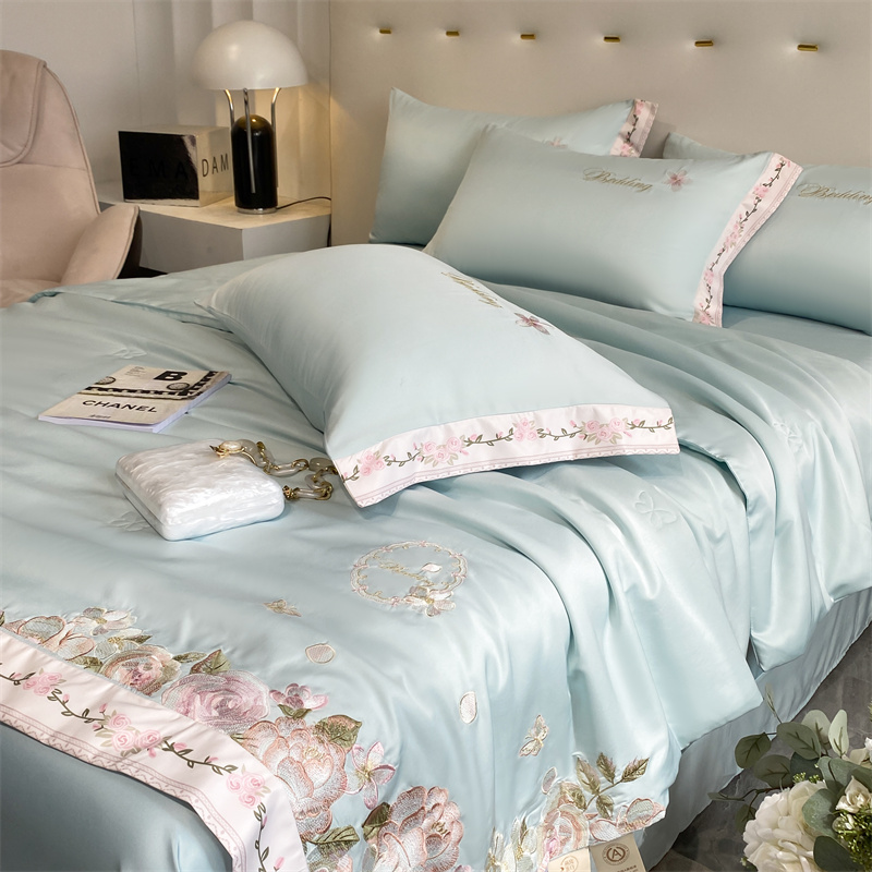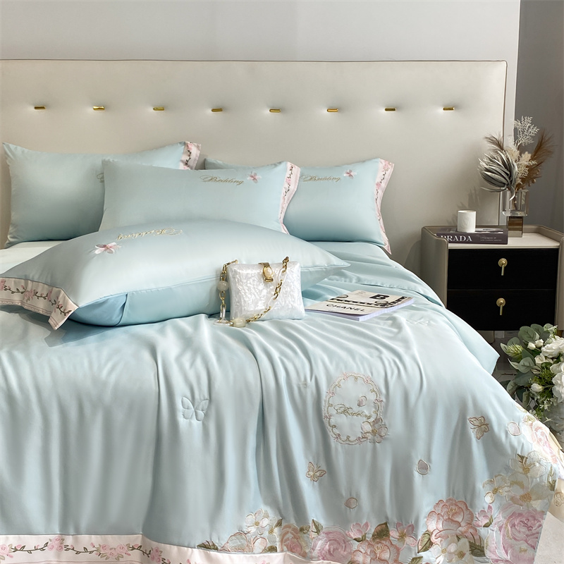 商品名称:2024新款燕窝蛋白刺绣A类雪莲天丝数码边夏被四件套 水蓝