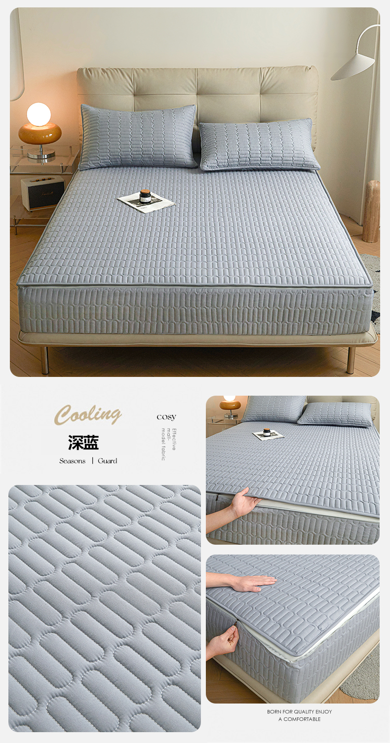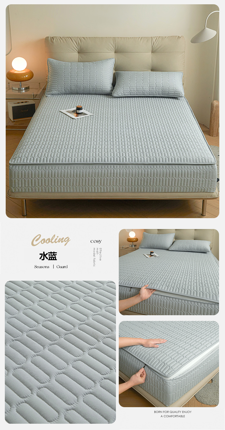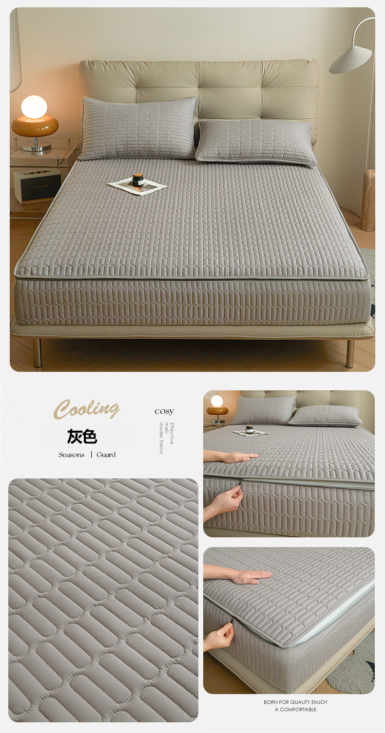 (总)糯米猪家纺 2023新款亲肤棉六面全包夹棉床笠--时尚格,水蓝,深蓝,灰色,白色,米色,粉玉