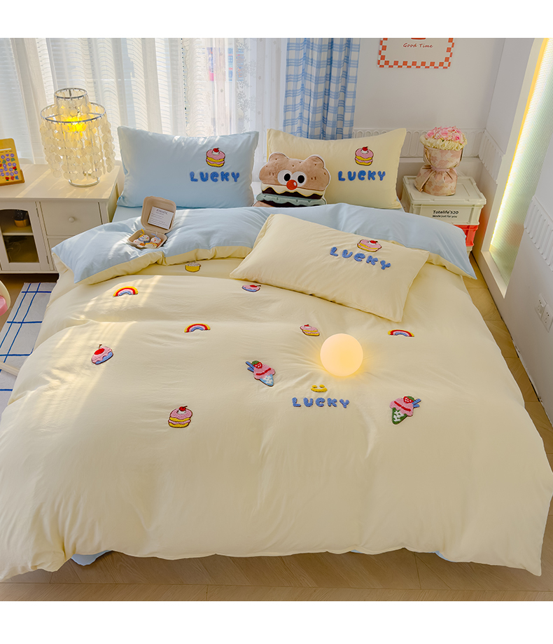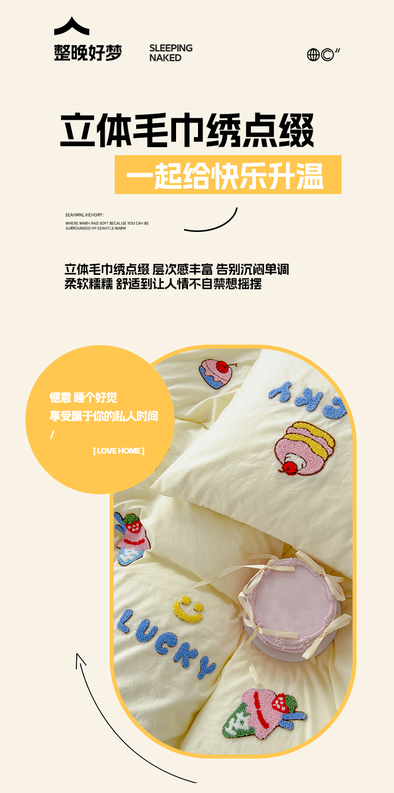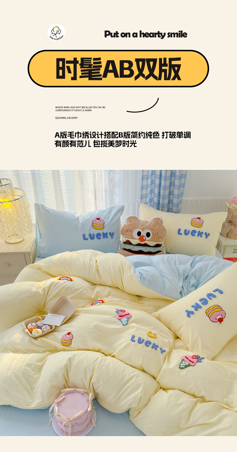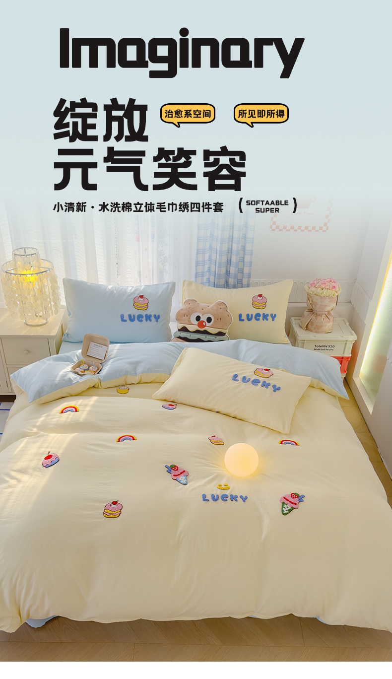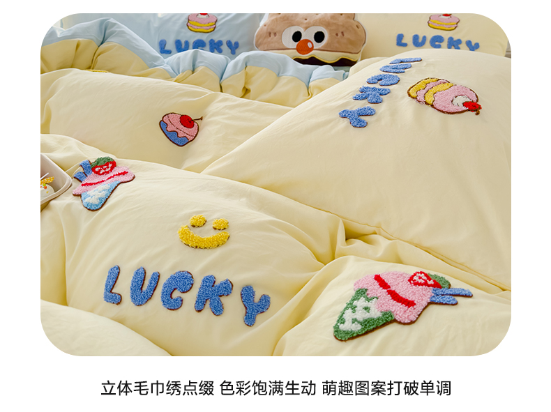 当前位置: 91家纺网 > 商品网购 > 床品套件 > 四件套 > 水洗棉四件套 > 颜选 2024新款小清新水洗棉立体毛巾绣四件套-生日派对 生日派对+奶蓝