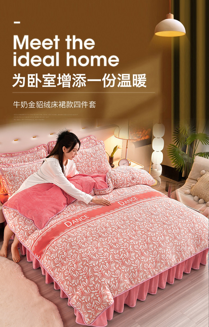 馨梦缘 2025新款小包边款牛奶绒8.5斤高克重牛奶绒金雕绒床裙款四件套 红粉佳人