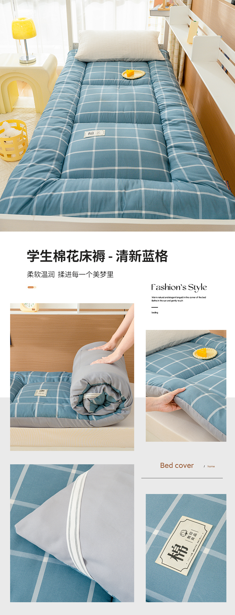 商品名称:蓝冰家纺 2024新款水洗棉学生棉花床垫床褥 细蓝格