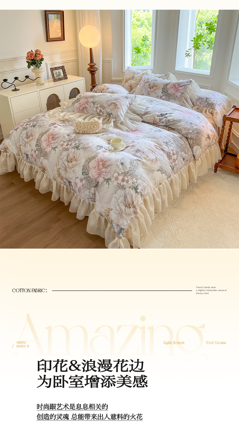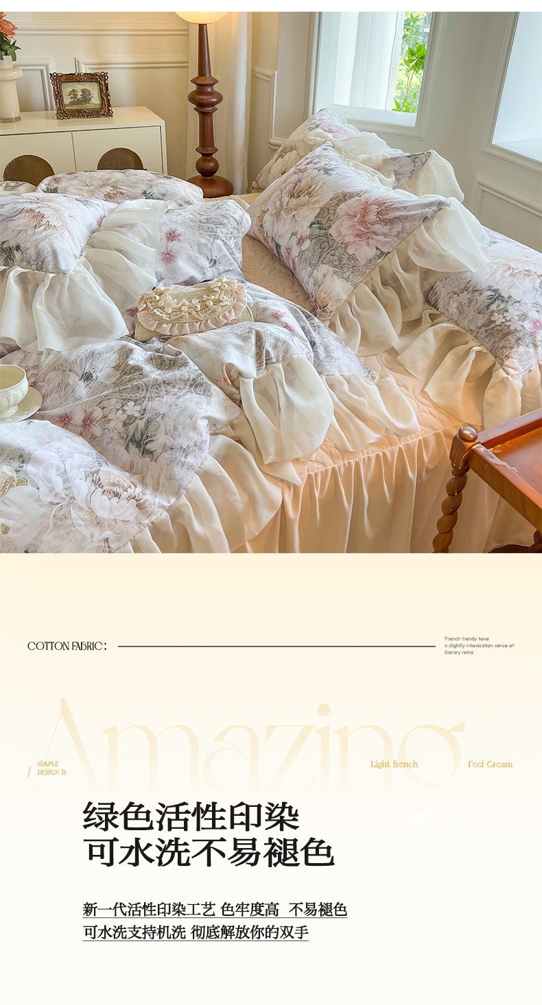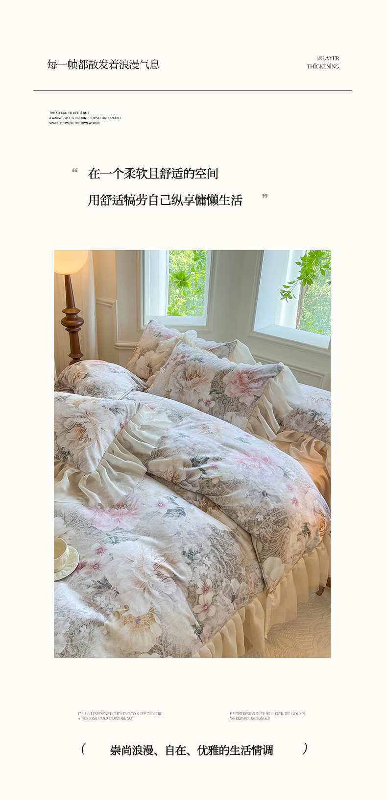 (总)网红馆(ck家纺) 2025新款全棉磨毛印花床裙款复古法式优雅四件套,花舞漫天-粉,玫瑰趣事-粉,玫瑰趣事-灰,梦语-桔