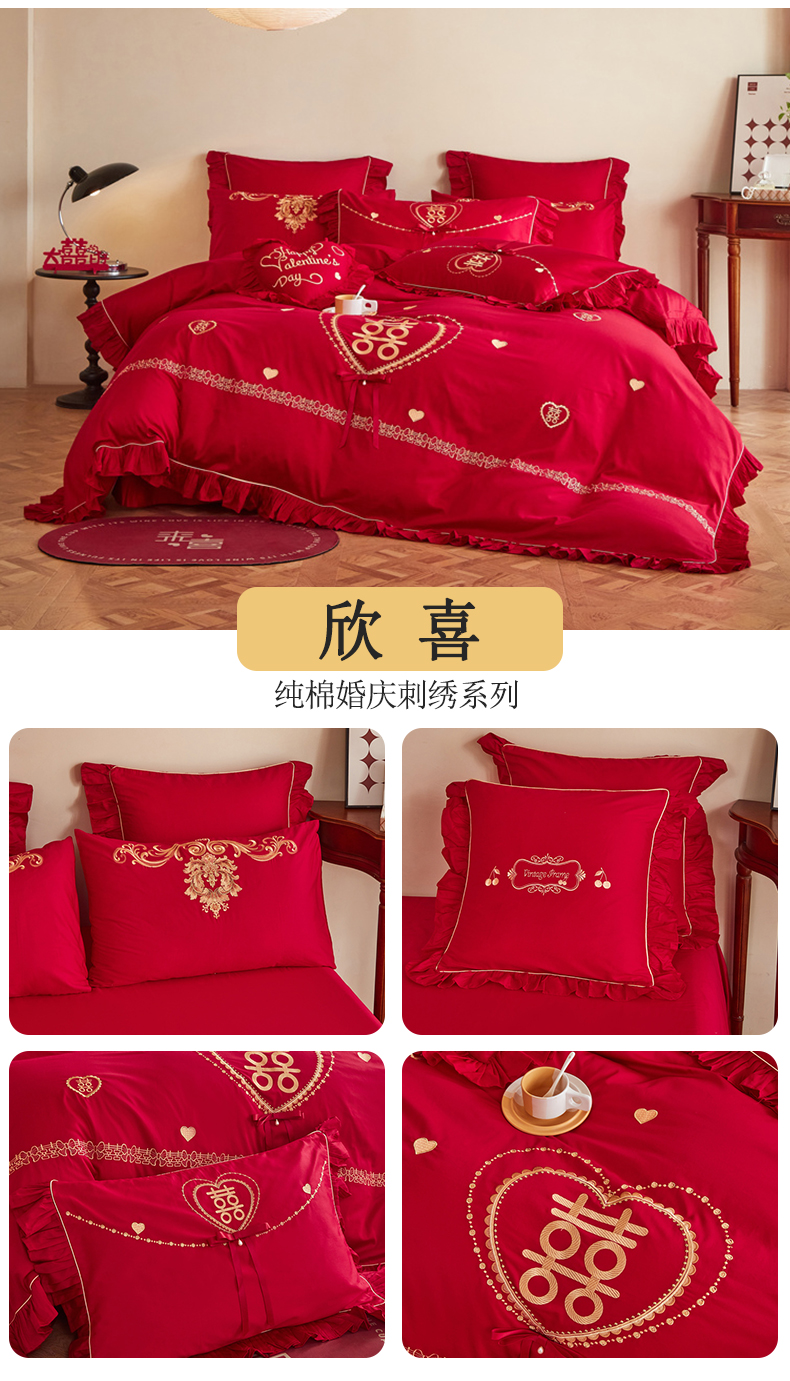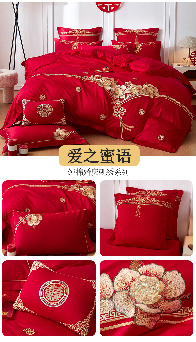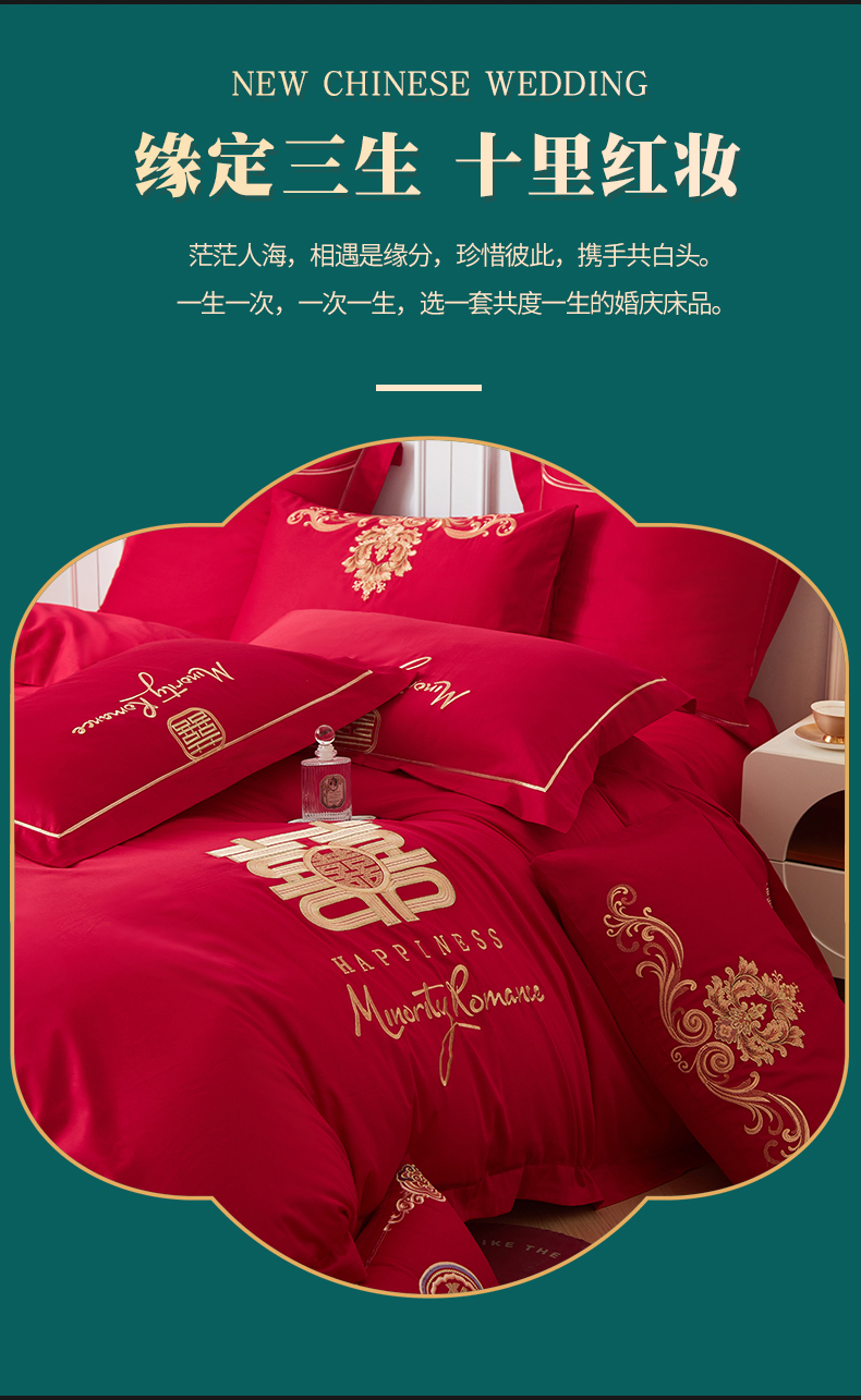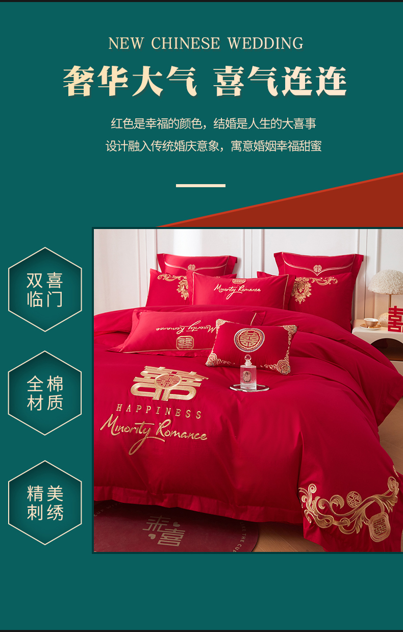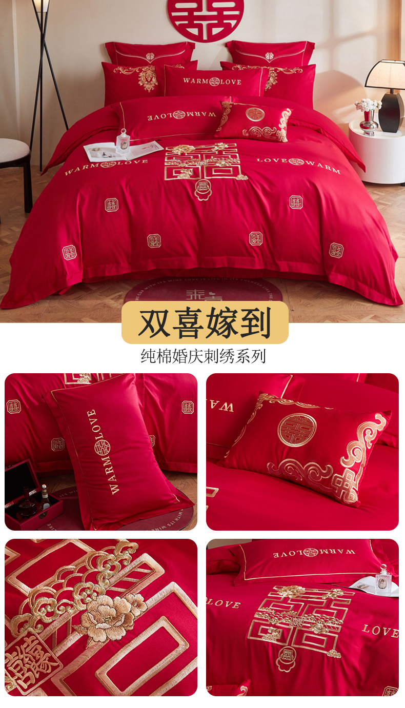 当前位置: 91家纺网 > 商品网购 > 床品套件 > 四件套 > 婚庆四件套 > 宏羽纺家纺 2024新款13372纯棉小红书跑量款婚庆套件系列 喜事登门