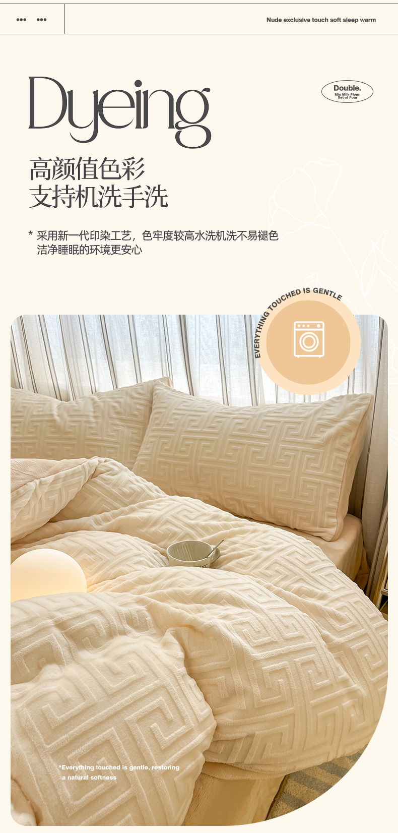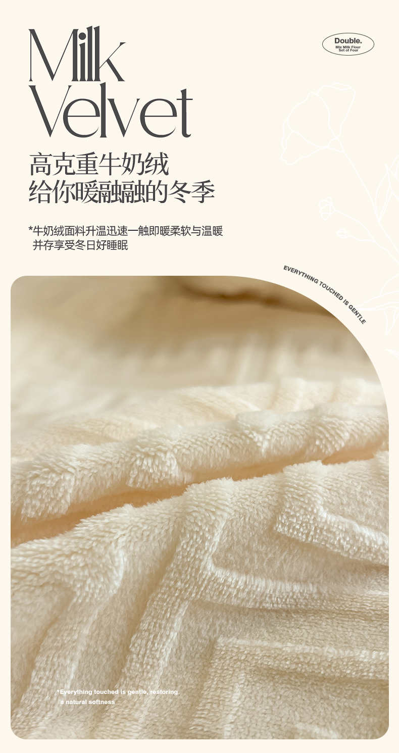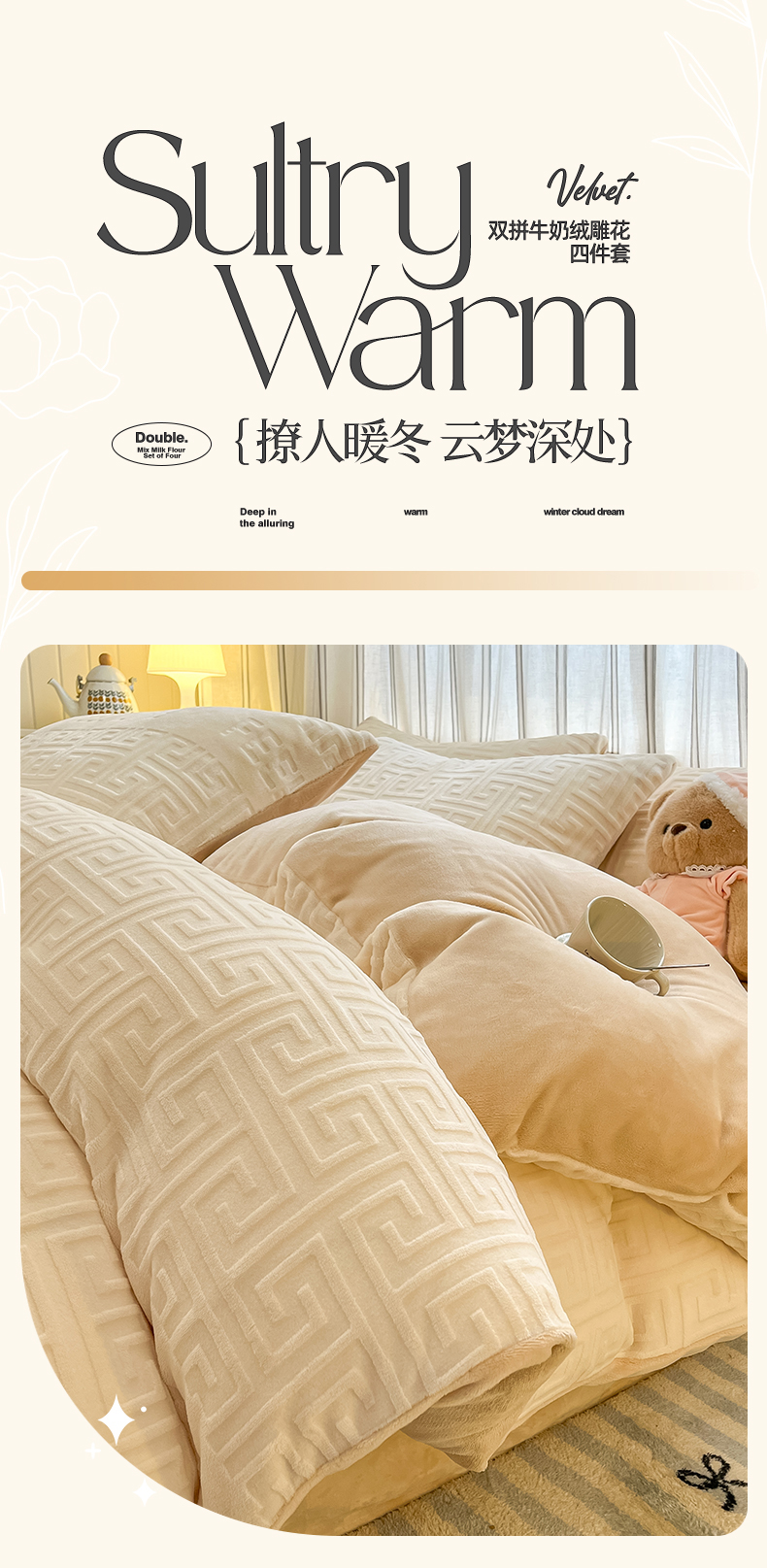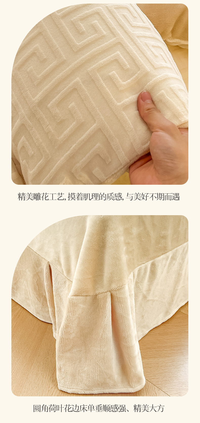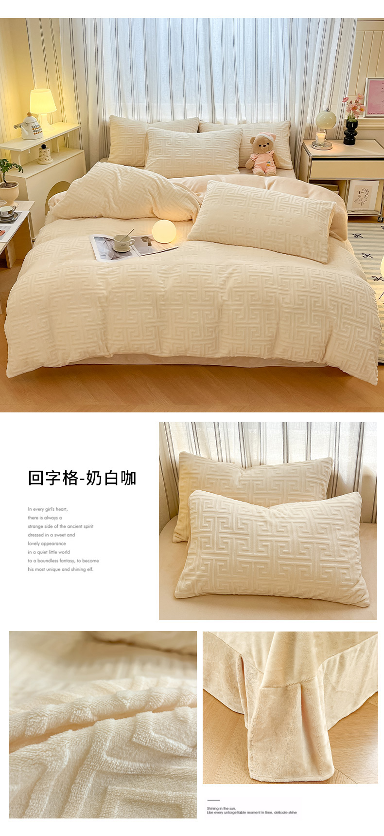 商品名称:绘萱家居 2025新款高克重雕花雕印纯色牛奶绒四件套双拼法莱绒珊瑚绒 回字格-奶白咖