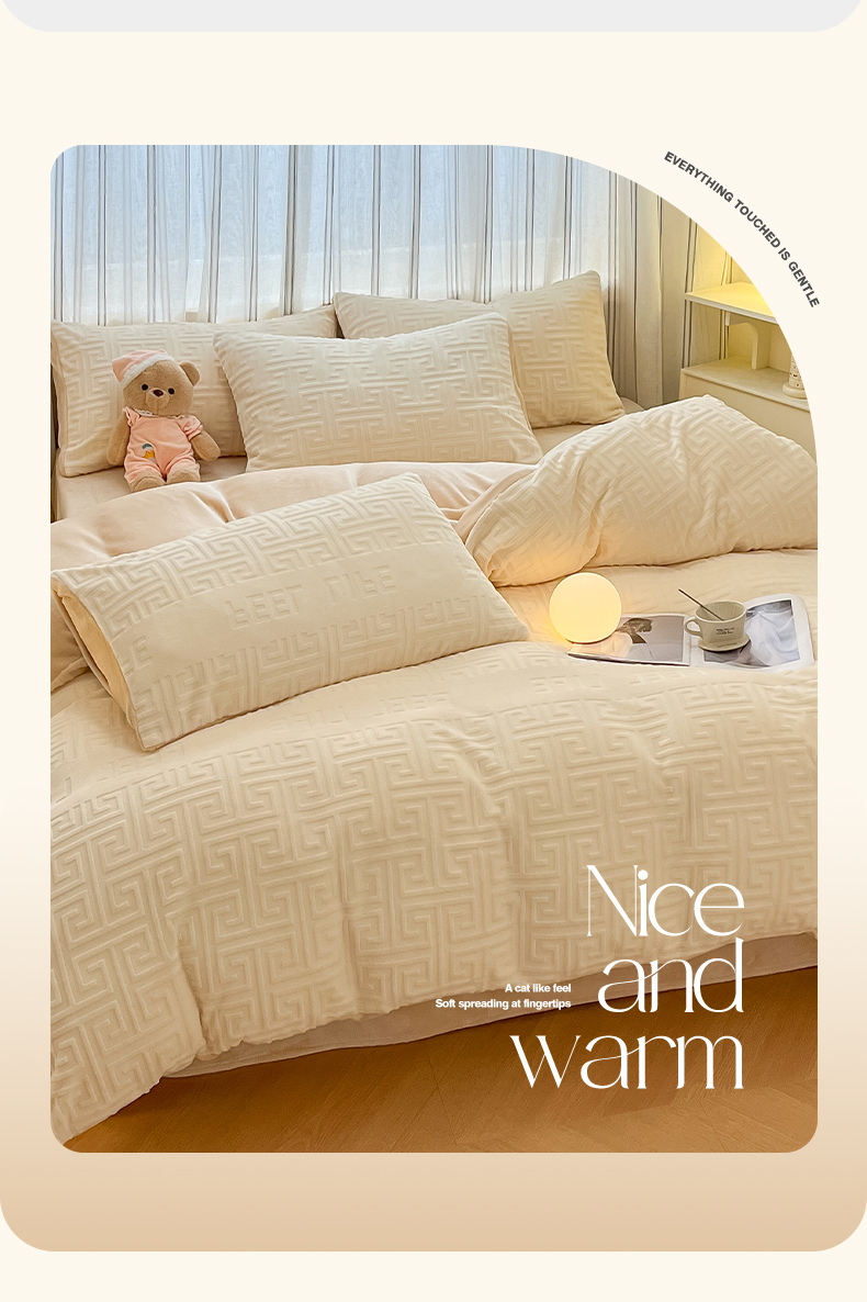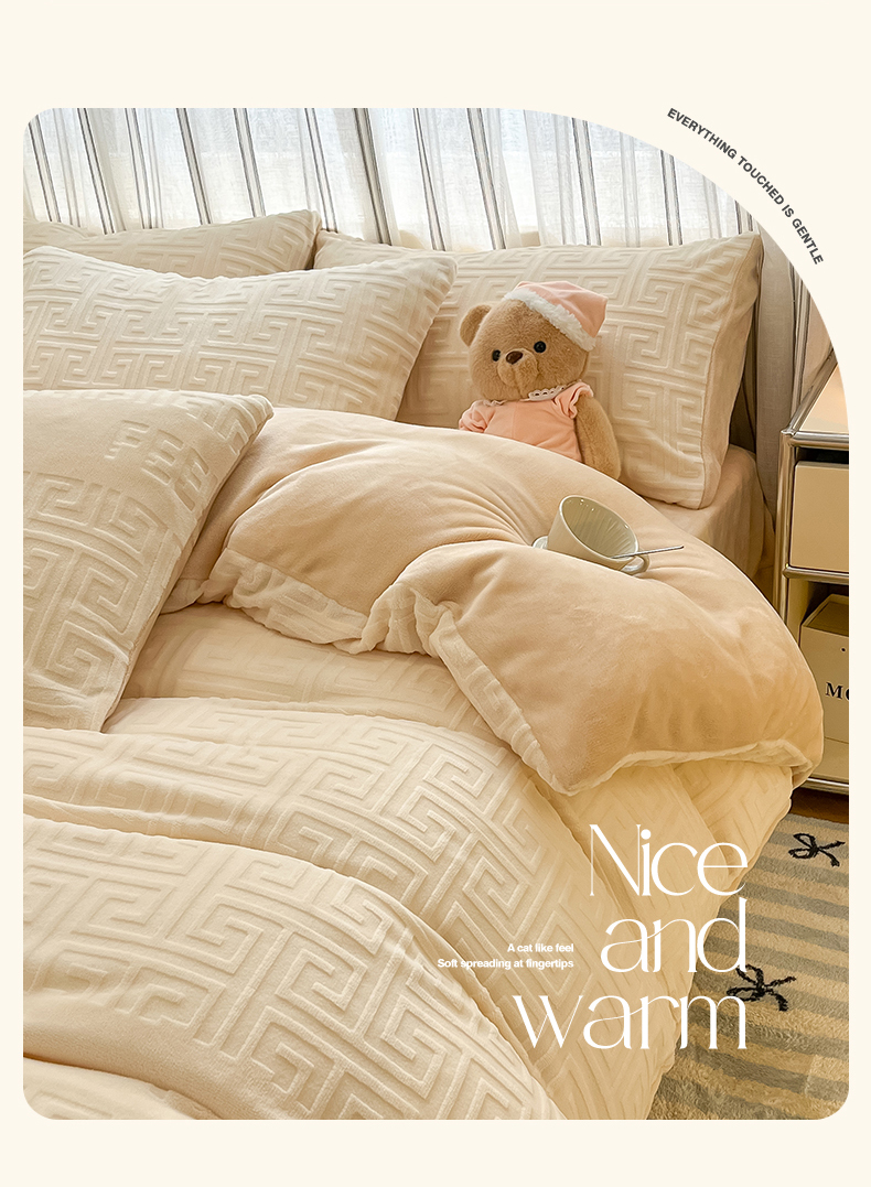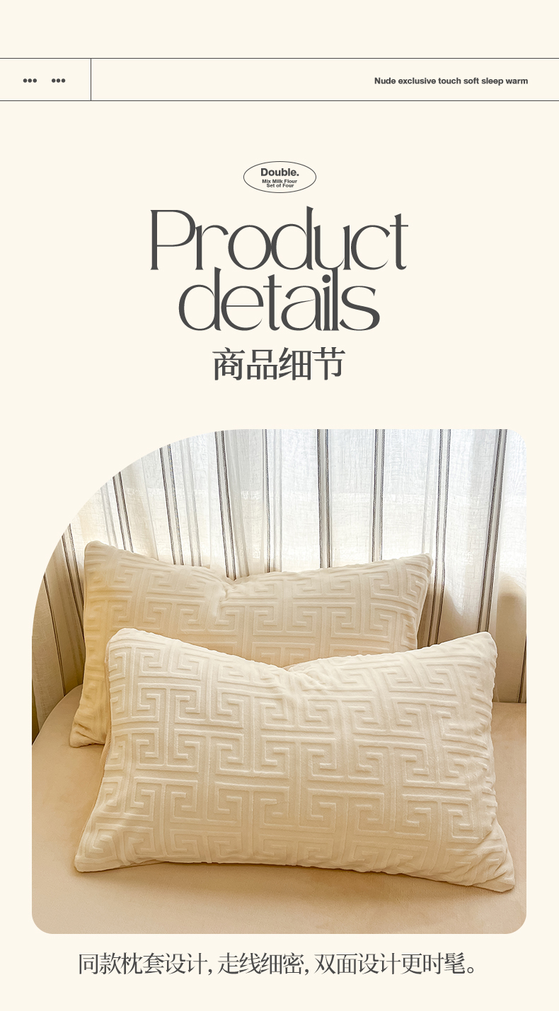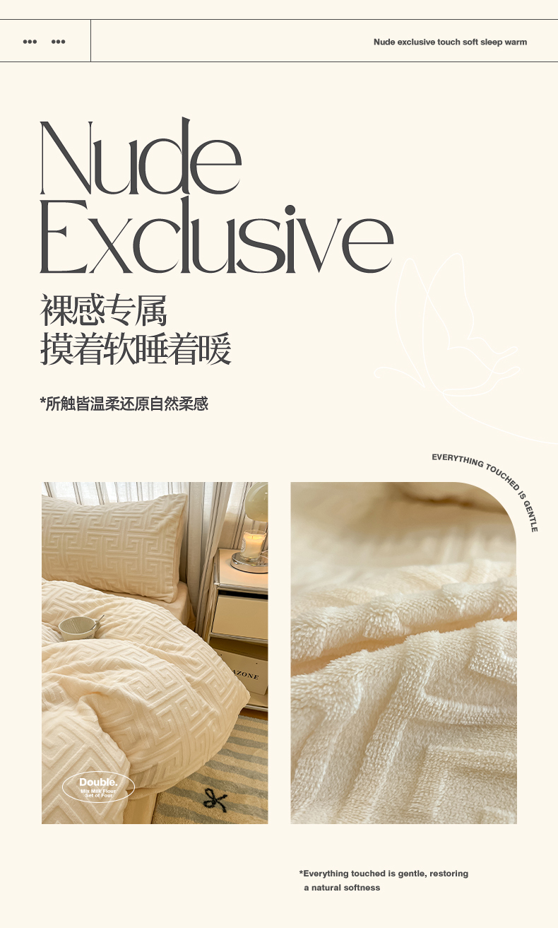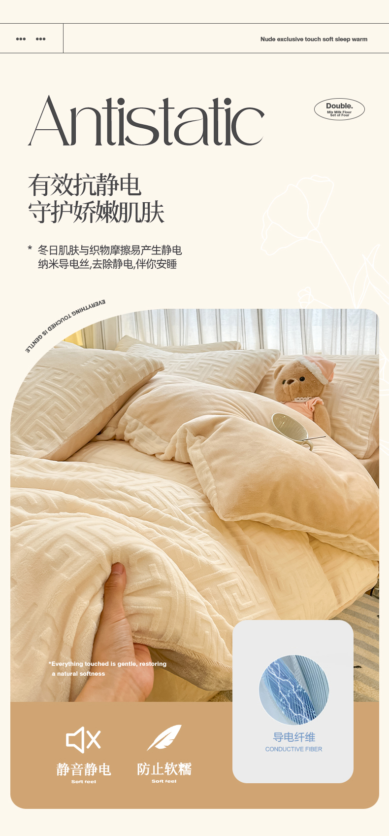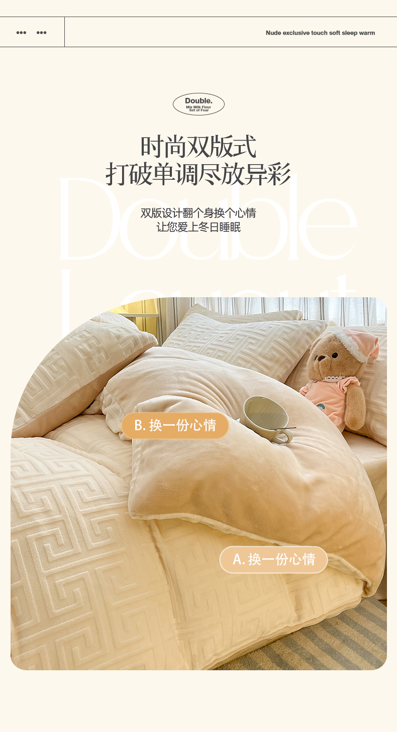 商品名称:绘萱家居 2025新款高克重雕花雕印纯色牛奶绒四件套双拼法莱绒珊瑚绒 回字格-奶白咖