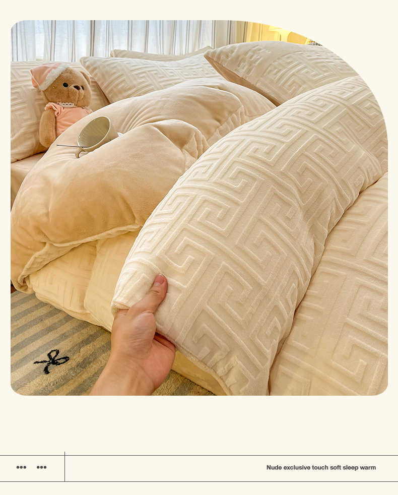绘萱家居 2025新款高克重雕花雕印纯色牛奶绒四件套双拼法莱绒珊瑚绒 回字格-奶白咖