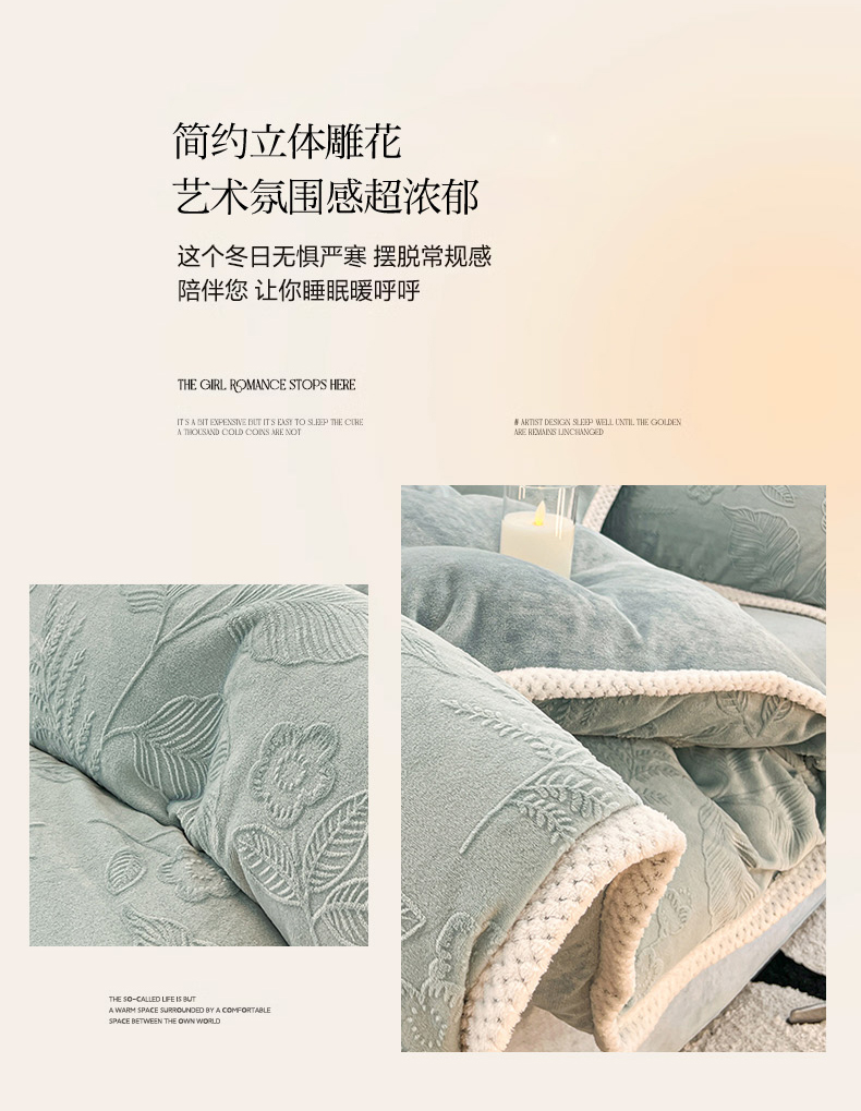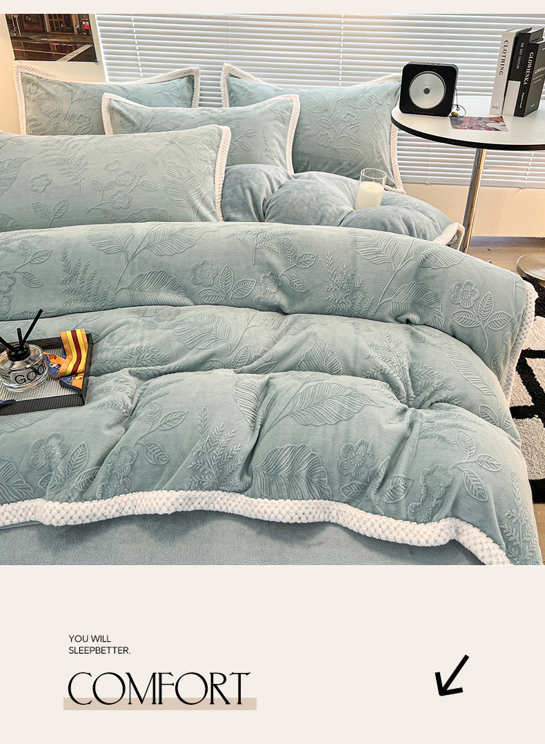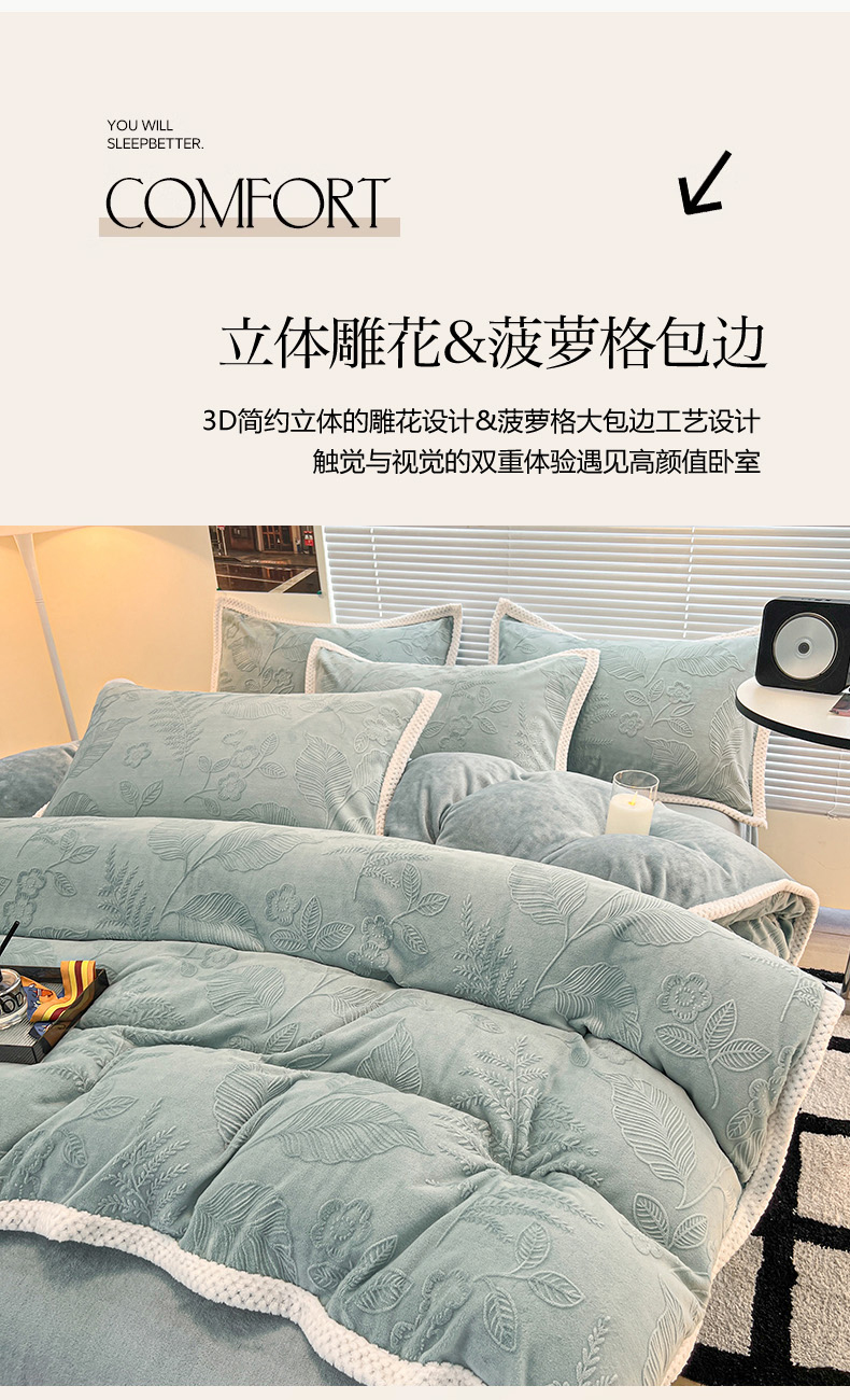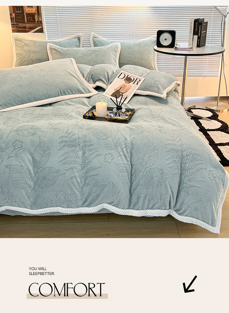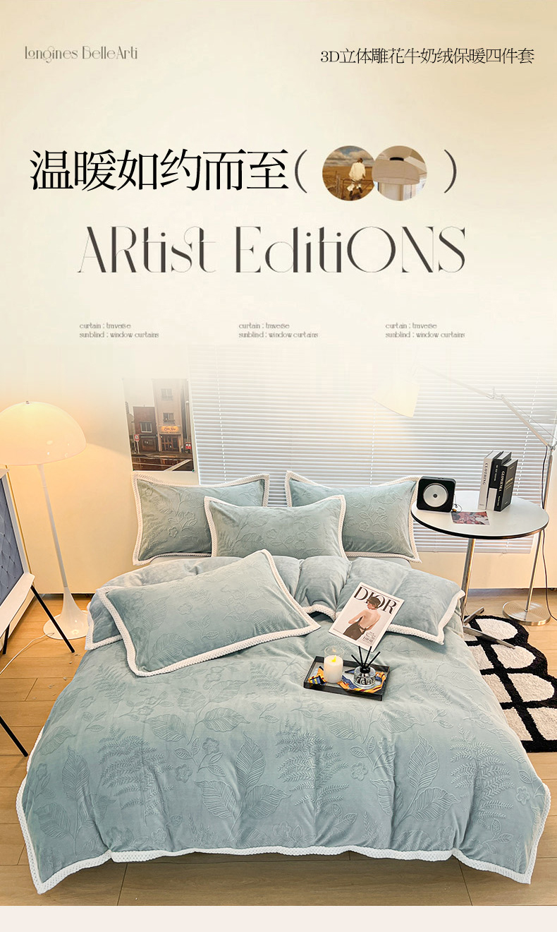 当前位置: 91家纺网 > 商品网购 > 床品套件 > 四件套 > 牛奶绒四件套 > 2024新款A类高克重3D立体雕花牛奶绒保暖系列套件单品-四件套 花雕蓝